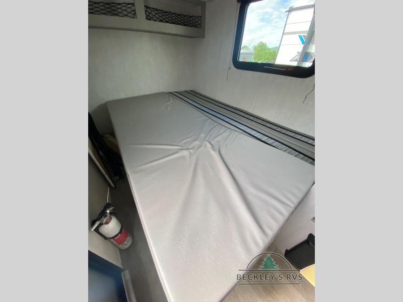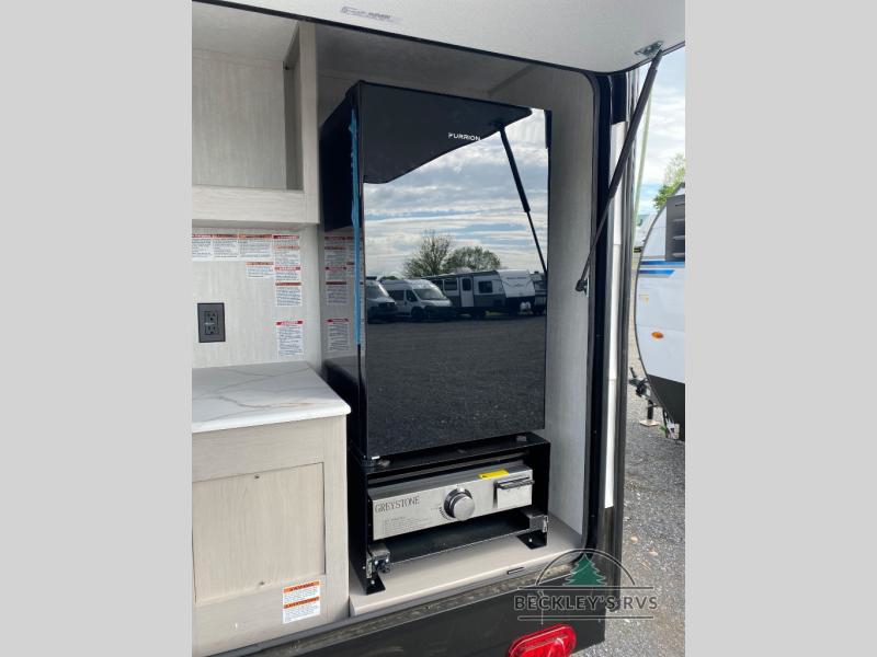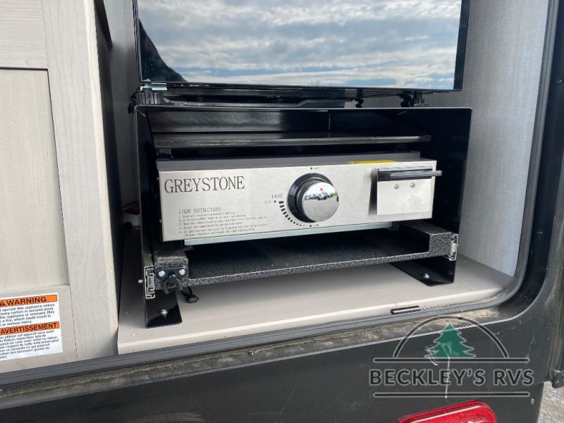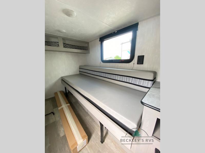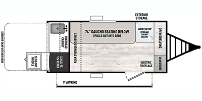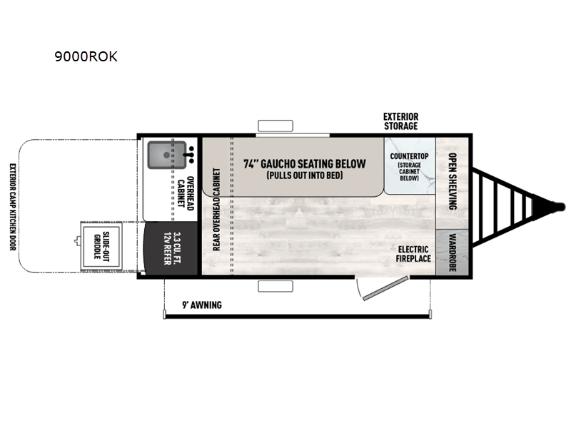 This travel trailer features your basic off-road adventure needs by providing you a 74" gaucho seating that pulls out into a bed at night. There is open shelving along the front wall for your things, plus a wardrobe for clothing. A rear overhead cabinet offers more space to store your gear, and the rear hatch provides a place for you to create meals and snacks while you explore. There is a slide-out griddle, a 3.3 cu. ft. 12-volt refrigerator for your cold items, and a single sink and overhead cabinet. There is also a 9' bag awning for added outdoor living, plus additional storage. You can also add an optional roof-top tent for additional sleeping.