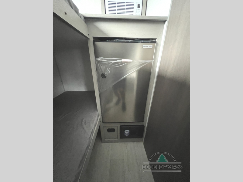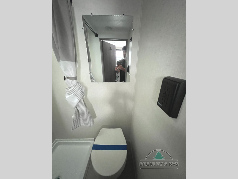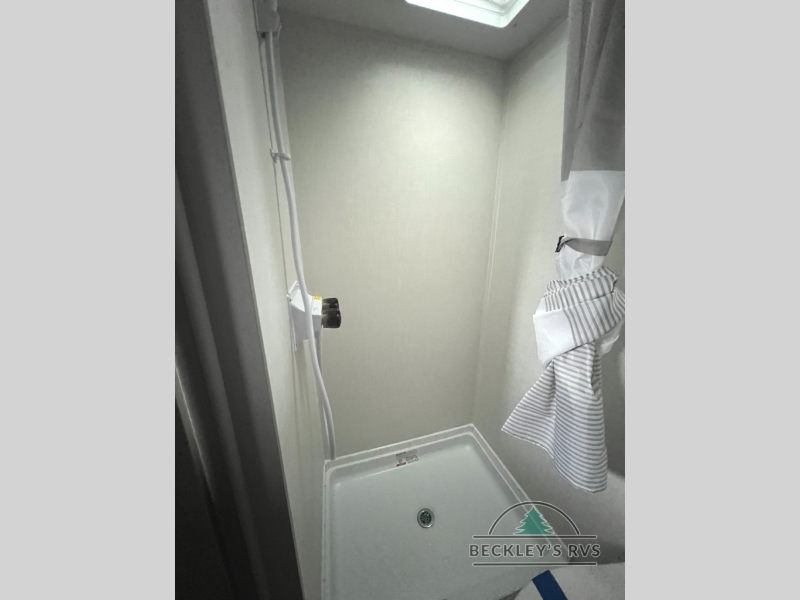Inside, you'll find a well-equipped kitchen with a GE appliance package, seamless countertops, and thoughtful touches like a sink cup rinser and overhead storage. The bathroom features a 24" x 40" shower, power vent fan, and a foot-flush toilet, offering home-like comfort on the go.