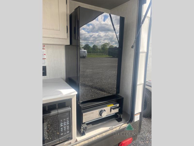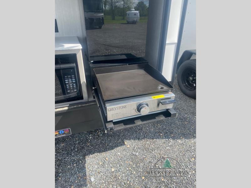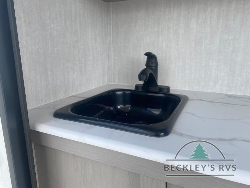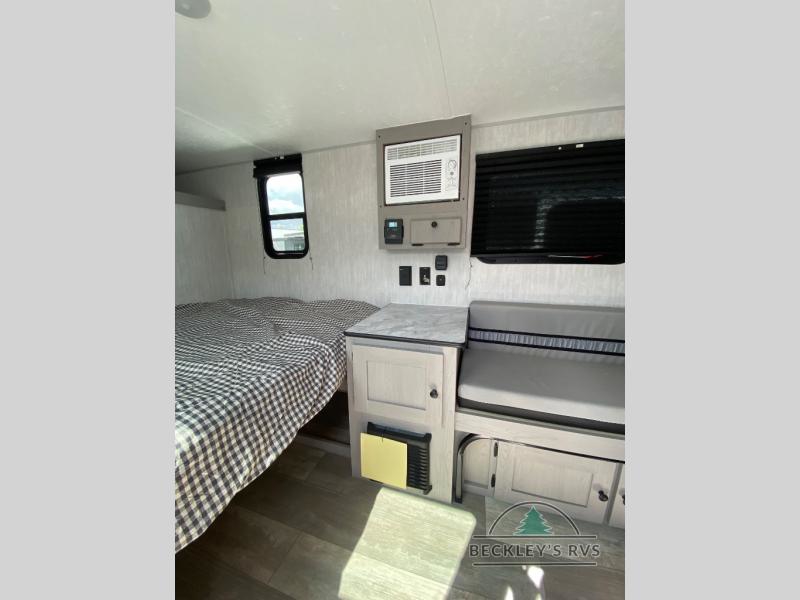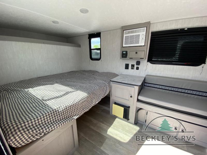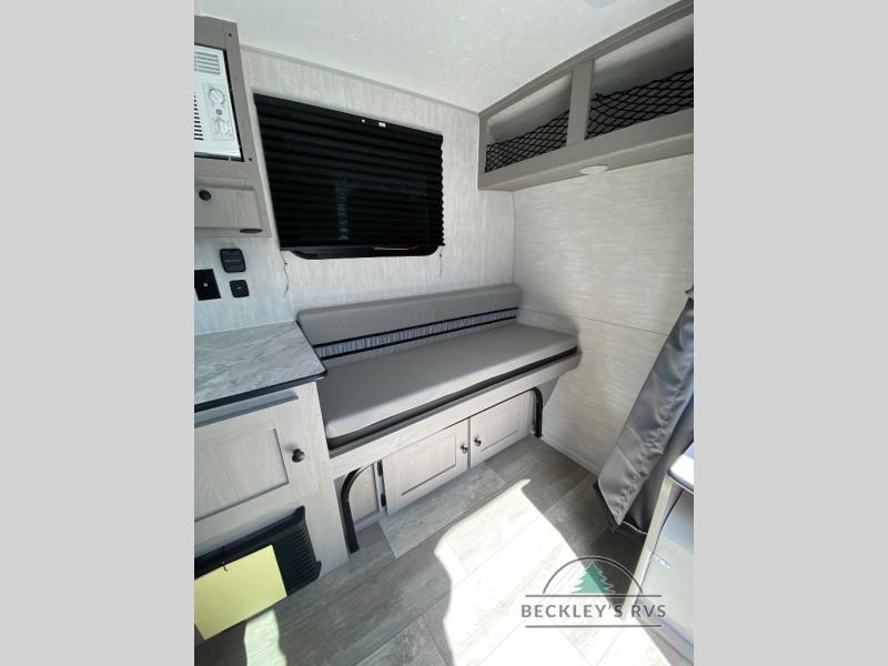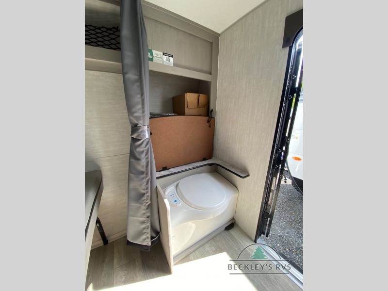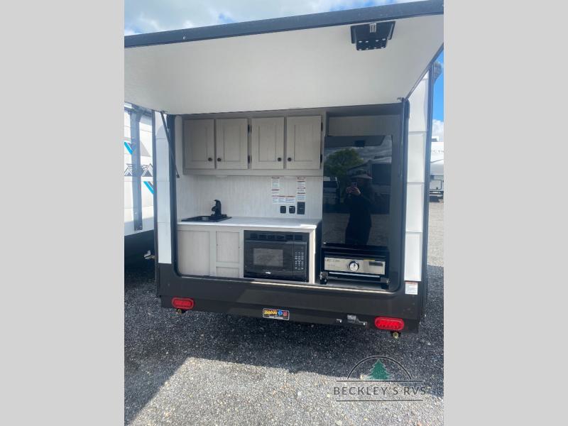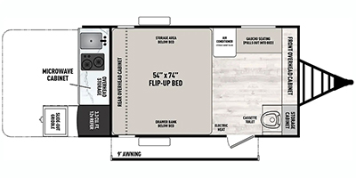 When you want to explore choose this travel trailer for your basic off-road adventure needs and a bit more by offering you a 54" X 74" flip-up bed with storage beneath, and gaucho seating that pulls out into a bed for an additional camper at night. There is front and rear overhead cabinetry for storage, and a cassette toilet for added convenience especially at night. A rear hatch camp kitchen provides a place for you to create meals and snacks while you explore. There is a slide-out griddle and grill combo cooktop, a 3.3 cu. ft. 12-volt refrigerator for your cold items, a single sink, and two burner cooktop, plus a microwave oven. A 9' power awning creates a bit of added outdoor living space where you can set up your camp chairs. You can also add an optional roof-top tent for additional sleeping.