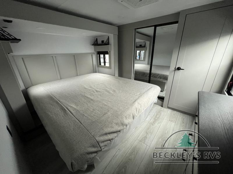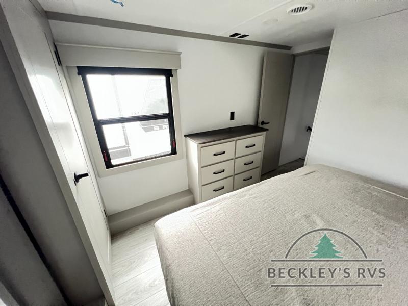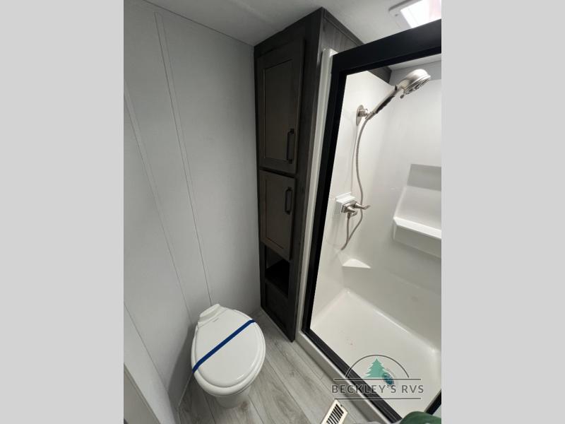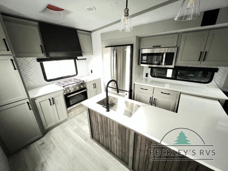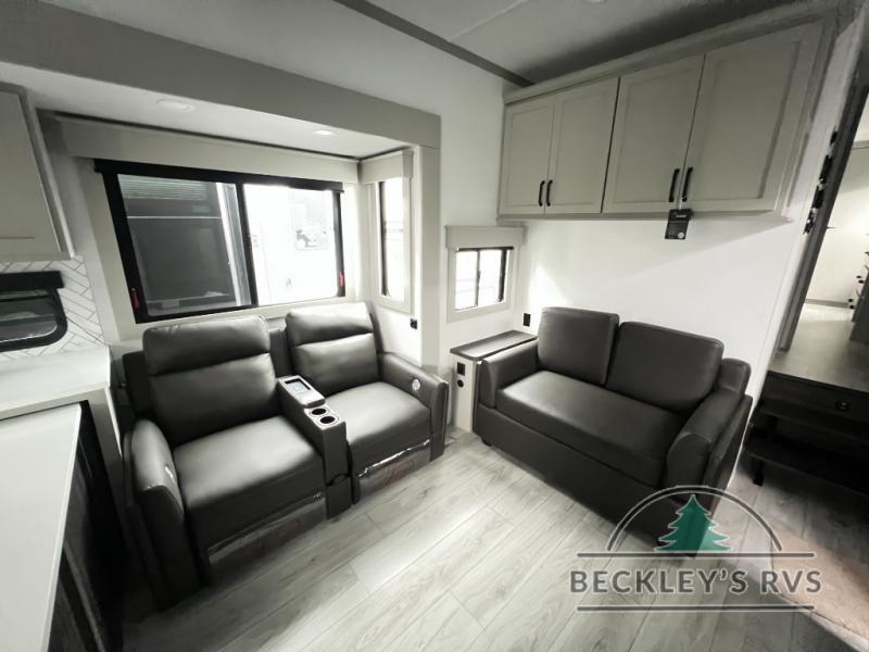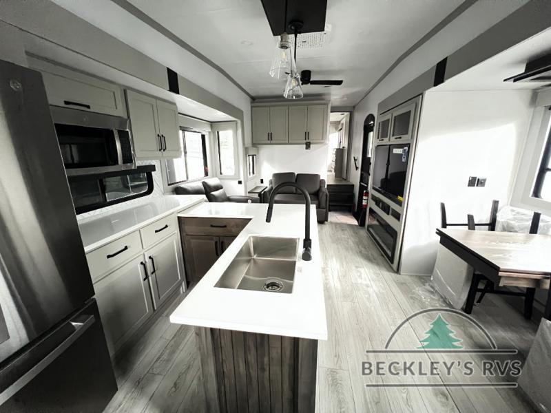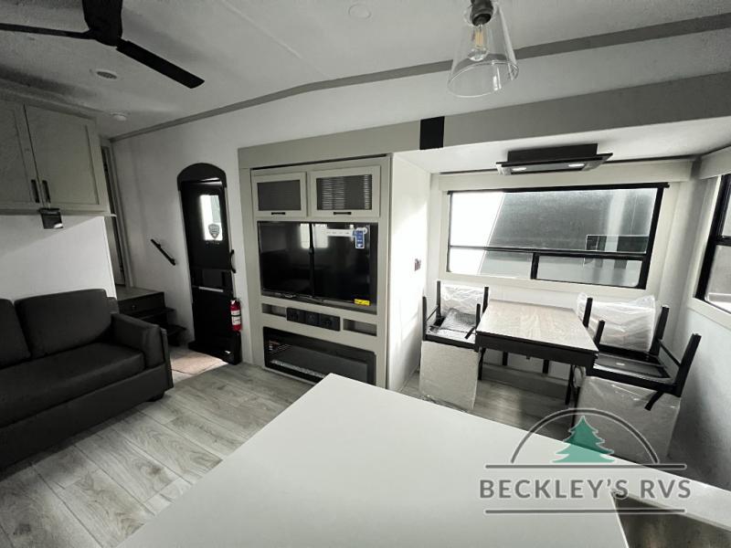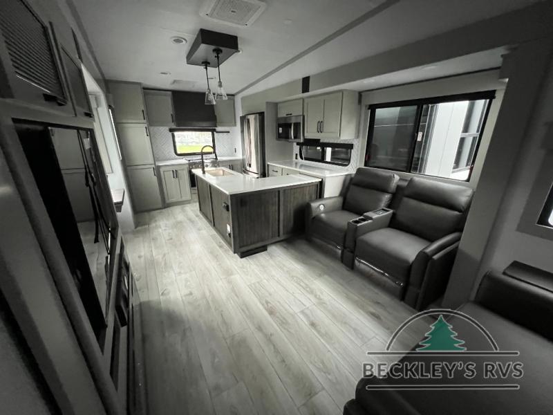 This rear kitchen fifth wheel features ample counter space, an L-shaped counter, plus a spacious pantry and residential refrigerator for food storage. Your crew can relax on the hide-a-bed sofa and power theater seating, or dine at the booth dinette. There is also an entertainment center and fireplace with a hidden pantry behind it for board games and movies. A full bath includes a shower with a seat for added comfort, and the front private bedroom with a king bed slide is sure to bring a great night's rest. You'll find a spacious wardrobe and a dresser to keep your clothes organized, plus washer and dryer prep if you want to add these appliances.