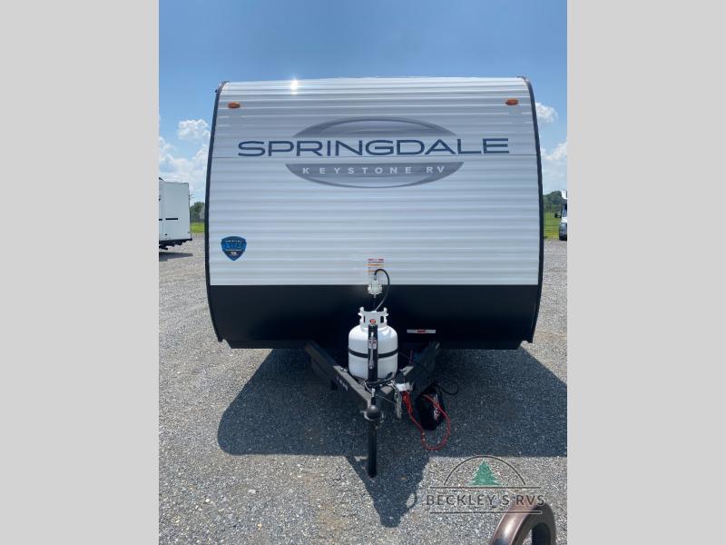 With any Springdale Classic Mini travel trailer by Keystone, you will enjoy lightweight towing thanks to their single-axle! You'll find the XL entry assist handle will make entering and exiting your unit easier than ever, and the power awning will provide protection from the sun as you relax in your camp chairs outside. Each model includes blackout night shades, solid wood cabinet doors and drawers, a shower skylight for more standing room, plus many more interior comforts. There is also a 5,000 BTU sidewall A/C and 20K BTU furnace to keep you comfortable, plus a Girard tankless water heater for endless hot showers!