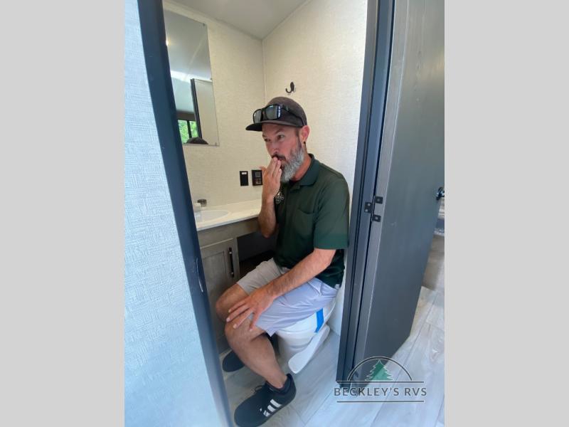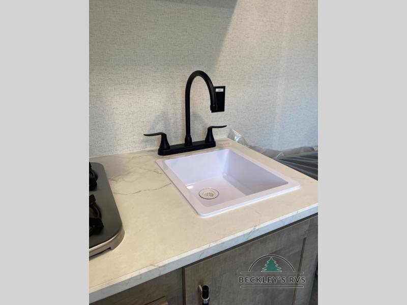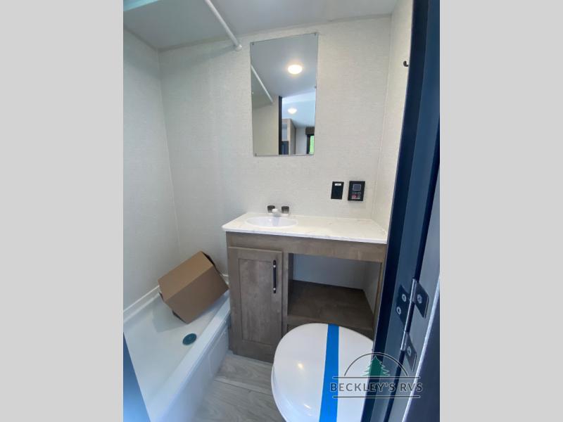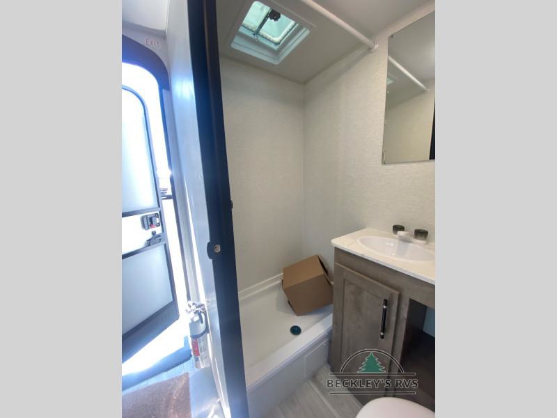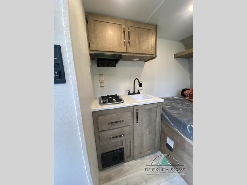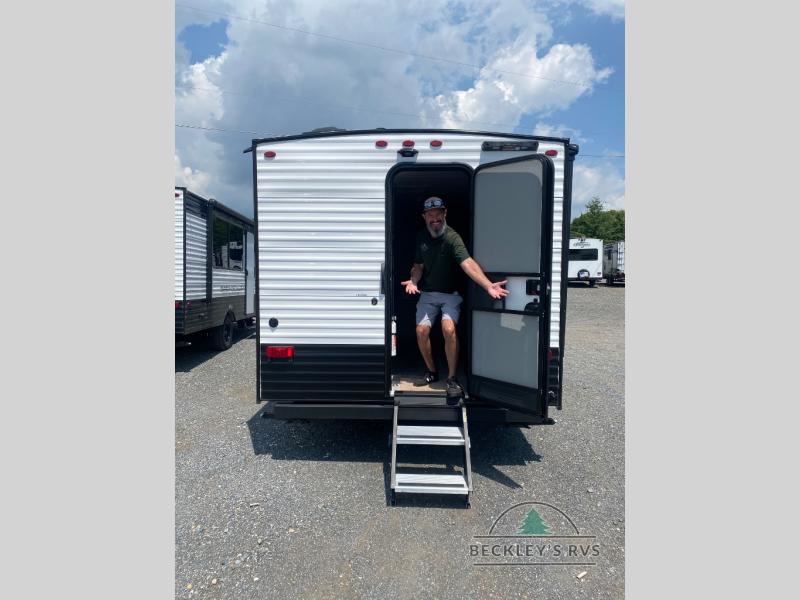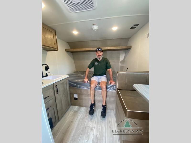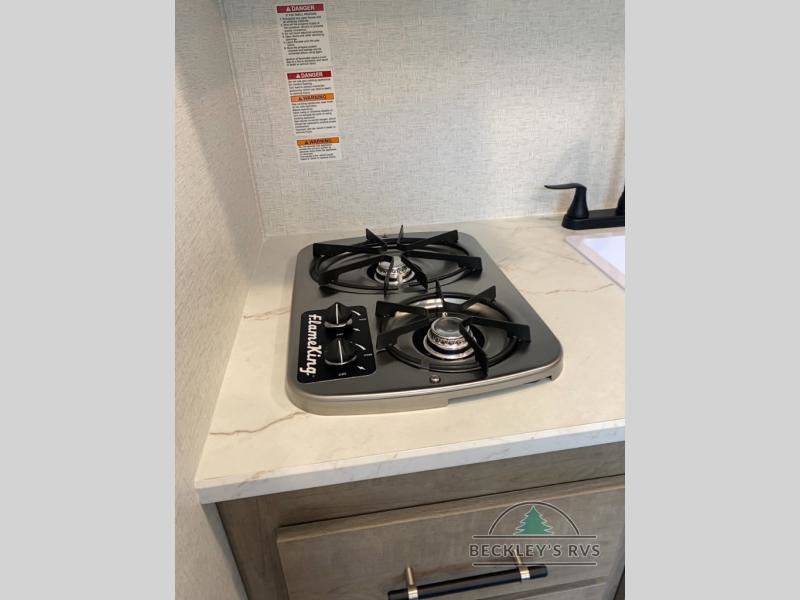 This is the perfect easy-to-tow travel trailer for three campers! The front queen bed includes a shelf above for books plus a closet and nightstand at the foot of the bed for even more storage. You can make meals each day on the two burner gas cooktop and store food in the 3.3 cu. ft. 12V refrigerator. A full bath onboard means you won't have to use the camp's facilities, and the exterior pass-thru storage will be perfect for hiking gear, camp chairs, and more!