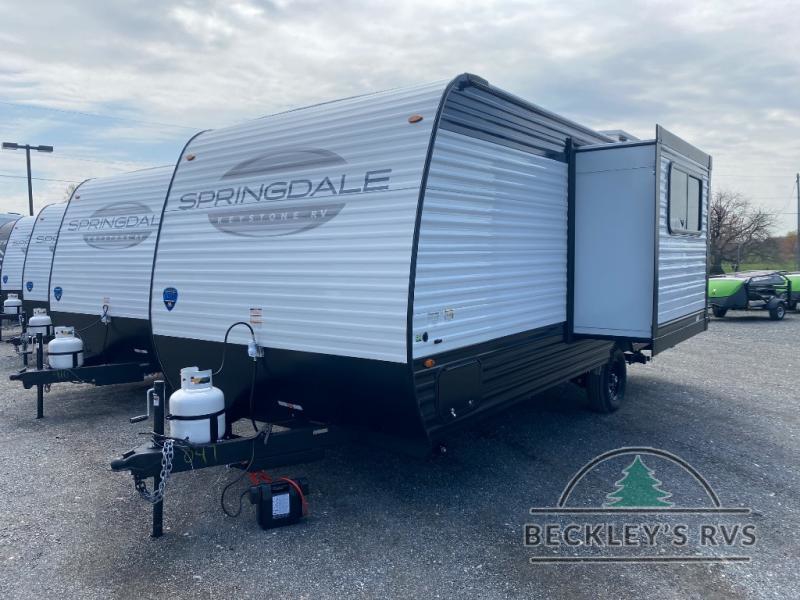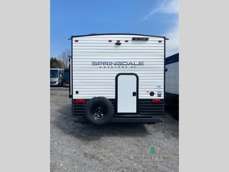 With any Springdale Classic Mini travel trailer by Keystone, you will enjoy lightweight towing thanks to their single-axle! You'll find the XL entry assist handle will make entering and exiting your unit easier than ever, and the power awning will provide protection from the sun as you relax in your camp chairs outside. Each model includes blackout night shades, solid wood cabinet doors and drawers, a shower skylight for more standing room, plus many more interior comforts. There is also a 5,000 BTU sidewall A/C and 20K BTU furnace to keep you comfortable, plus a Girard tankless water heater for endless hot showers!