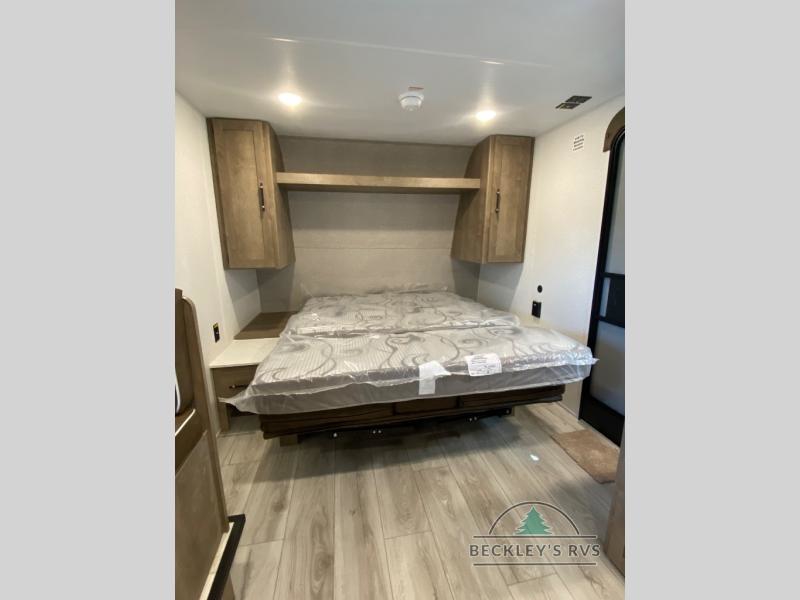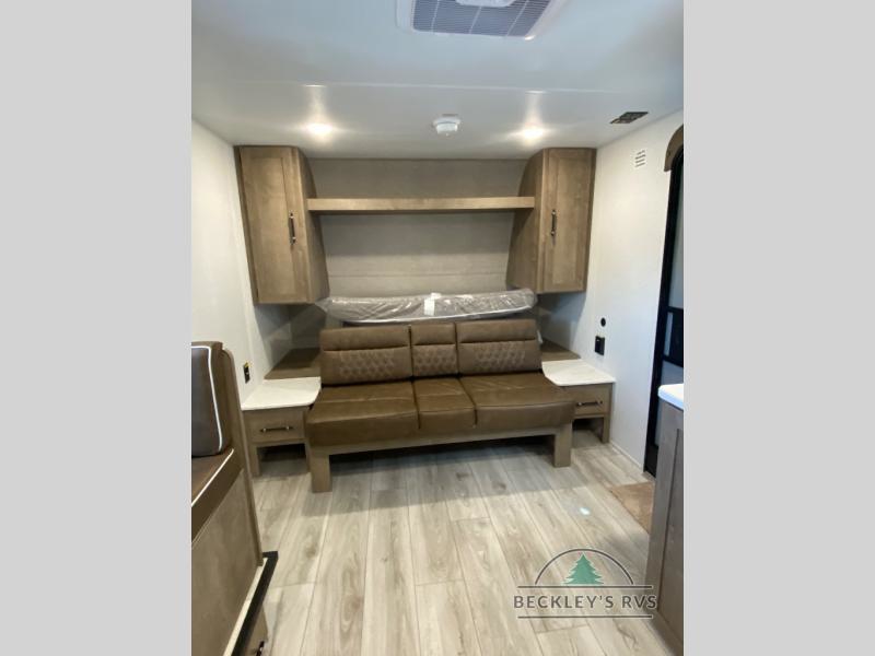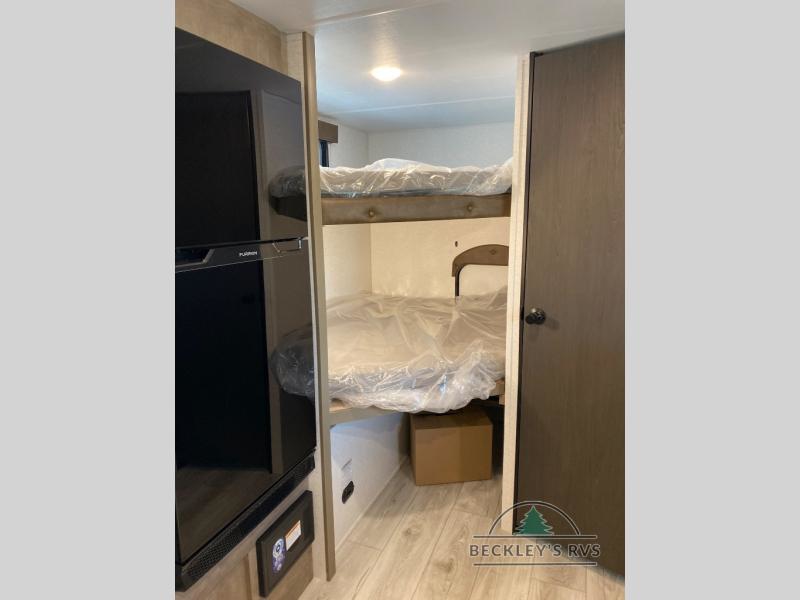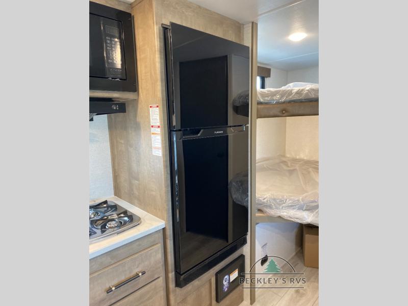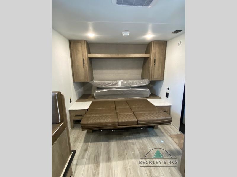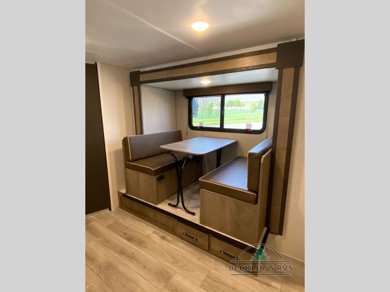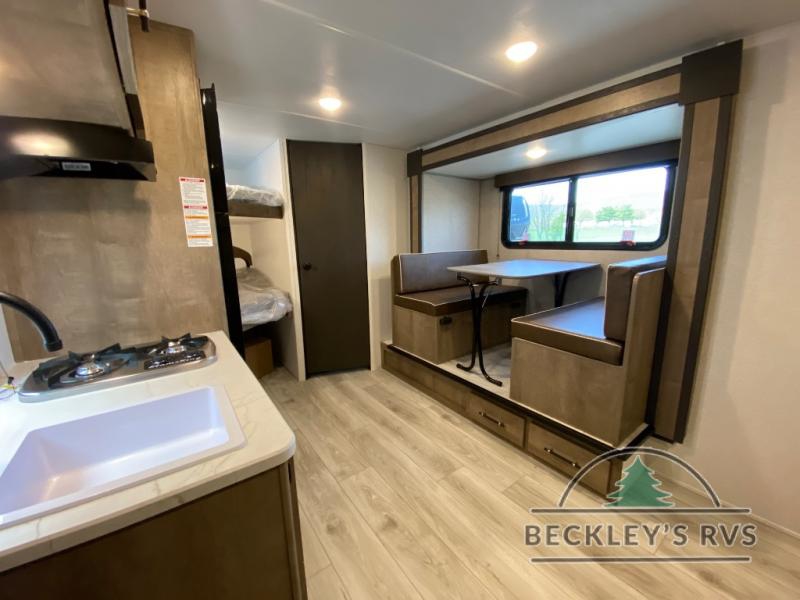 This cute Springdale Classic Mini bunk model will easily sleep seven with the double-size bunks, booth dinette slide, and queen Murphy bed which features a fold-down sofa at the end. During the daytime, you can have the seating you need and want, and at night the sofa folds to become part of the front bed. The rear corner bath is convenient and features a tub/shower, toilet, and sink. The kitchen is fully equipped to allow you to cook as you travel. Enjoy them while under the 15' power awning. A handy pass-thru storage compartment up front offers ample space for camp equipment, and there is additional storage accessible beneath the bunk in back.