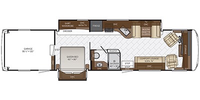 The Newmar Canyon Star Class A diesel toy hauler has room for plenty of toys! The 10' garage with rear ramp access is designed for ATV & normal clearance motorcycles, and can also be accessed by a side entrance door. You can organize your toys with the tie-down tracks and you won't have to worry about scuffs with the diamond tread rubber flooring. The living area has a comfort lounge sofa and a booth dinette which can both be converted to sleeping space, and the full-wall slide here will open up your whole coach. You'll sleep comfortably in the private bedroom which has a queen bed, wardrobe with a dresser, and an overhead console with a TV.