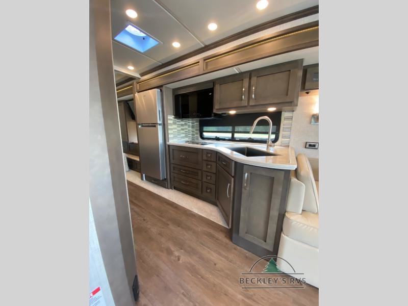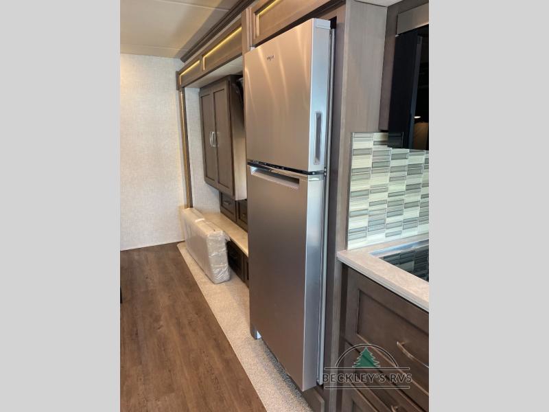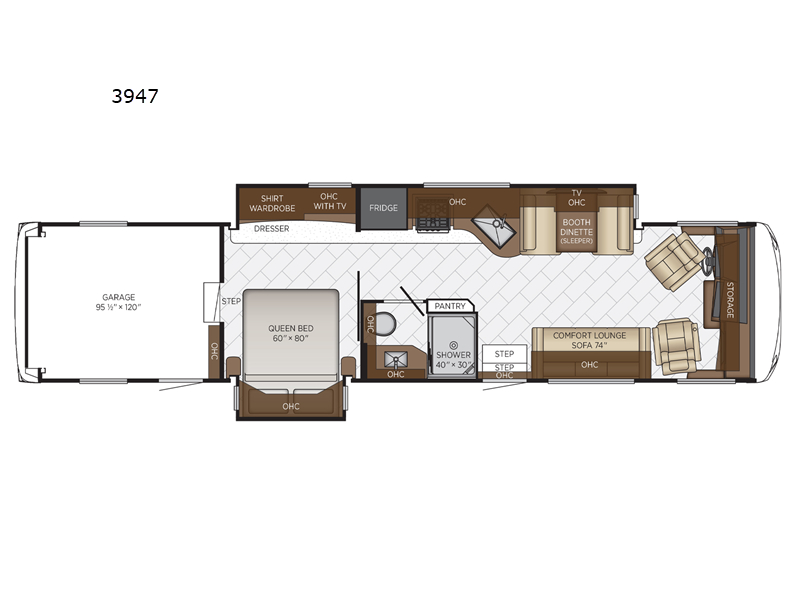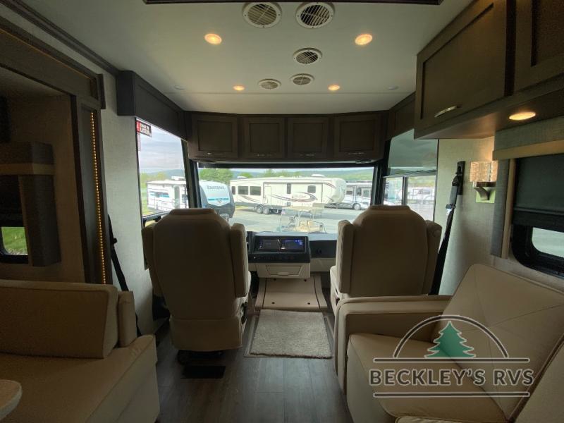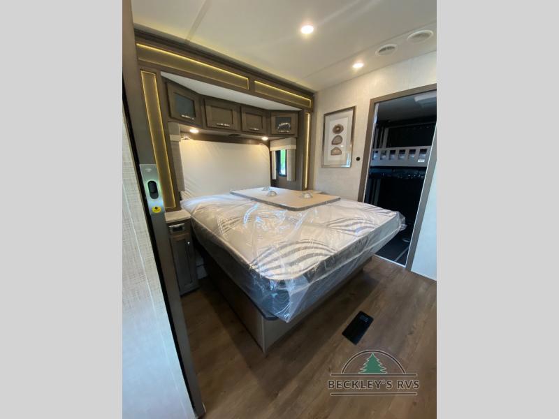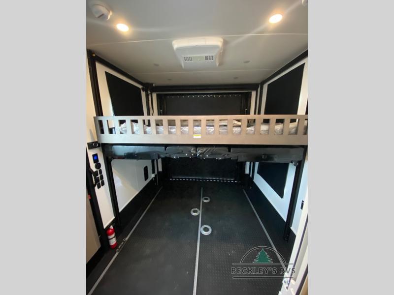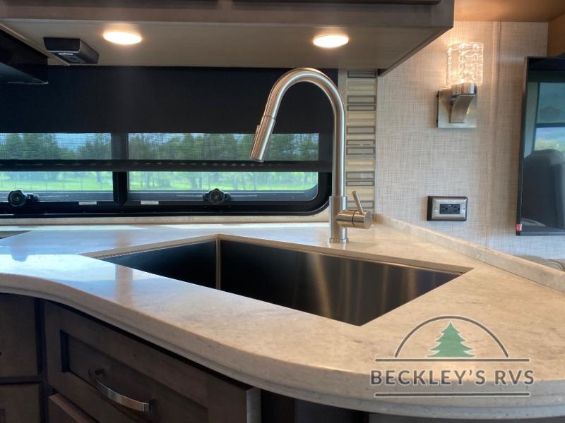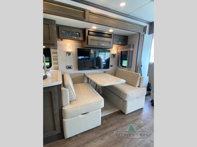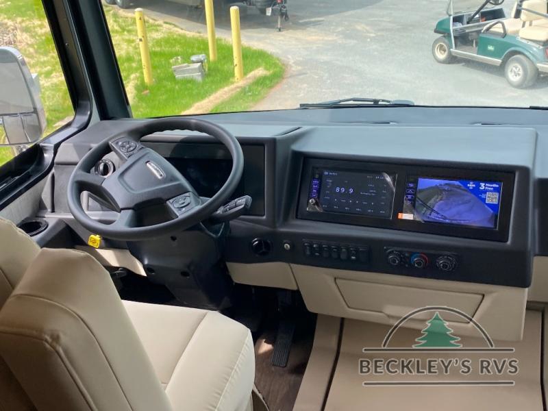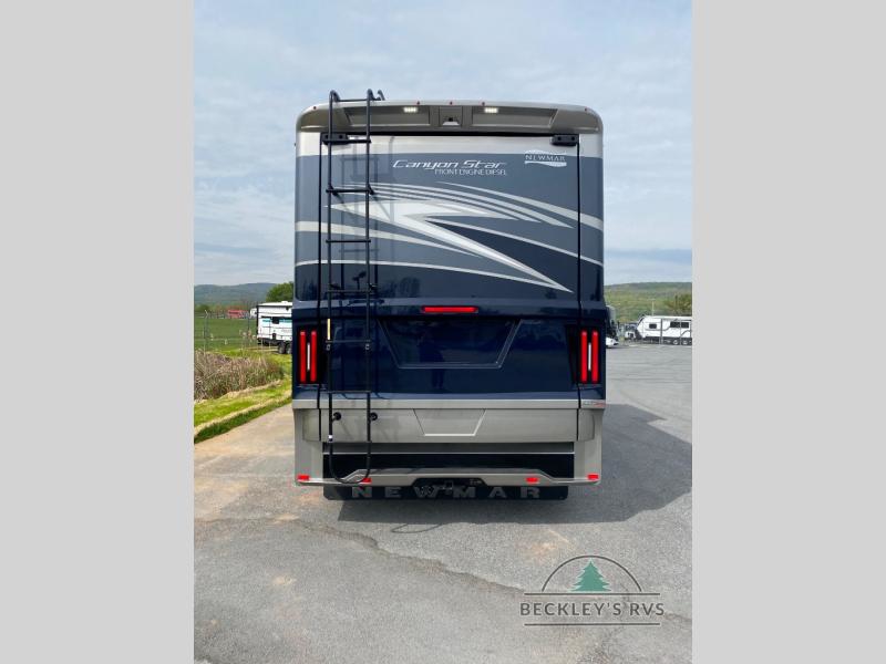 With any Canyon Star Class A diesel toy hauler motorhome by Newmar, you will enjoy a Freightliner front engine diesel chassis with 340HP to power your trips. The garage has so many features that will make your trip easier, like a fueling station, ramp door, assist handle, and even prep for an optional washer/dryer. There's also a rear hitch for towing your car. In the garage you can also add optional electric lift bunk beds or a pedestal table with seating if you need extra room for guests. Keep everything going with the four 12 volt house batteries, 1200 watt pure sine inverter, and a 10 watt solar panel to charge it all. There's also an 8 kW Cummins Onan Quiet Series Generator for your power needs. You'll appreciate the on demand water system, and you'll be extra comfortable with the propane gas furnace with ducted heat plus dash heater and air conditioner.