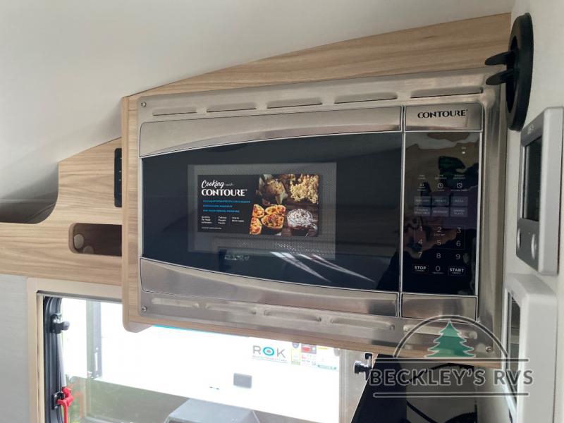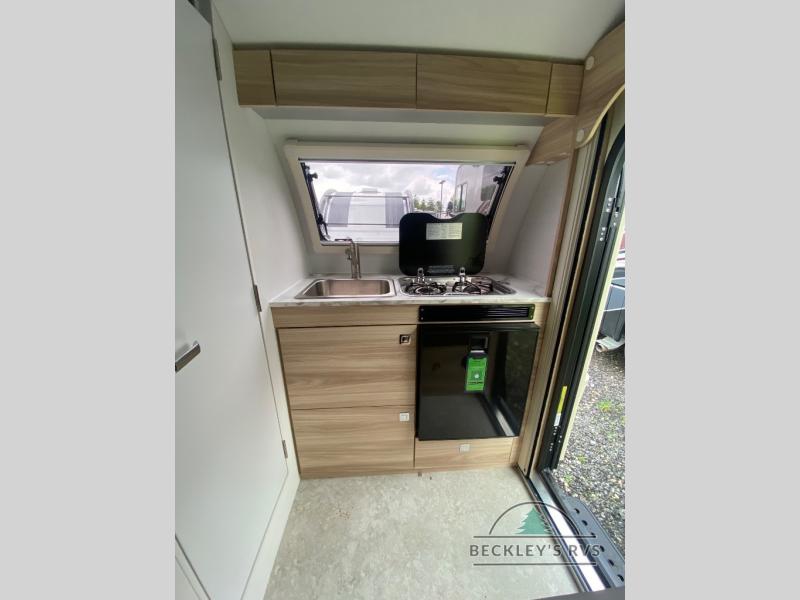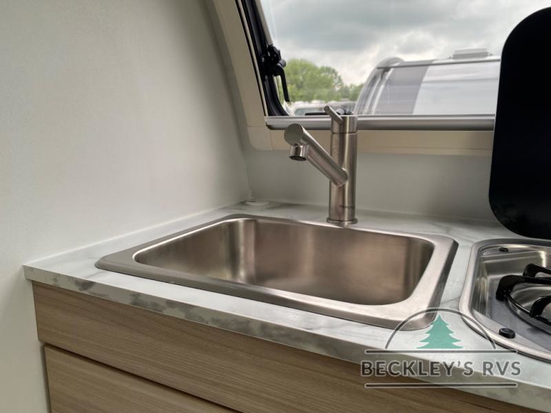 With any TAB 320 teardrop trailer by nüCamp RV, the interior offers premium soft-close cabinetry, a front window, plus a wet bath with a cassette toilet and a molded sink. They are also built with composite flooring and a molded underbelly shield for protection against rock and debris during your journeys. The iconic teardrop design offers an easy-to-tow unit with amenities found in much bigger trailers. Some other highlights include the Alde heating/hot water system, the central air conditioner, 180 watt solar panel, and the Nautilus water system with an external shower.