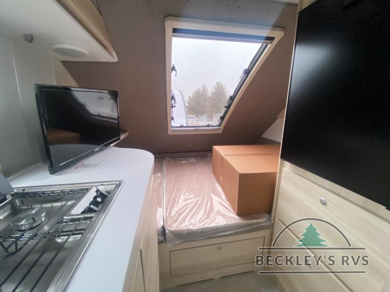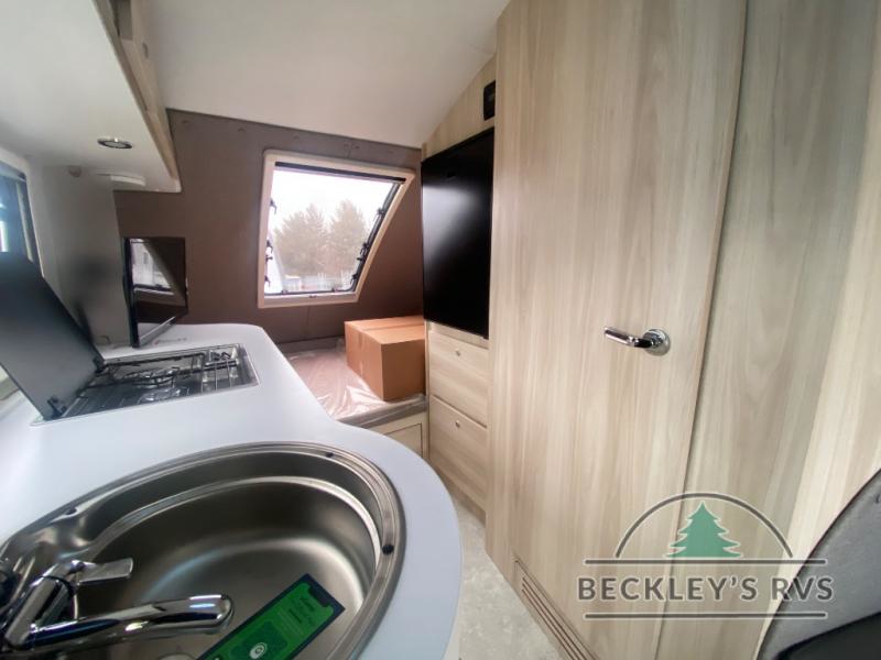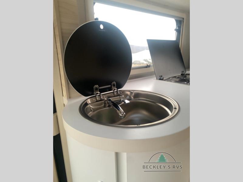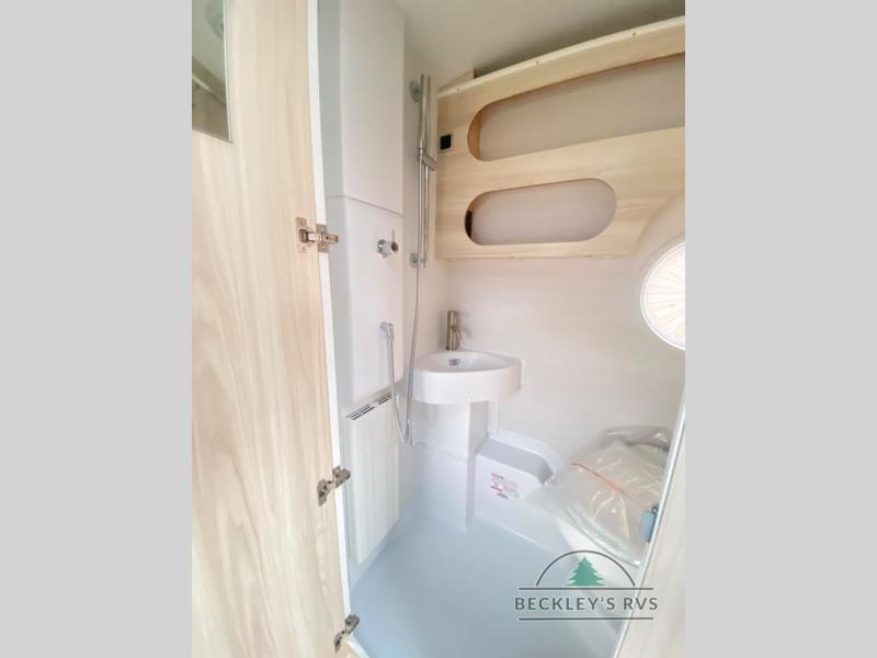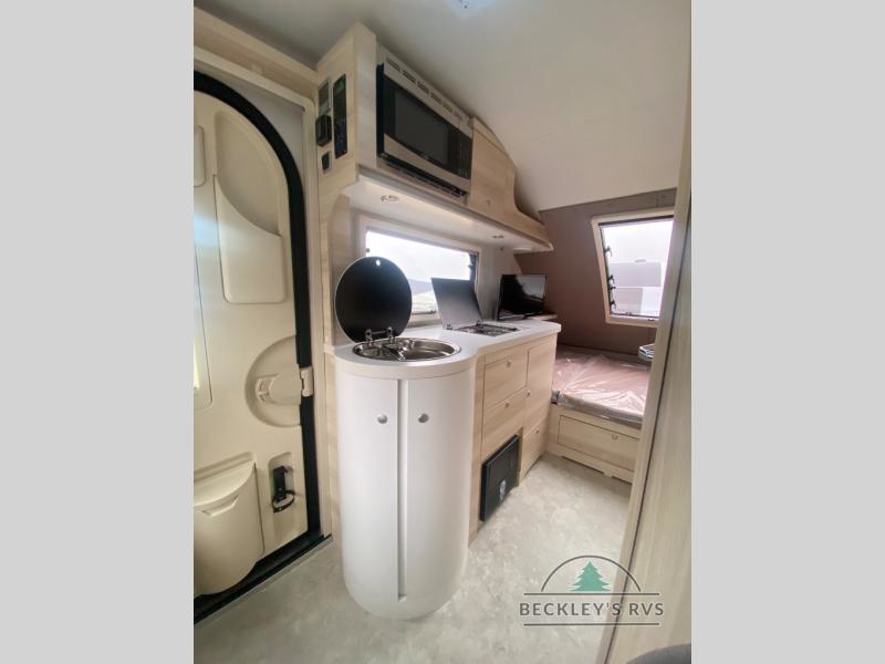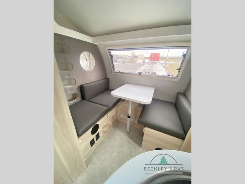 This teardrop trailer offers sleeping space for three with two sleeping areas; one up front and one in the rear. The dinette allows you to eat and relax during the day, and at night this space becomes sleeping space for one. And if you're needing even more sleeping space, you can choose the optional bunk floorplan! The queen-size sleeping area is located on the opposite side with the wet bath in between for convenience for all. The galley kitchen will give the cook a place to make warm meals and store leftovers in the 4.6 cu. ft. 12V compressor refrigerator. Everyone can watch the 24" TV through the Bluetooth media center before bedtime, or in the morning as you all plan your next activity. And the Alde central heating/hot water system, as well as central air conditioning will keep you comfortable where ever you set up. The Black Canyon optional package will have a dry tongue weight of 380 lbs., and a total gross dry weight of 2,946 lbs. The optional Classic package will have a tongue weight will be 355 lbs. and the total gross weight will be 2,915 lbs.