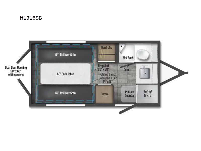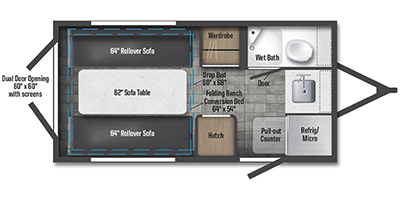 If you're needing a lightweight trailer with a little more sleeping space, this Hike 100 FLX is the one! The rollover sofas and 62" sofa table turns into a folding bench conversion bed plus there is a 60" x 68" drop bed for guests! If the weather is nice, you can open the dual door opening with screens to let fresh air in while you listen to your favorite tunes on the JBL portable Bluetooth speaker. And the front of this unit is shared with the wet bath and the galley that includes a 1.1 cu. ft. convection microwave, portable induction cooktop, and 3.3 cu. ft. 12V refrigerator!
