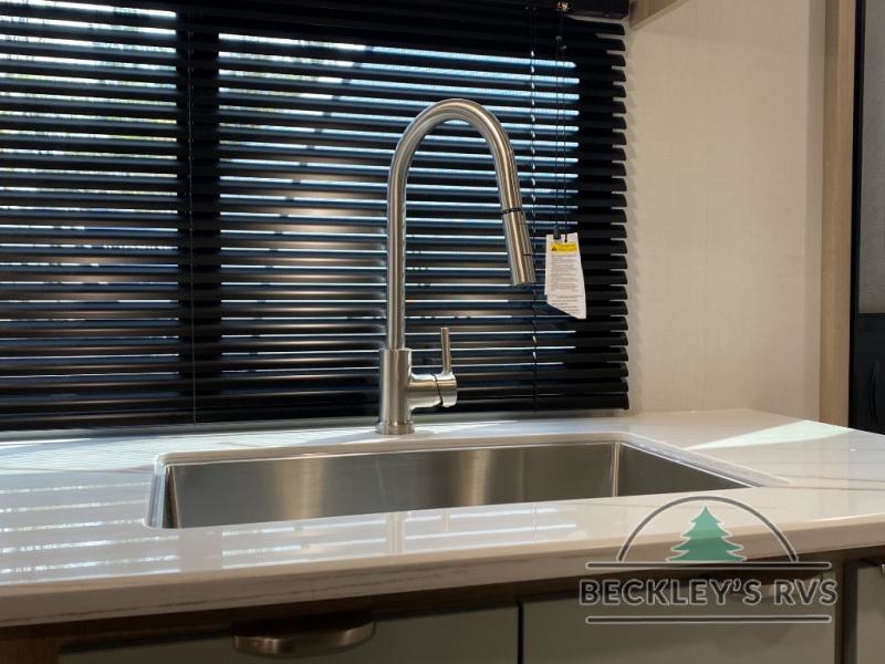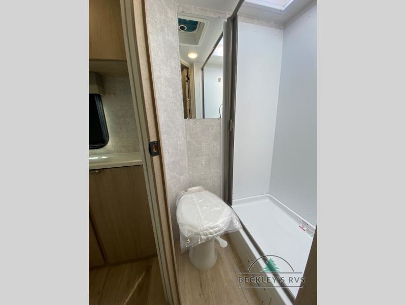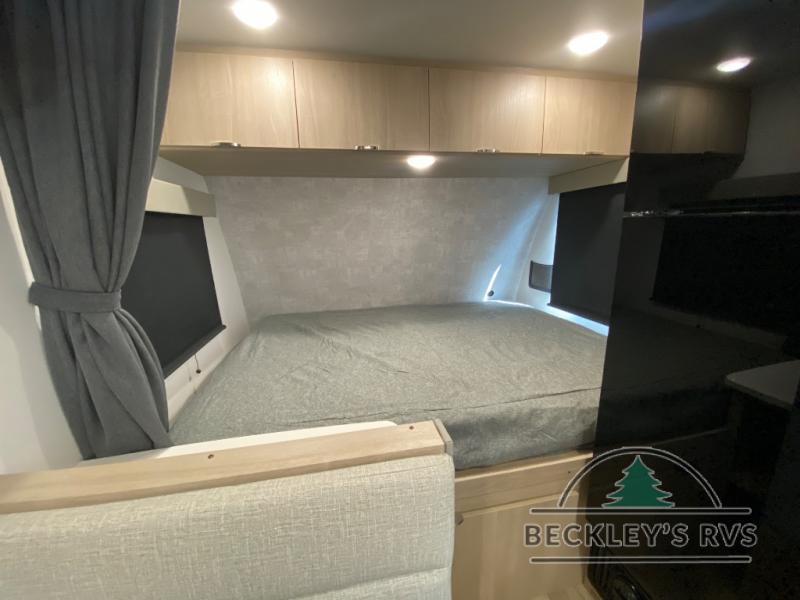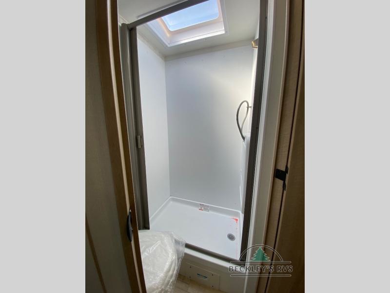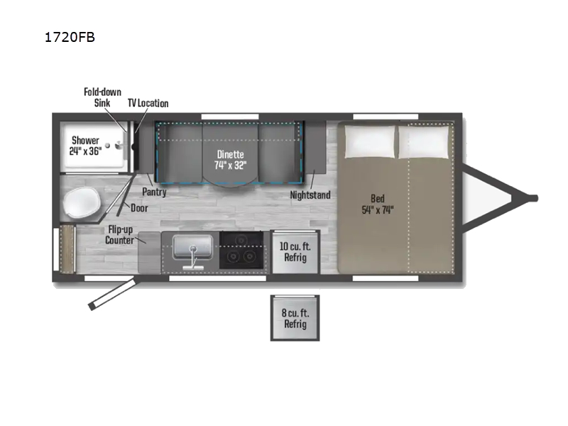 You will love this efficient floorplan that has everything you need! The front 54" x 74" full-size bed provides a great place to sleep after a long day of adventure. The galley kitchen is well-equipped for meals and includes a flip-up counter extension that will expand your work space or can be stowed away for more room. A pantry cabinet provides additional storage space. After cooking, you can enjoy dining at the spacious 74" x 32" booth dinette. A rear corner bath with angled entry door fits in a roomy 24" x 36" shower plus a fold down sink.