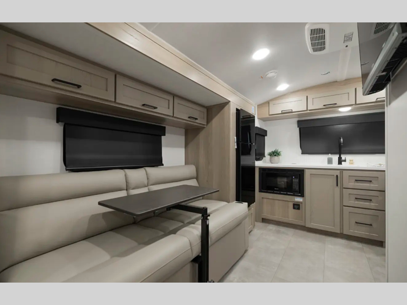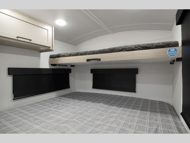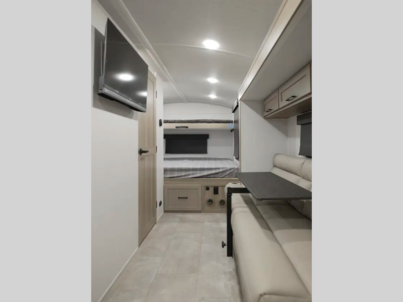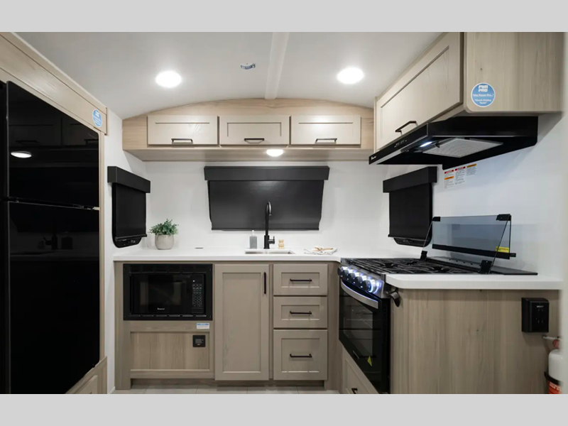 Are you looking for a lightweight trailer with at-home comforts? Take a look at this single slide out unit that can sleep three to four each night. There is a queen-size bed in the back with a 26" x 80" flip-up bunk for cozy sleeping space, a 72" sofa with cupholders to relax on, plus a 12V TV for movie nights! The front kitchen includes a 12V refrigerator to store food, plus a microwave oven and a gas oven to cook meals each day.