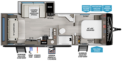 With any Transcend travel trailer by Grand Design, you will enjoy upscale appointments and convenient amenities to make each camping experience one to remember! The Quad Seal technology, residential insulated walls, plus heated and enclosed underbelly with suspended tanks make these units solid and durable. There is a black automotive glass door outside, along with a Safe-T-Rail assist on the main entry door, backup camera prep, and a universal docking station. JBL interior and exterior speakers plus a JBL head unit will let you listen to your favorite tunes as you visit under the power awning with LED strip lights. Inside, you'll enjoy multiple outlets to keep your gadgets charged, thermoformed and seamless countertops, and a 6' 6" interior height so you won't feel closed in. The Solar Prep Package will allow you to enjoy off-grid capabilities with a 200W solar panel, which is wired for up to 600W, a 30 AMP Bluetooth solar controller, a 2000W inverter prep, and more!