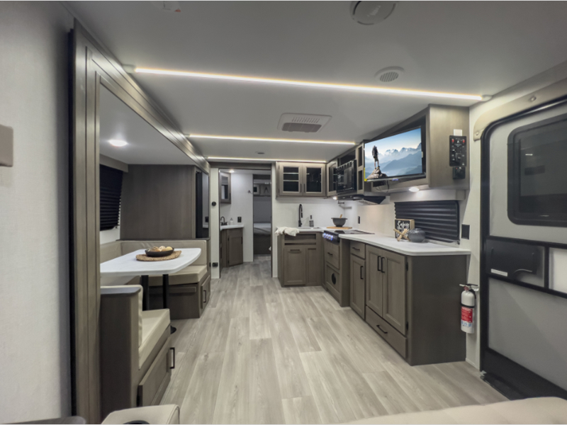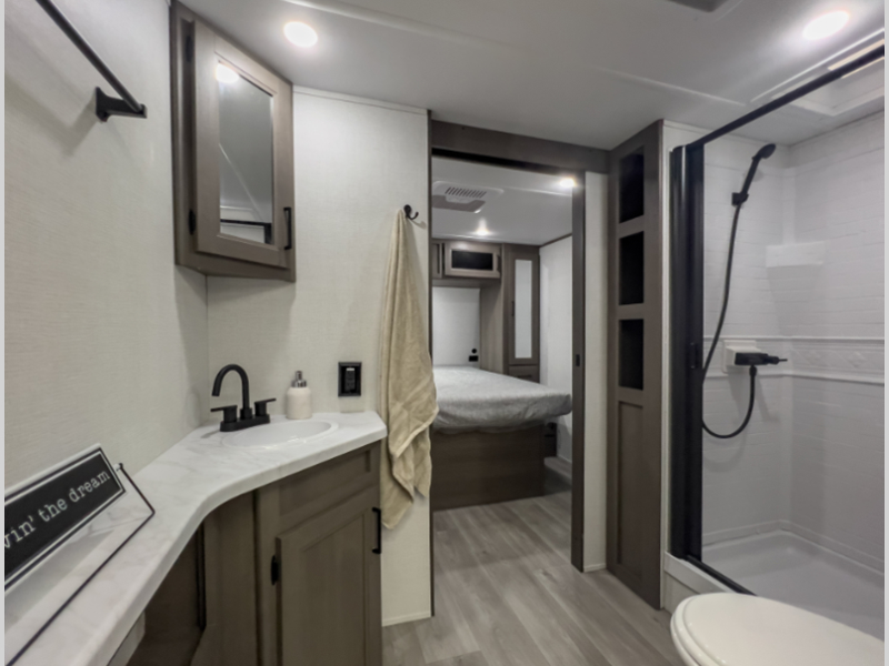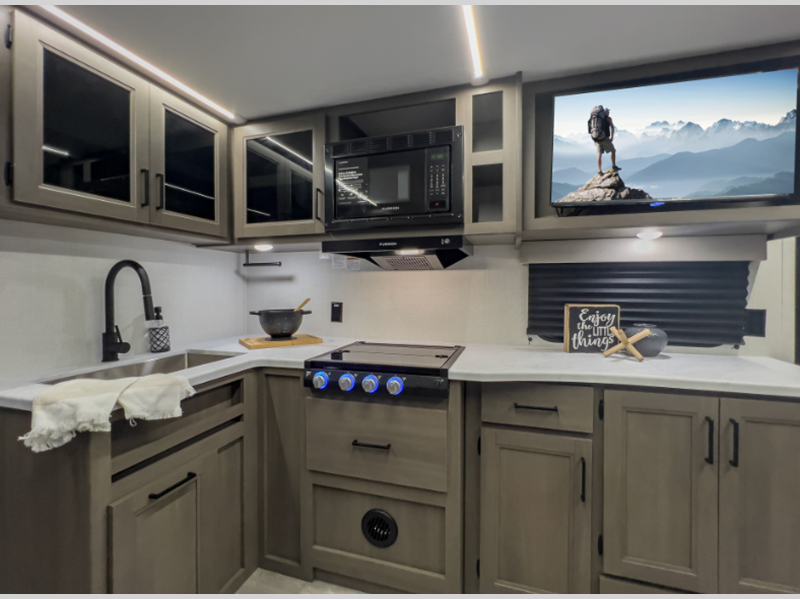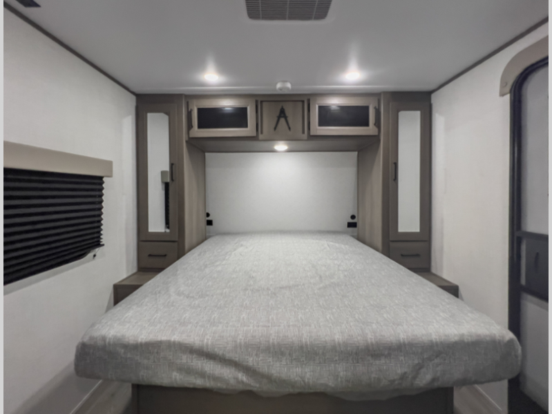 the amount of interior space you have in the living area thanks to the U-shaped dinette slide, which can be switched out for optional theater seats. The rear 70" sleeper sofa will be perfect for guests to sleep on, and the 32" TV lets you enjoy movie nights. There is a three burner range and convection microwave/combo air fryer to cook meals inside, or you can cook on the exterior griddle with a 1.7 cu. ft. refrigerator. And the 17' power awning will provide much wanted shade as you visit with friends. Back inside, the walk-thru bath is both spacious and convenient since it can be accessed from the main living area and the front master bedroom. Here, you'll find a queen bed, storage space, plus TV prep if you want to add a television. You even have your own exterior entry door for convenience!