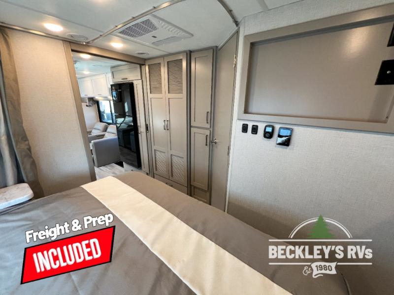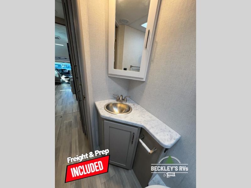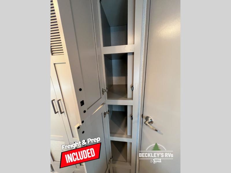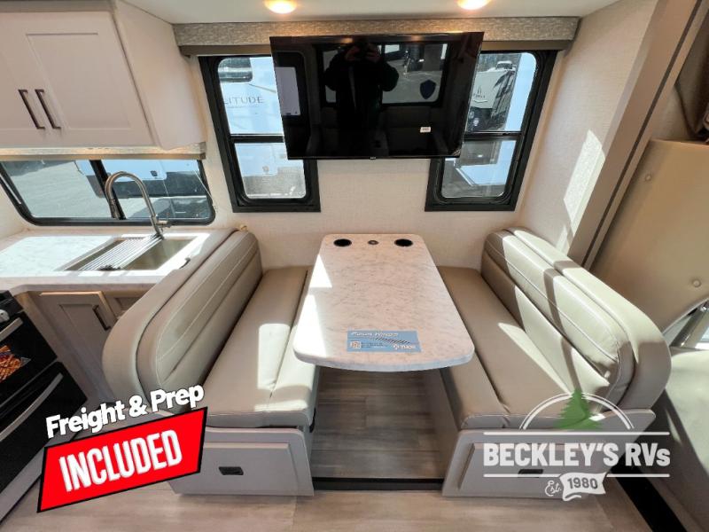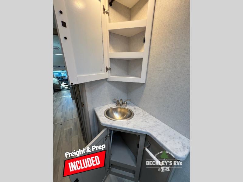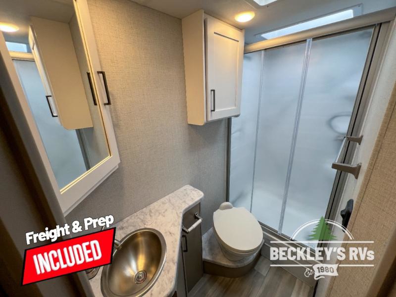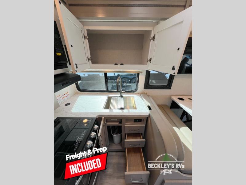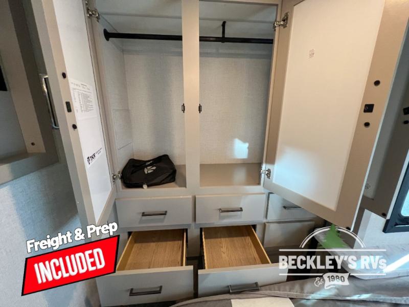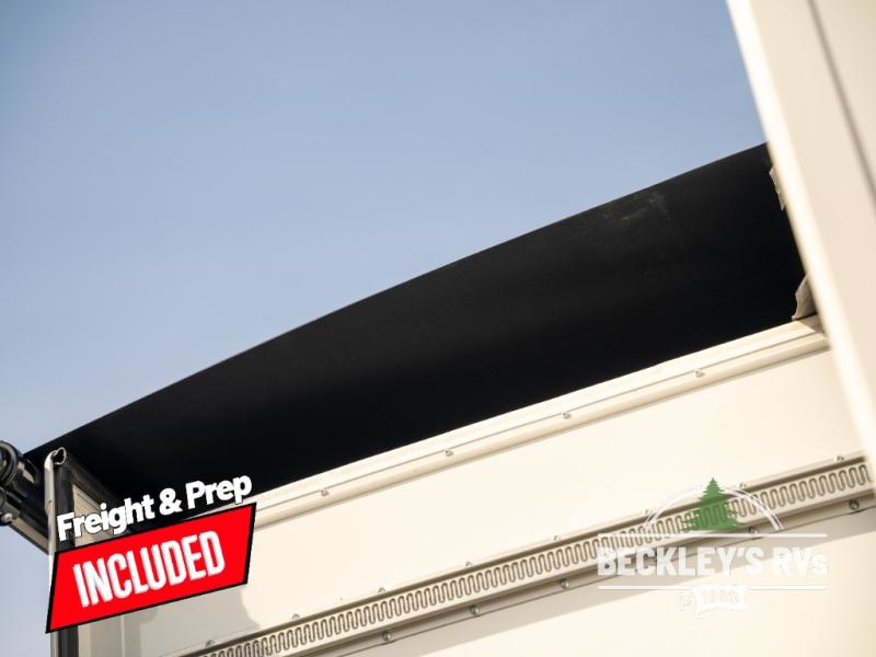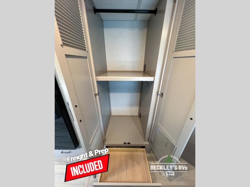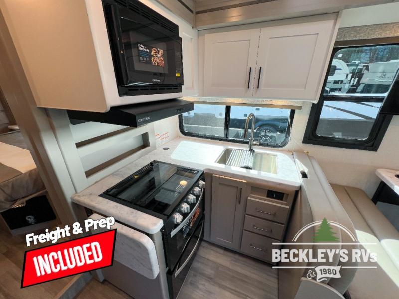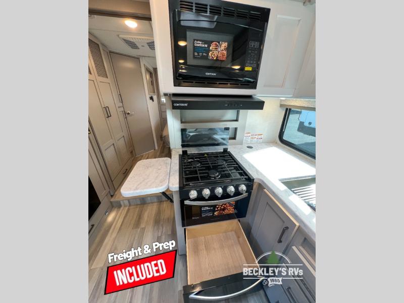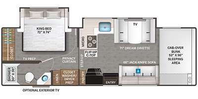 Easily head out for fun at a state park, the lake or your friend's ranch. This coach is easy to maneuver on the road or in town thanks to its compact size, yet has so many conveniences, you might not return home. The front cab over bunk is a perfect sleeping space for guests, the 40" Smart TV allows you to watch shows when you want some inside time, and the 71" Dream Dinette gives you a place to dine and relax. The cook will love all the kitchen amenities at their fingertips, plus the flip-up countertop extension is super handy. The rear corner bedroom offers a king bed slide for more floor space, a privacy curtain and a closet, plus the full bathroom is a few steps away.