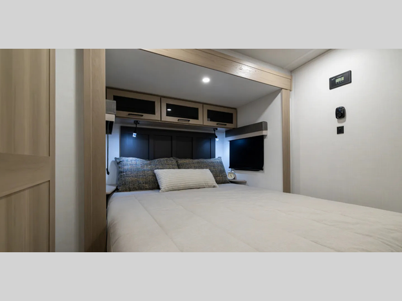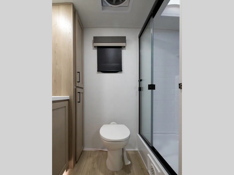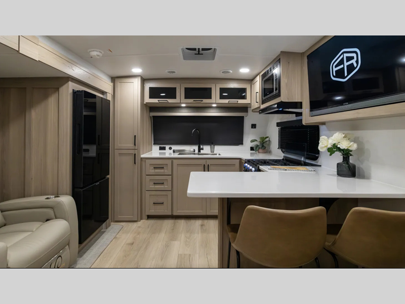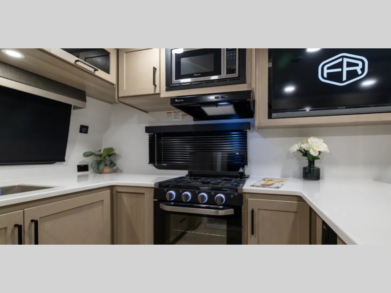 This travel trailer is the best option for you and your partner! The lavish full rear bathroom features a spacious layout and a convenient linen closet, perfect for relaxation and refreshment. The elegant bedroom boasts a plush queen bed, ample wardrobe space, and stylish dresser, creating a serene retreat. The spacious living room and kitchen combined area is the heart of the trailer, featuring plush theater seating for cozy movie nights, a generous closet for storing essentials, and a 12V Smart TV for entertainment on the go. Plus, the expansive countertop with chairs provides a perfect spot for gourmet meals or socializing, while the premium three-burner cooktop, kitchen pantry, and microwave make meal prep and cooking a true delight.