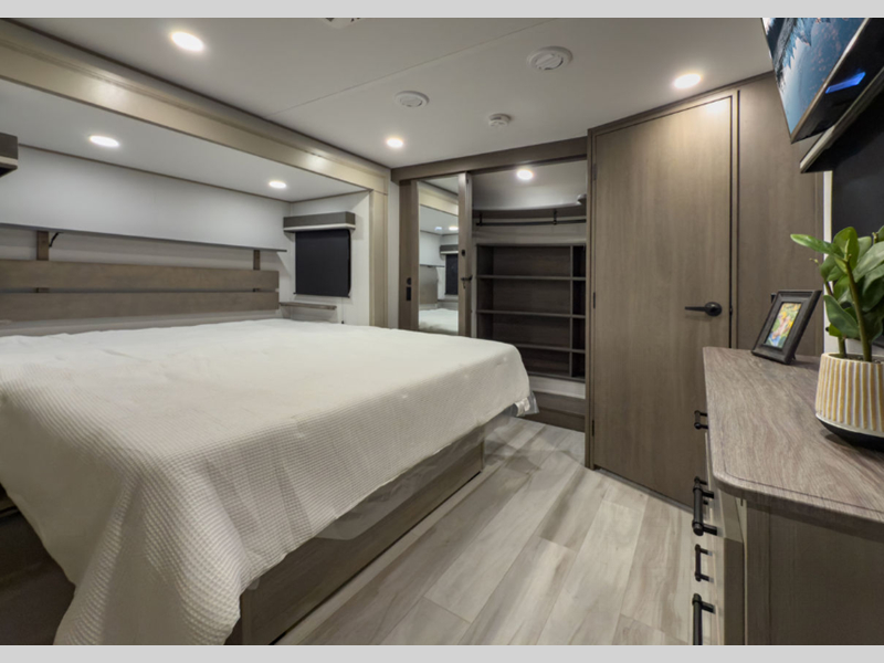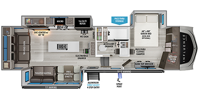 Any Grand Design Influence fifth wheel features five-sided aluminum cage construction with a walk-on roof and a fully enclosed underbelly with heated tanks and storage for all weather camping. For peace of mind, the MORryde CRE3000 Suspension system will provide safe and smooth towing, and the 101" widebody construction offers all the room you need and that is before multiple slides are fully engaged. You will appreciate the Keyed-Alike locks, slam-latch baggage doors with magnetic door catches, exterior security light, and SolidStep entry steps. On the inside, Congoleum flooring, premium roller shades for privacy, a hallway handrail for safety, and nightstands with USB ports to keep all of your electronics fully charged. You will also love the On Demand tankless water heater when showering, plus the added heat and ambiance from an electric fireplace, and so much more!