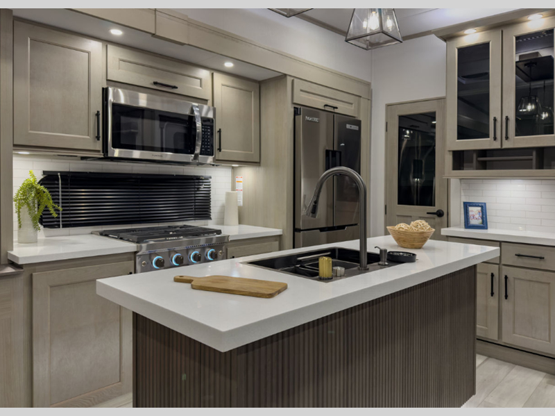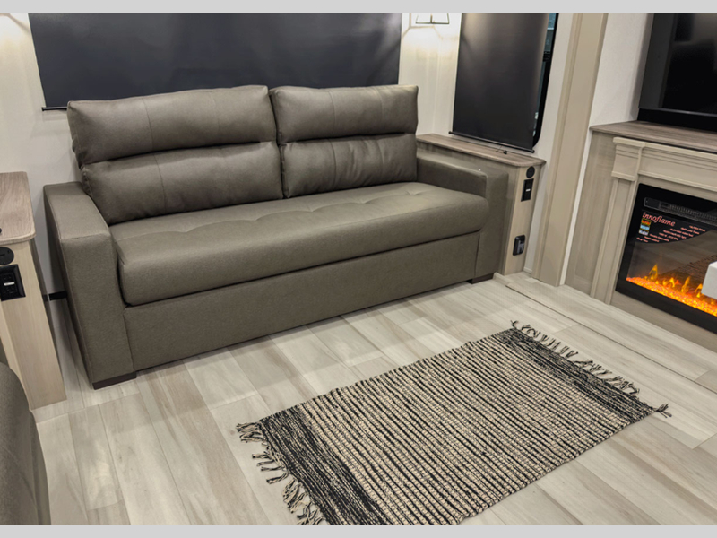 A perfect fifth wheel featuring triple slides and a tri-fold sofa for overnight guests! You will love the spacious interior thanks to the dual opposing slides in the main living and kitchen area. Here you will find a kitchen island in the center and plenty of seating with a free standing dinette, theater seating for movie night opposite the fireplace and entertainment center, as well as a tri-fold sofa. The kitchen offers all of the amenities just like home, a 16 cu. ft. 12-volt refrigerator for your perishables, and a hutch with an electronics drawer to keep your gadgets organized. There is even a pet dish under the refrigerator for your furry friends. The spacious full bath includes a 48" x 30" shower, dual linen closets, and an accessory drawer for necessities. You'll love the front bedroom with its queen bed slide out, slide top dresser, front wardrobe with washer and dryer prep, plus a pass-thru clothes hamper between the bedroom and bath; how convenient!
