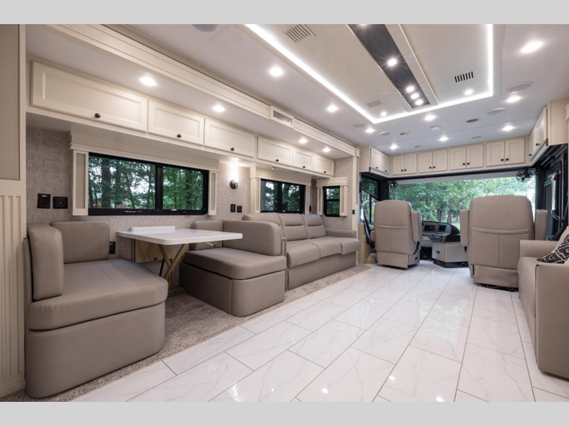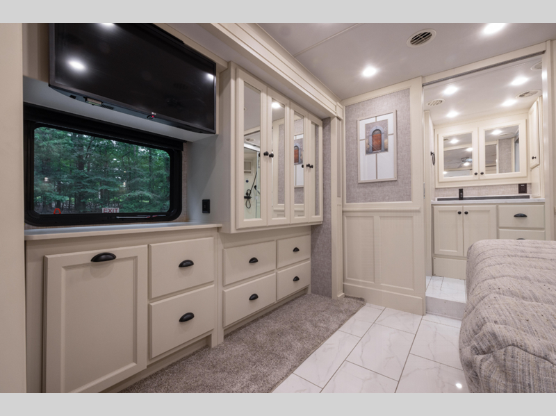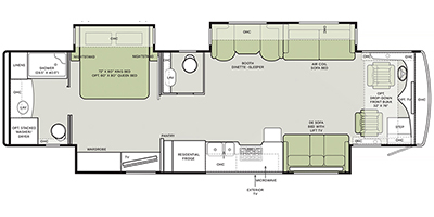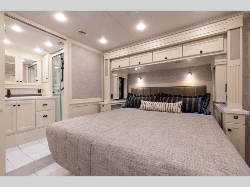 If luxury is what you want, luxury is what you'll get with this Allegro RED Class A diesel motorhome! Glamorous furnishings and high-class style are included all throughout this coach. One of the best features is going to be the master suite. This space has a private bedroom connected to its own private bathroom. The king bed slide sits across from the full-wall slide, so there is plenty of space to change your clothes and just relax. There is a TV next to the wardrobe and across from the bed for easy viewing at night, and the bathroom has a place for the optional washer/dryer to be added. Out in the main living area, the rest of your traveling companions can use the half bathroom to clean up, and there is plenty of seating for everyone to lounge on with the booth dinette sleeper and two sofas. If you would like to have more sleeping space, you can add the optional drop-down bunk above the cab.