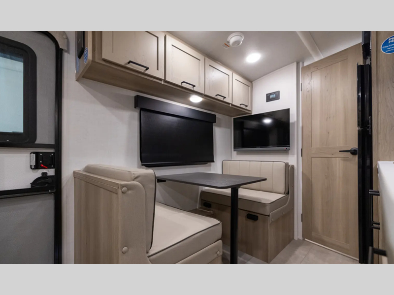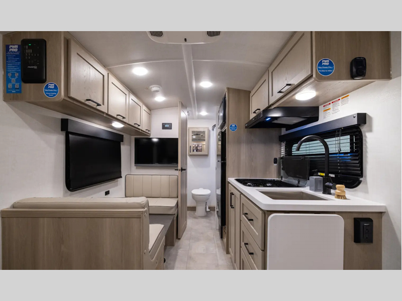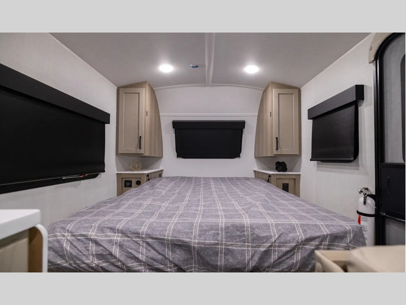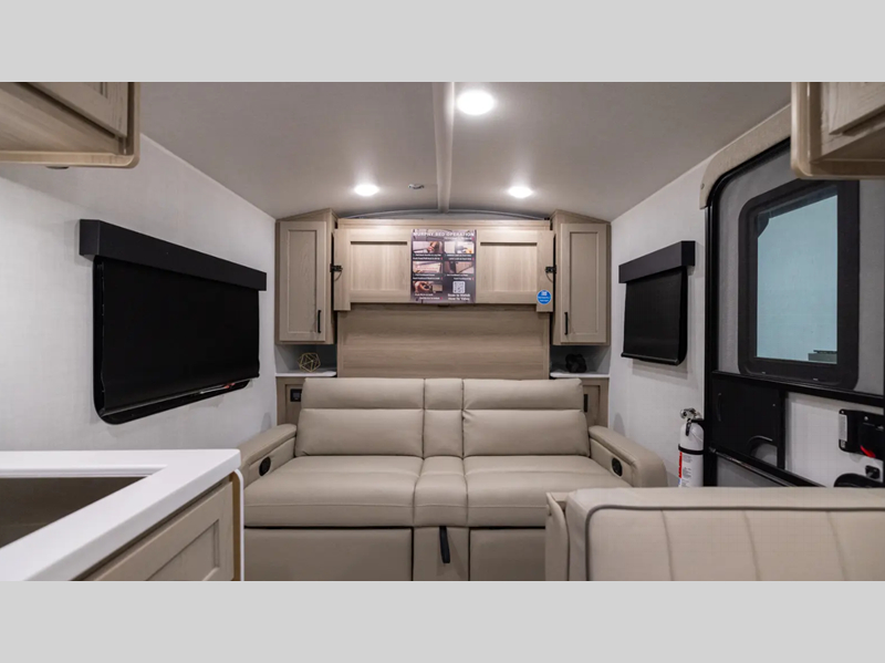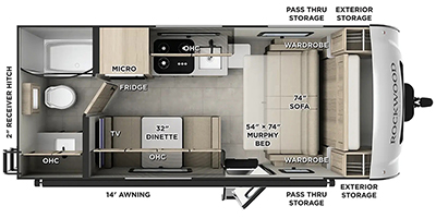 You will love how versatile this travel trailer is thanks to the Murphy bed up front. After you've had a great night's rest, just fold it up to relax on the 72" sofa. This will give the chef more space in the morning to prepare breakfast on the three burner cooktop or in the microwave oven. There is a 32" booth dinette to dine at, or you may just want to take your plate outdoors under the 14' power awning. The full rear bath includes a large linen closet to store clean towels. You will appreciate a pass-through storage, plus additional exterior storage so you can bring along hiking gear, water tubes, and fishing poles!