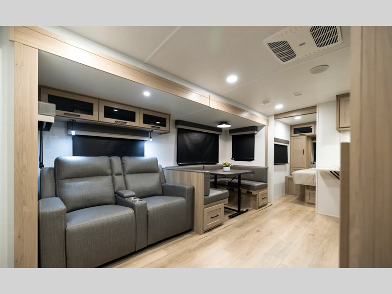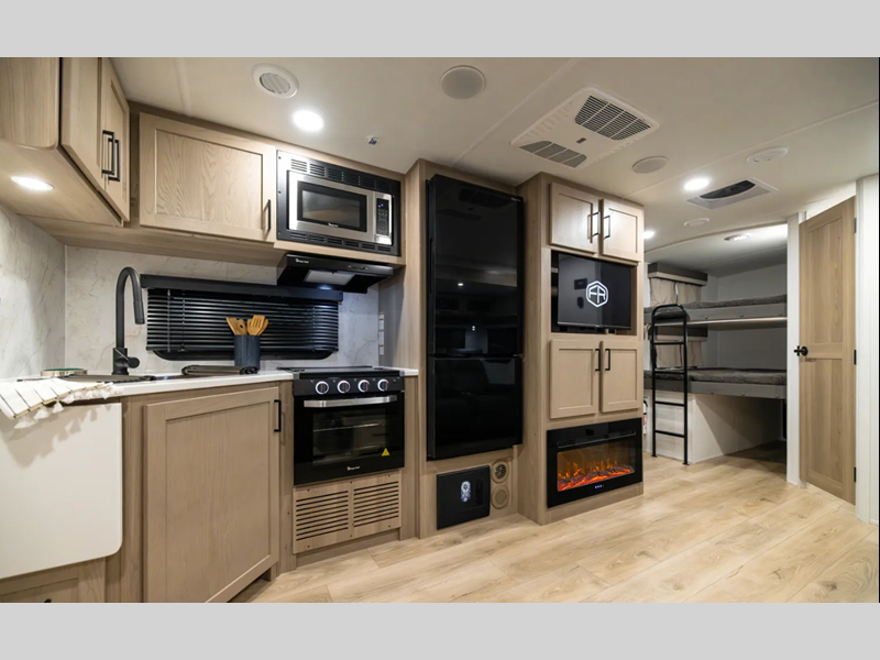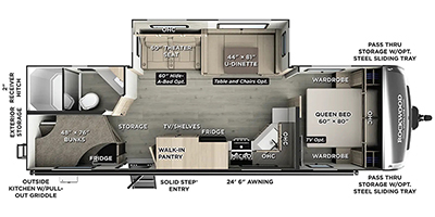 Looking for a trailer that sleeps eight, allows you to cook indoors or outdoors, and provides added interior space? This trailer provides for those wants and needs, and even more! The outside kitchen gives you more choices when feeding the masses along with the outside griddle, and the interior kitchen includes an L-shaped area for the cook to have their own space with full amenities including a walk-in pantry to bring along everything they need. The full bathroom will keep everyone refreshed, and the theater seating and U-shaped dinette offer seating inside to enjoy the Smart TV and fireplace. There is plenty of storage found throughout the interior, and along the exterior you will find several places to stow your outdoor items including in the pass thru storage with an optional steel sliding tray. There is even a front door option if you prefer to have dual entry doors!