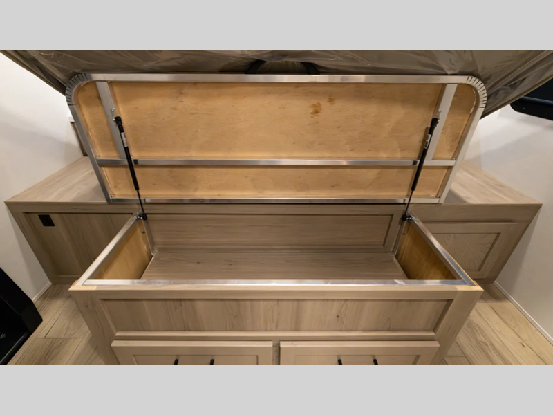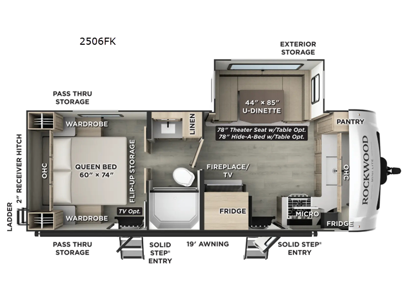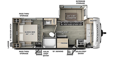 If you like the front kitchen layout, you're going to love this one! There is a 19' power awning with LED lights to keep you protected from the sun and rain, and there are three exterior storage compartments for lawn chairs, fishing poles, and firewood! This model includes a U-shaped dinette slide in perfect view of the 12V smart entertainment TV and fireplace, and this area can double as your guests' sleeping space at night. You'll stay comfortable in the rear bedroom that includes an RV queen bed, dual bedroom wardrobes, and an optional TV if you enjoy movies in bed!