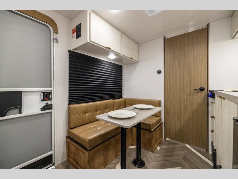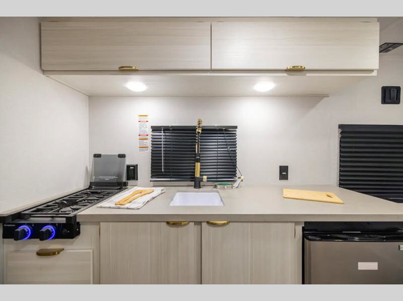This Limited Edition travel trailer is the perfect couples coach!  As you enter, the queen bed in front features dual wardrobes and an overhead space for your personal belongings. The middle L-shaped open lounge with a table provides a place to relax and let a guest sleep over, and across from here, the countertop which features a sink, counter space, and a two burner cooktop allows you to prepare meals and snacks easily. There is even a refrigerator for your perishables. You will also enjoy the full rear bath with shower to stay clean and generous bath counterspace. On the outside, an 8' 12V power awning will provide an outdoor living space you are sure to love as well!