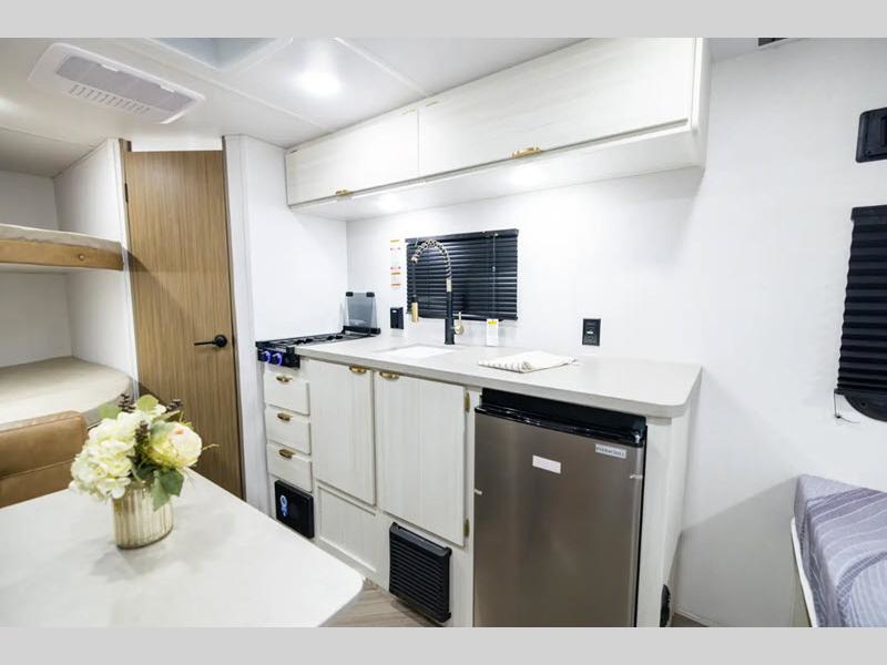 This Limited Edition travel trailer is perfect for your crew of seven thanks to the double-size bunks! You can take the front queen bed for yourselves, and any other guests can sleep on the L-shaped open lounge if needed. You will find a kitchen overhead cabinet for spices, and wardrobe by the bed for your clothes. Prepare all your meals in the fully-equipped kitchen that includes plenty of counter space and a refrigerator.  On the outside, a 8' 12V power awning will provide an outdoor living space you are sure to love as well!