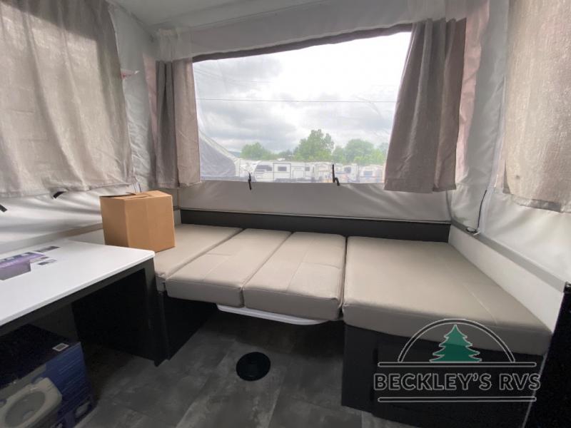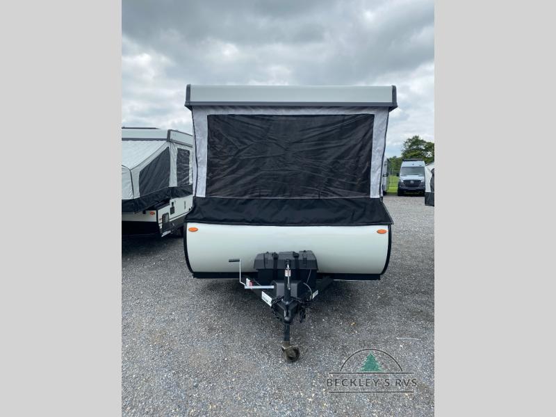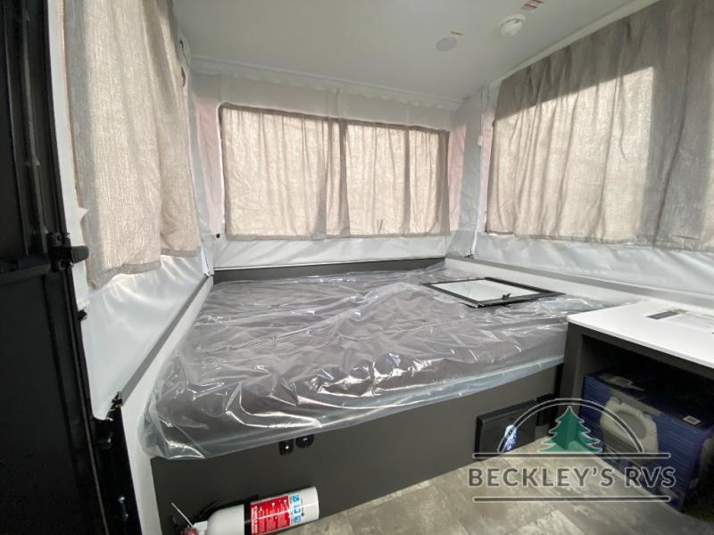 With any Rockwood OTG (Off The Ground) folding pop-up camper by Forest River, you will enjoy a more simple approach to outdoor fun. If you're a regular tent camper, but are looking for a little more comfort, then take a look at these easy-to-tow models! There are electric brakes, balancing bead filled tires, and leaf spring axles that provide that easy towing, and the alloy fiberglass exterior is durable. A one-piece screen door also comes standard so you can let fresh air in, while keeping bugs out, and the LED interior lights will be an added benefit you didn't have while tent camping. Each model also includes residential style cabinet doors, wood look flooring, and an Andover Sable wood interior for a more outdoorsy feel!