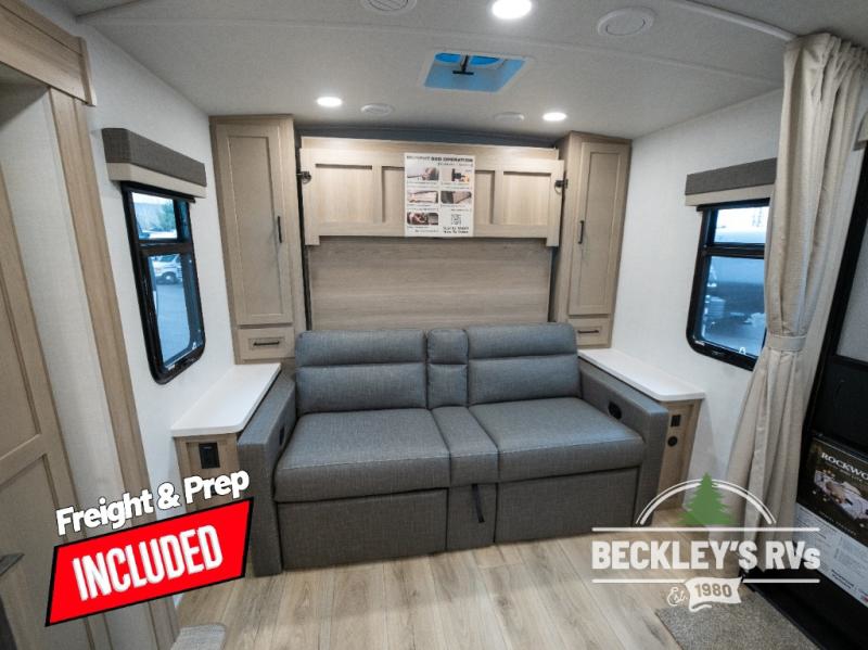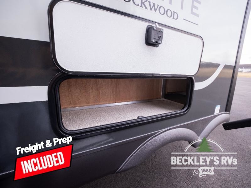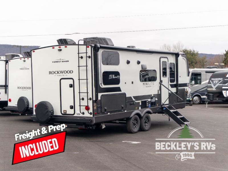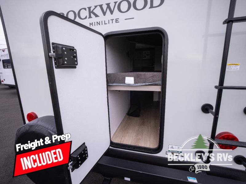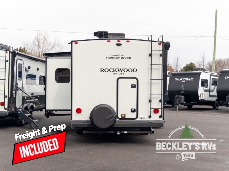 Each Rockwood Mini Lite travel trailer by Forest River is constructed with a fully laminated one-piece walkable roof, sleek frameless windows, and a six-sided full aluminum frame for strength and durability. The 12V thermostatically controlled heated tanks, plus radiant foil in the underbelly will allow you to camp well into the colder months, and the 200W roof solar panel will be perfect for a little off-gridding. Each model includes solid surface kitchen countertops, hidden hinge cabinet doors, roller shades, plus many more interior features. Having an AIR 360+ omnidirectional antenna with WiFi prep on board gives you the option to get some work done if it's needed, and the power tongue jack provides hassle-free set up, so you can enjoy more time relaxing!
