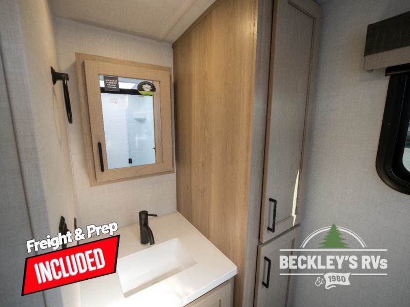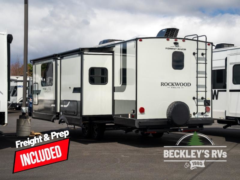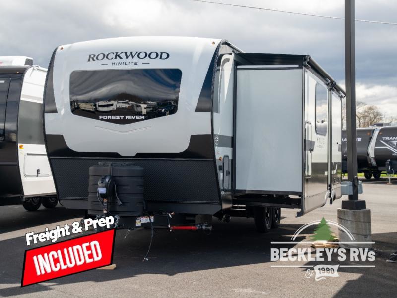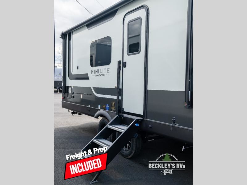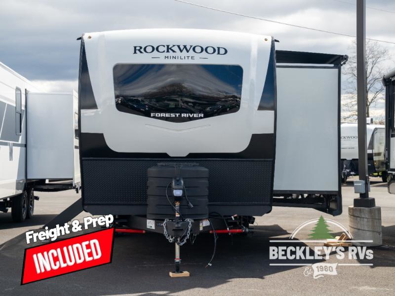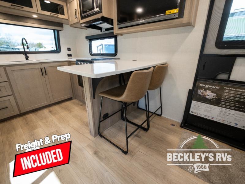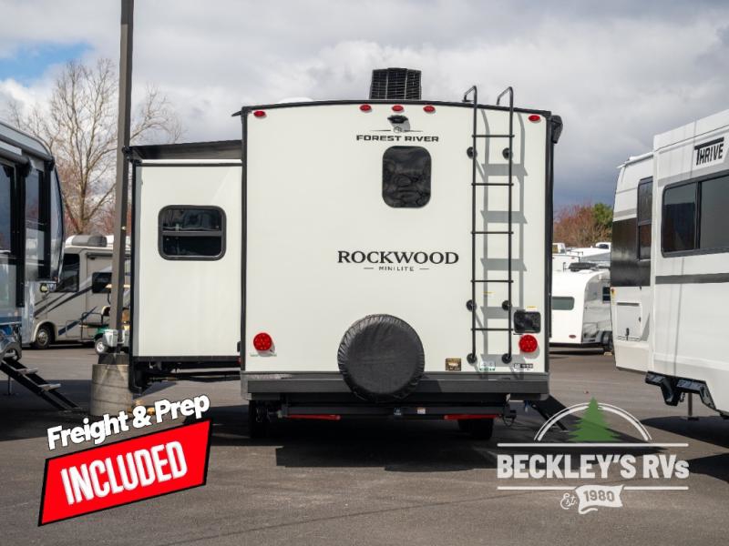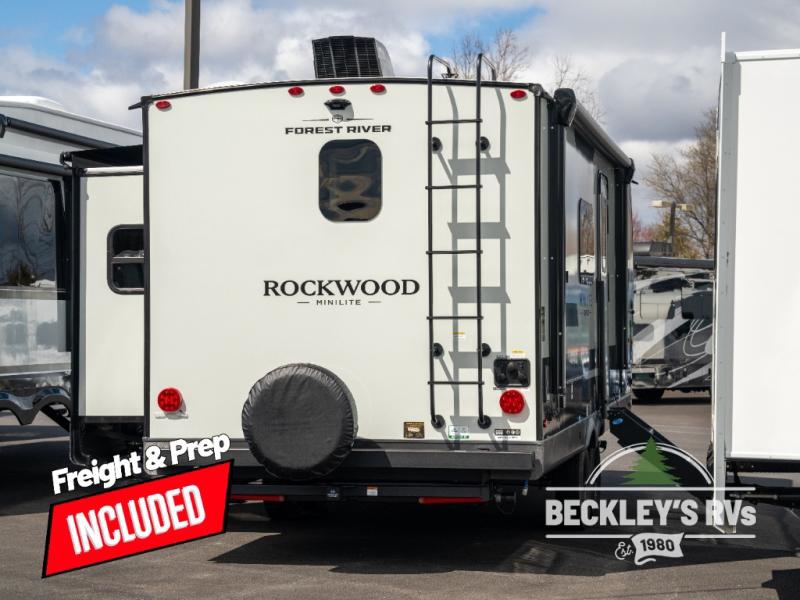 Each Rockwood Mini Lite travel trailer by Forest River is constructed with a fully laminated one-piece walkable roof, sleek frameless windows, and a six-sided full aluminum frame for strength and durability. The 12V thermostatically controlled heated tanks, plus radiant foil in the underbelly will allow you to camp well into the colder months, and the 200W roof solar panel will be perfect for a little off-gridding. Each model includes solid surface kitchen countertops, hidden hinge cabinet doors, roller shades, plus many more interior features. Having an AIR 360+ omnidirectional antenna with WiFi prep on board gives you the option to get some work done if it's needed, and the power tongue jack provides hassle-free set up, so you can enjoy more time relaxing!