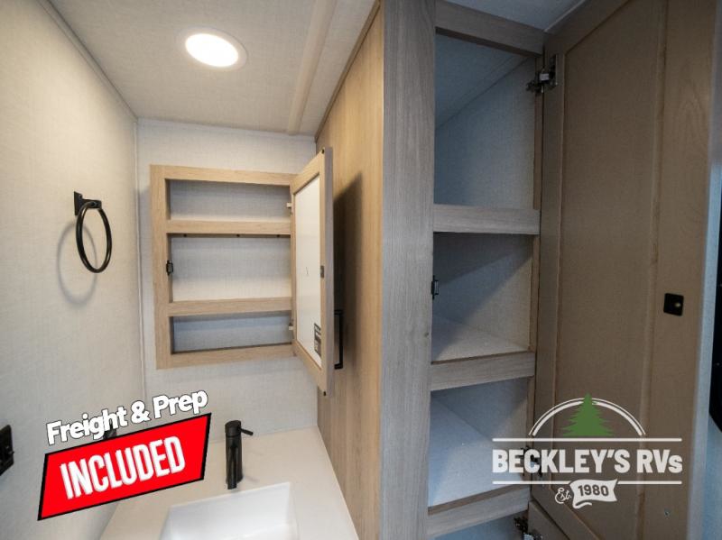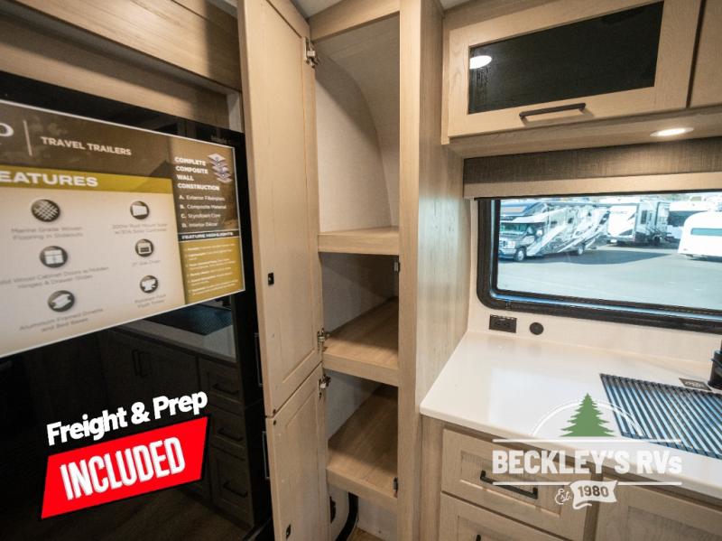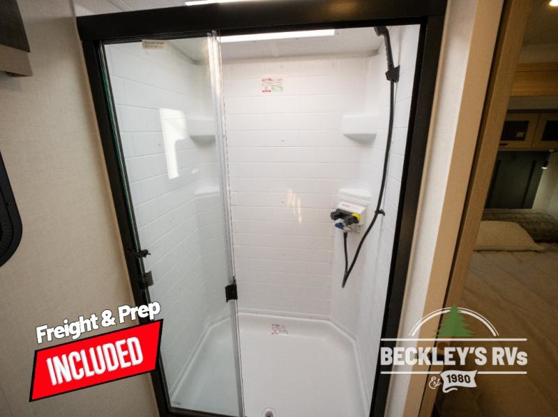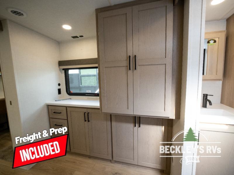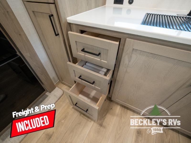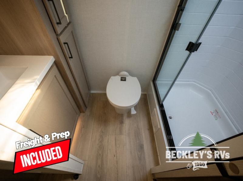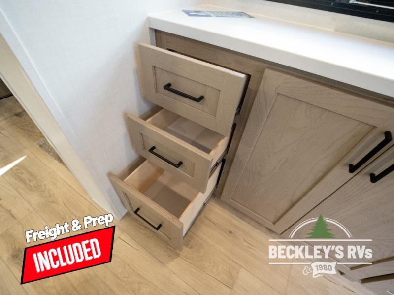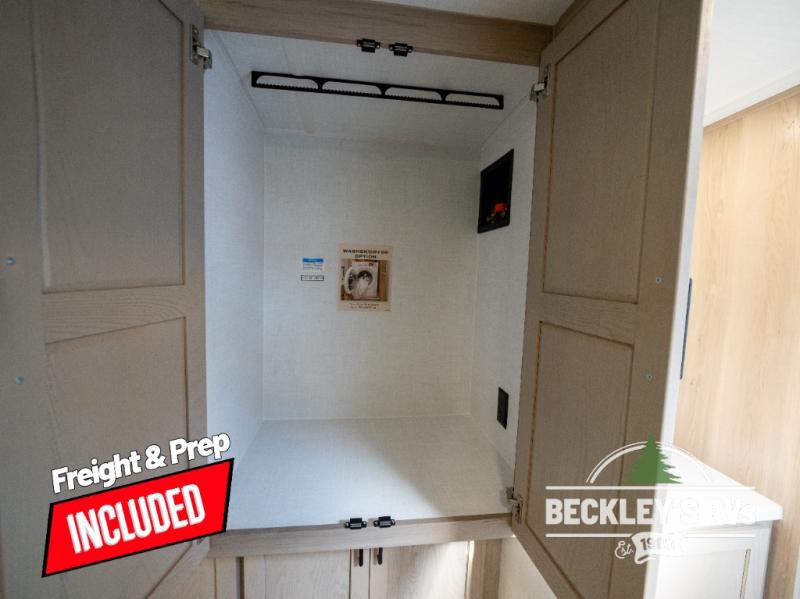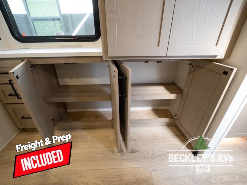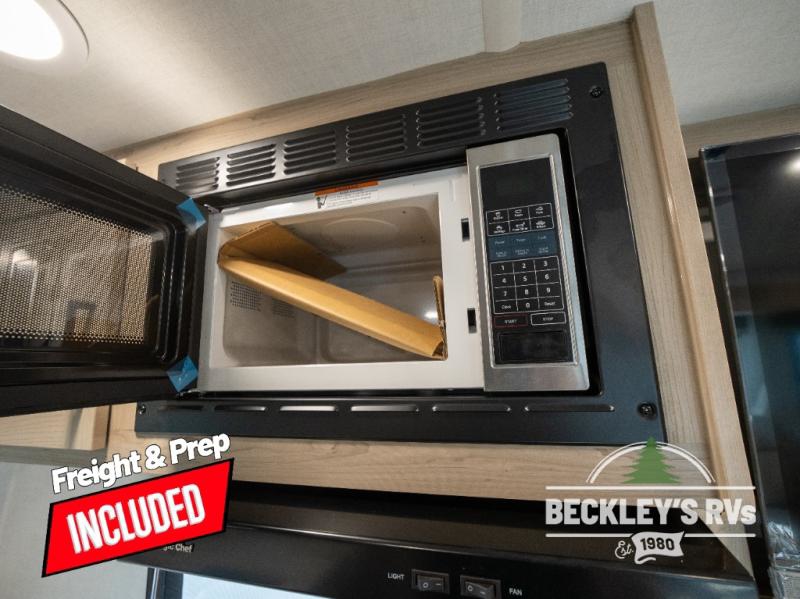 This travel trailer is the best option for you and your partner! The lavish full rear bathroom features a spacious layout and a convenient linen closet, perfect for relaxation and refreshment. The elegant bedroom boasts a plush queen bed, ample wardrobe space, and stylish dresser, creating a serene retreat. The spacious living room and kitchen combined area is the heart of the trailer, featuring plush theater seating for cozy movie nights, a generous closet for storing essentials, and a 12V Smart TV for entertainment on the go. Plus, the expansive countertop with chairs provides a perfect spot for gourmet meals or socializing, while the premium three-burner cooktop, kitchen pantry, and microwave make meal prep and cooking a true delight.