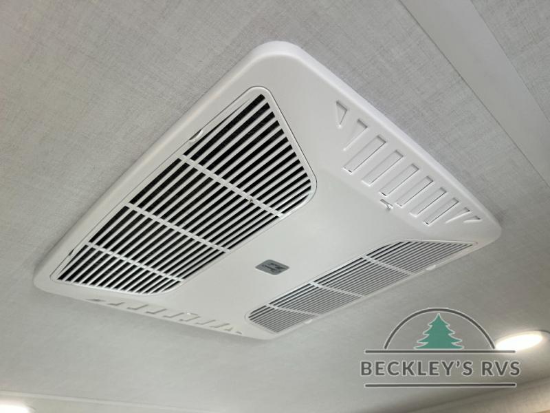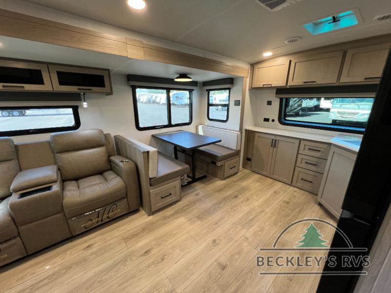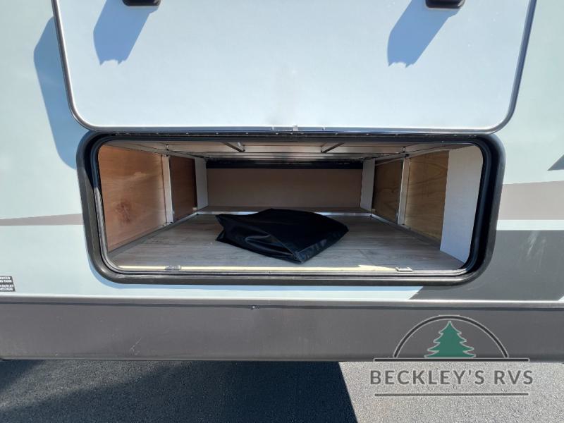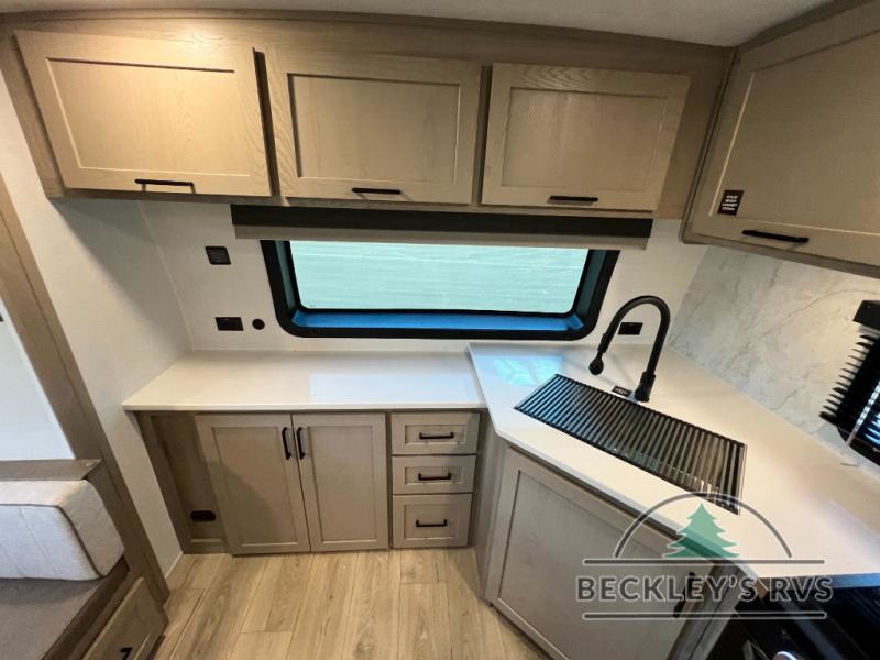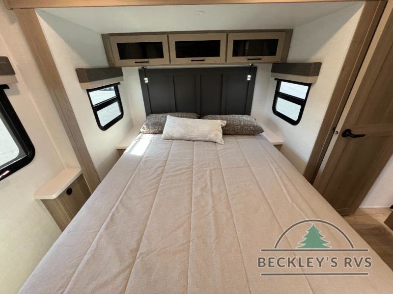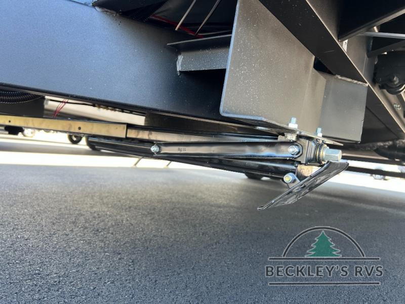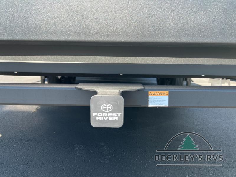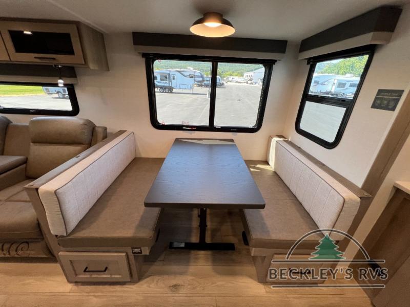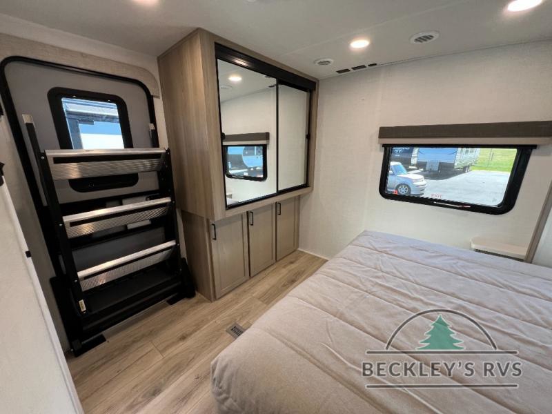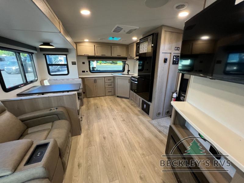 When you are outside this trailer you can enjoy the protection from the 21' power awning, and whip up a meal using the outside griddle. You will find exterior storage for your extra gear, and a ladder at the rear. You get to choose which entrance to step up into, be it the spacious rear bedroom with a queen bed slide and a wardrobe, or the main entry into the kitchen and living area. The furniture slide includes a booth dinette to eat your meals at, and theater seating to watch the Smart TV with a fireplace below. And the cook will love the front kitchen with extra counter space, a three burner range, plus a 12V refrigerator and pantry for food storage!