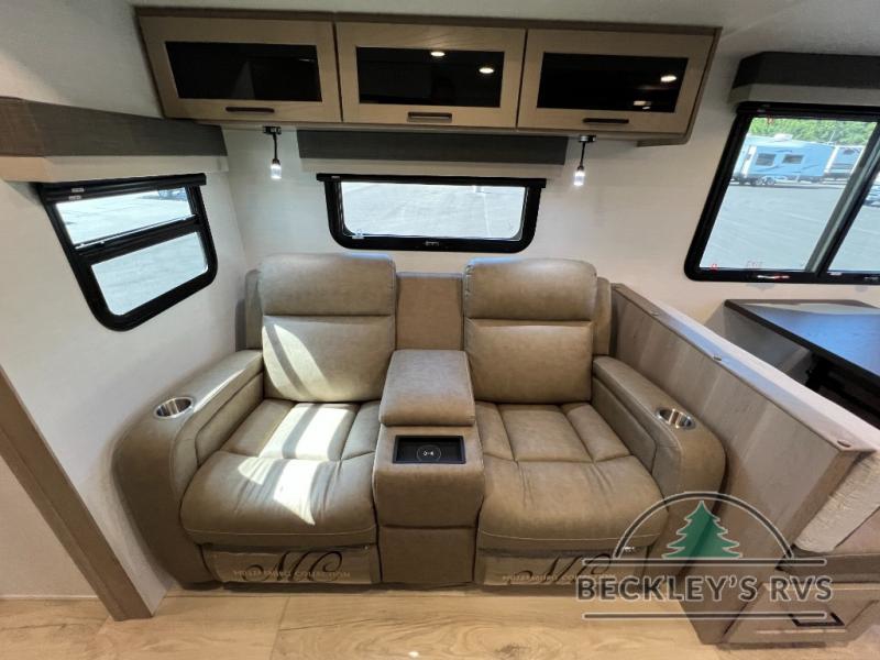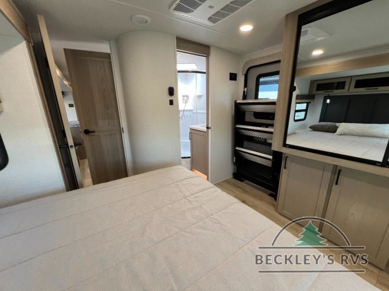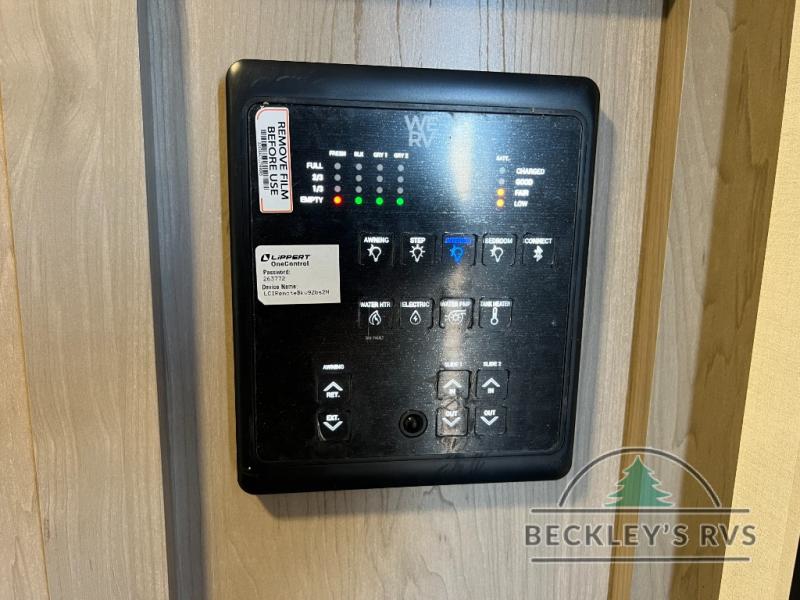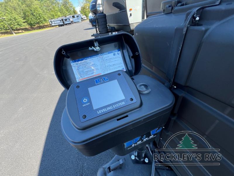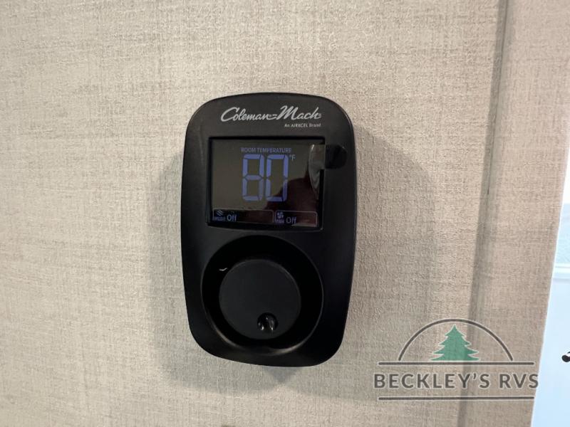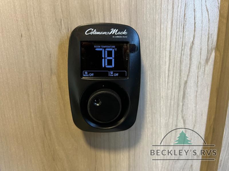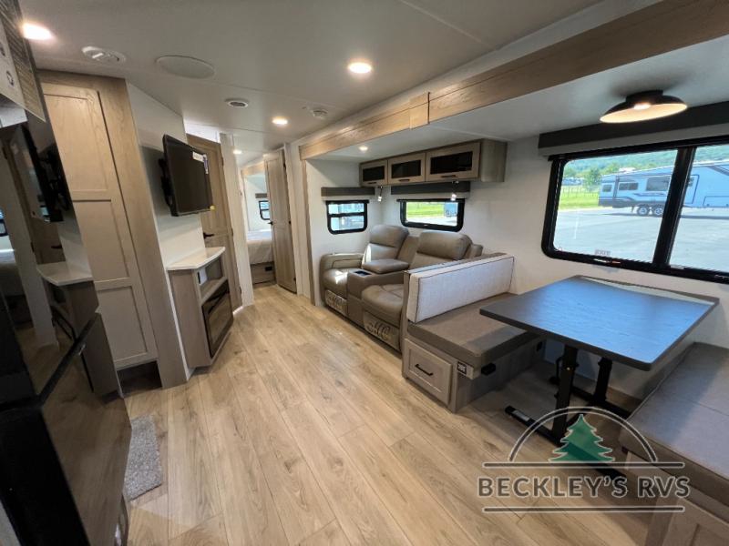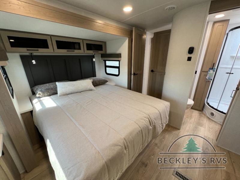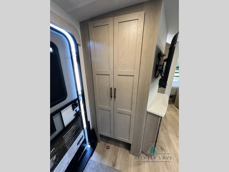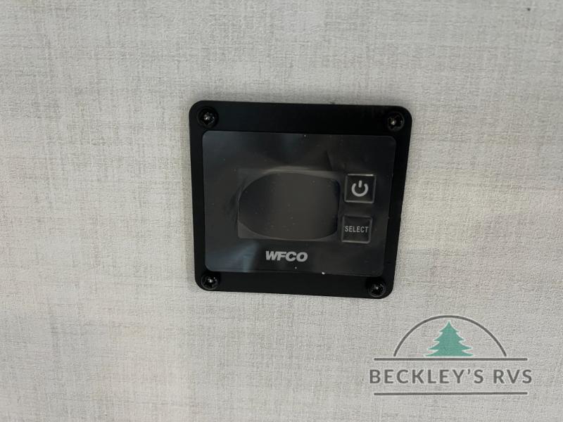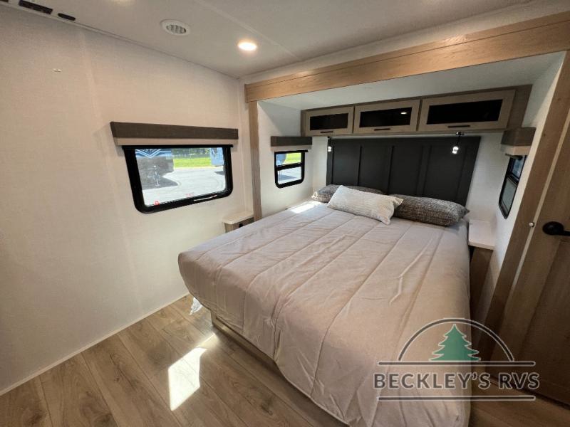 When you are outside this trailer you can enjoy the protection from the 21' power awning, and whip up a meal using the outside griddle. You will find exterior storage for your extra gear, and a ladder at the rear. You get to choose which entrance to step up into, be it the spacious rear bedroom with a queen bed slide and a wardrobe, or the main entry into the kitchen and living area. The furniture slide includes a booth dinette to eat your meals at, and theater seating to watch the Smart TV with a fireplace below. And the cook will love the front kitchen with extra counter space, a three burner range, plus a 12V refrigerator and pantry for food storage!