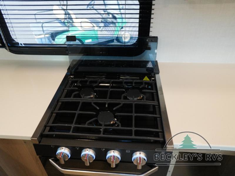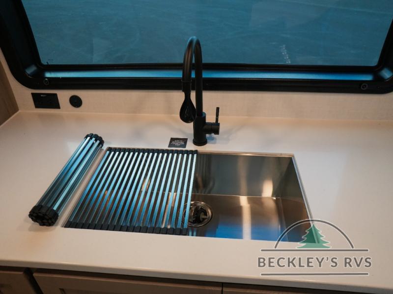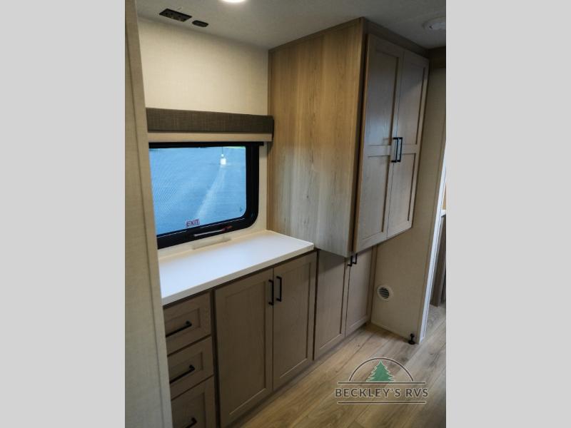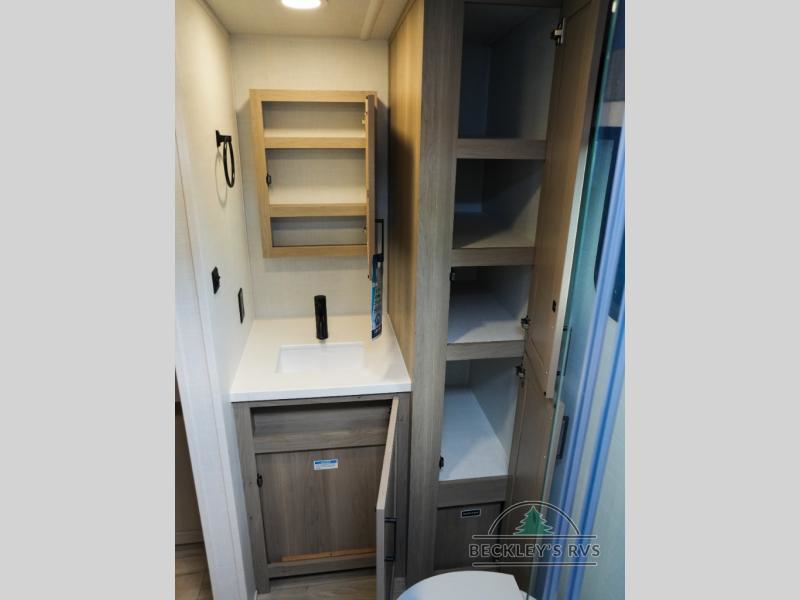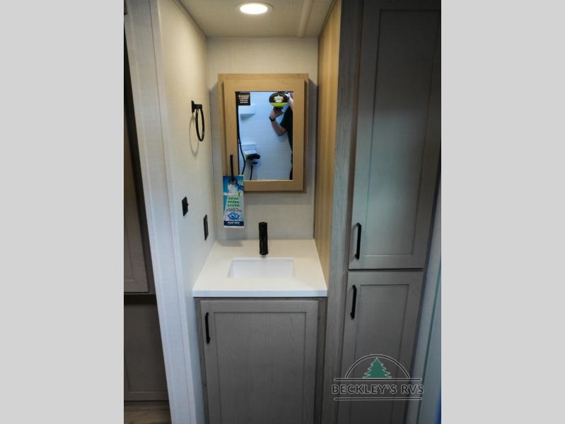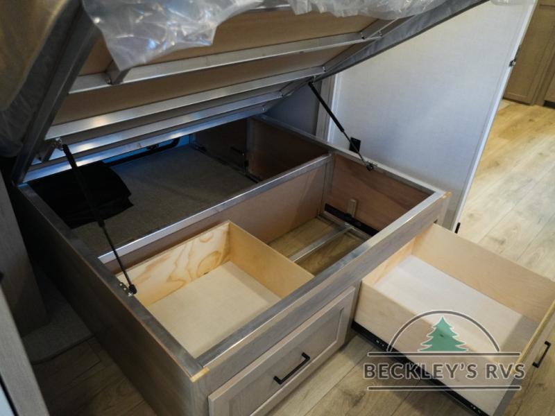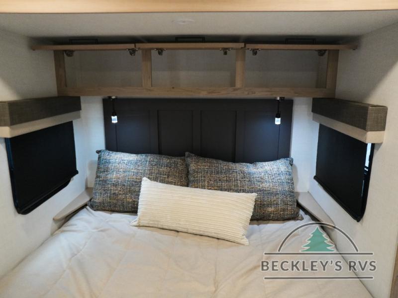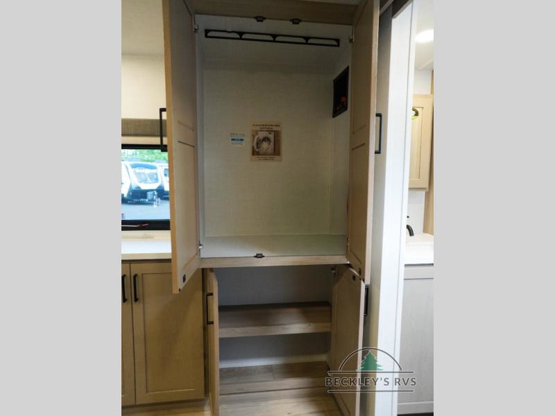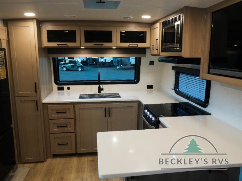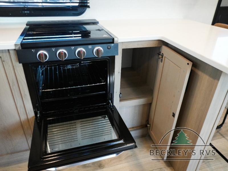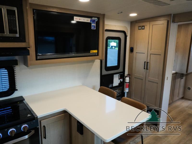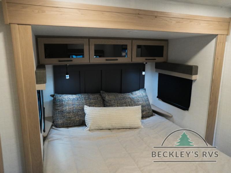 This travel trailer is the best option for you and your partner! The lavish full rear bathroom features a spacious layout and a convenient linen closet, perfect for relaxation and refreshment. The elegant bedroom boasts a plush queen bed, ample wardrobe space, and stylish dresser, creating a serene retreat. The spacious living room and kitchen combined area is the heart of the trailer, featuring plush theater seating for cozy movie nights, a generous closet for storing essentials, and a 12V Smart TV for entertainment on the go. Plus, the expansive countertop with chairs provides a perfect spot for gourmet meals or socializing, while the premium three-burner cooktop, well-stocked kitchen pantry, and high-performance microwave make meal prep and cooking a true delight.