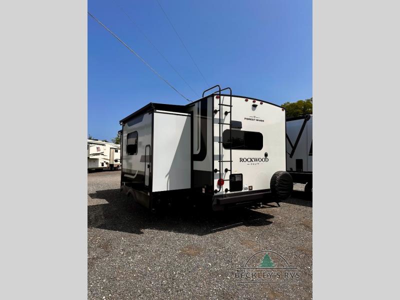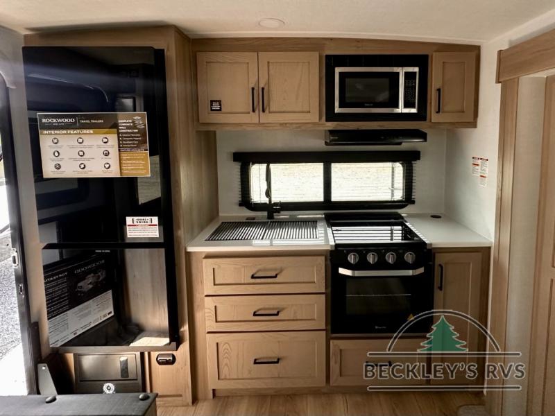 Each Rockwood Mini Lite travel trailer by Forest River is constructed with a fully laminated one-piece walkable roof, sleek frameless windows, and a six-sided full aluminum frame for strength and durability. The 12V thermostatically controlled heated tanks, plus radiant foil in the underbelly will allow you to camp well into the colder months, and the 200W roof solar panel will be perfect for a little off-gridding. Each model includes solid surface kitchen countertops, hidden hinge cabinet doors, roller shades, plus many more interior features. Having an AIR 360+ omnidirectional antenna with WiFi prep on board gives you the option to get some work done if it's needed, and the power tongue jack provides hassle-free set up, so you can enjoy more time relaxing!
