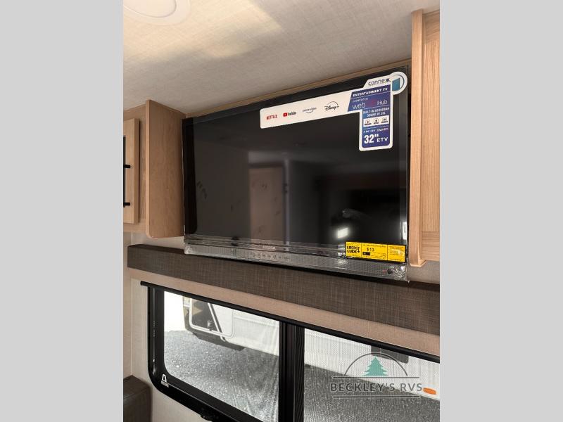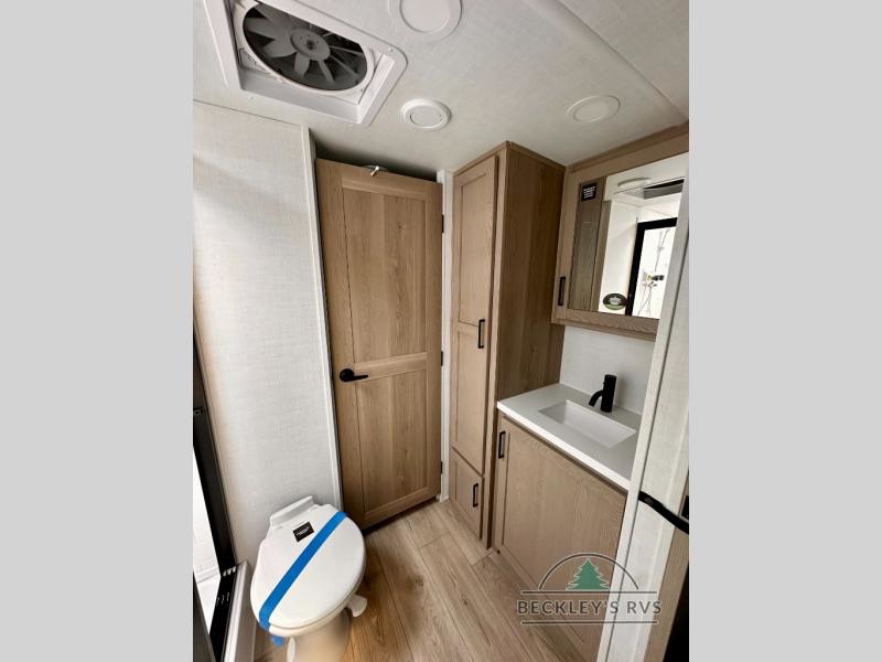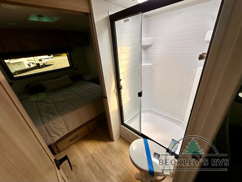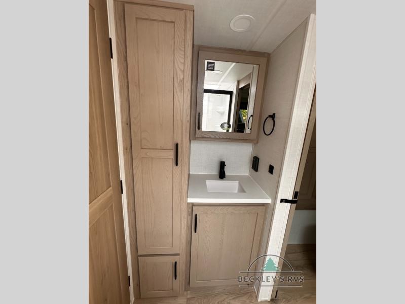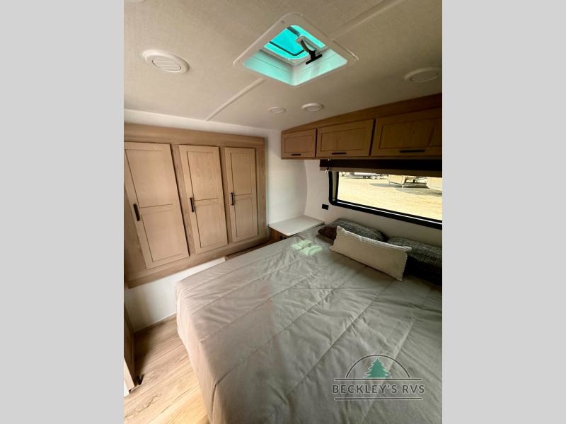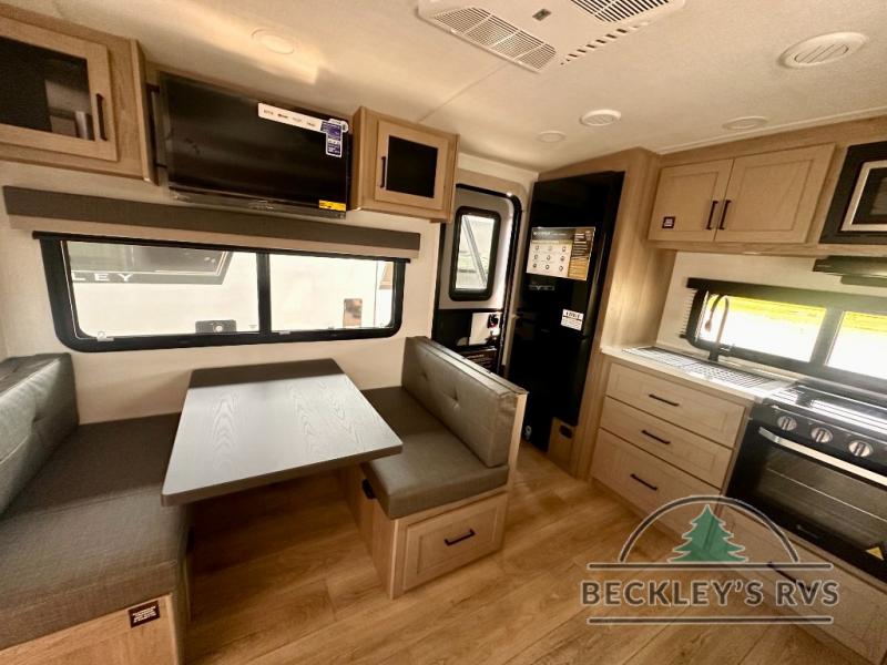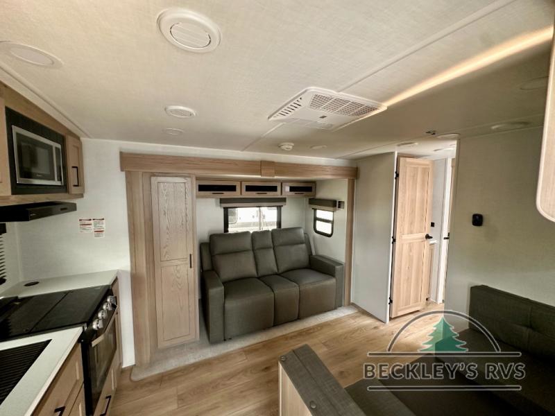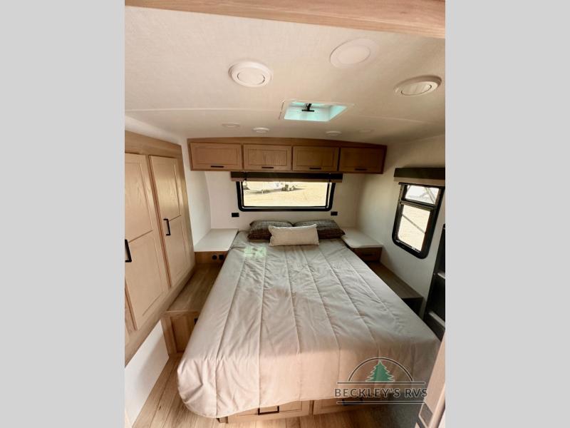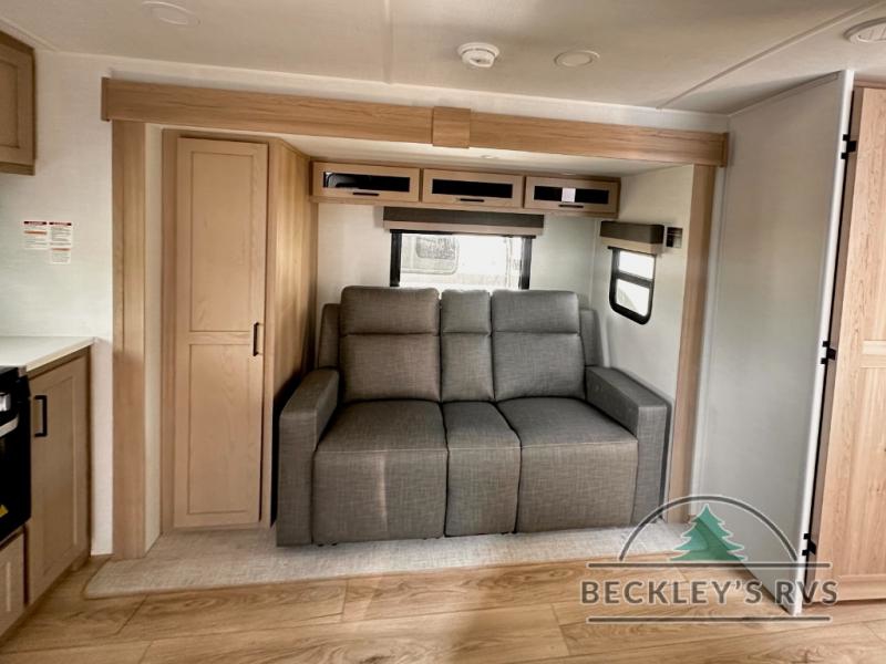 You and your spouse will have a great time camping in this travel trailer! You will have your own RV queen bed to sleep on in the front private bedroom, and an optional TV can be added if you enjoy the morning news in bed. Breakfast can be made on the three burner cooktop in the rear kitchen, or head outdoors to cook on the outside griddle. The 67" theater seating with cupholders will provide a place to relax and dine together, and the spacious walk-through bath will allow you to clean up before you head out for the day. This model includes plenty of storage space, including a pantry for your snacks, a wardrobe slide out in the bedroom, plus a drop-frame pass-through storage for larger camp gear!