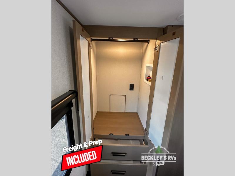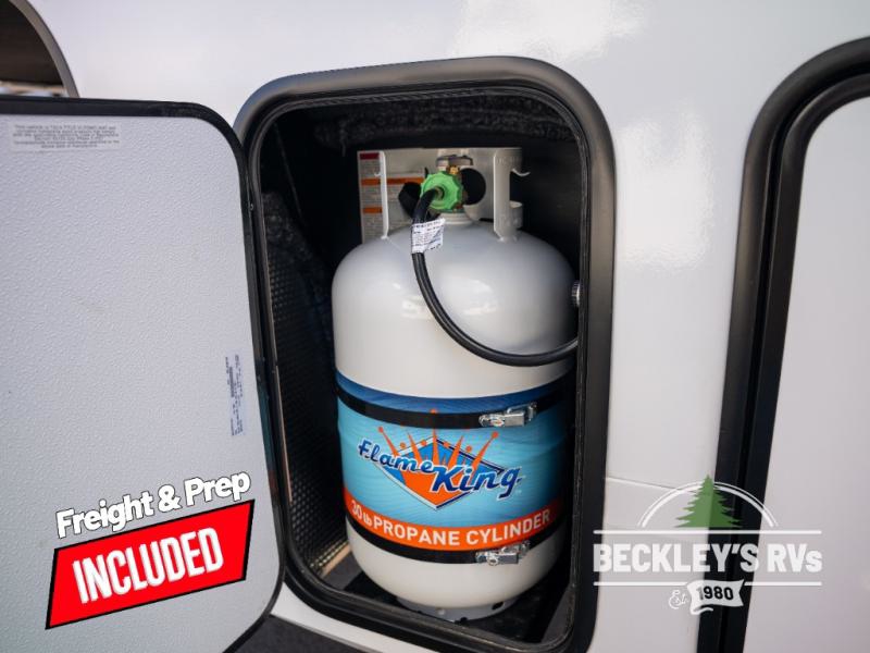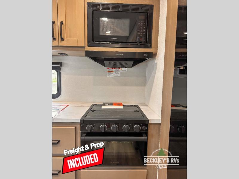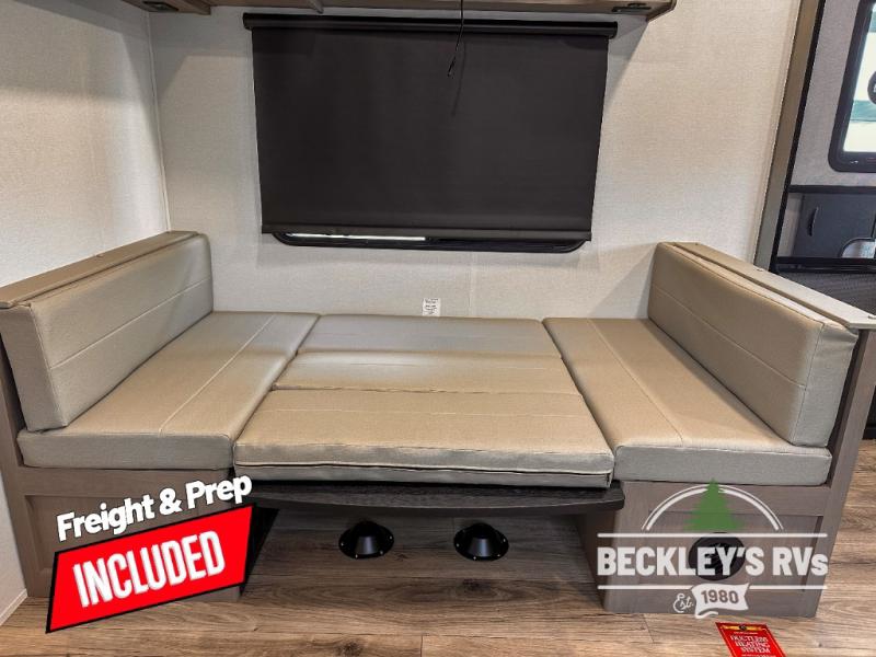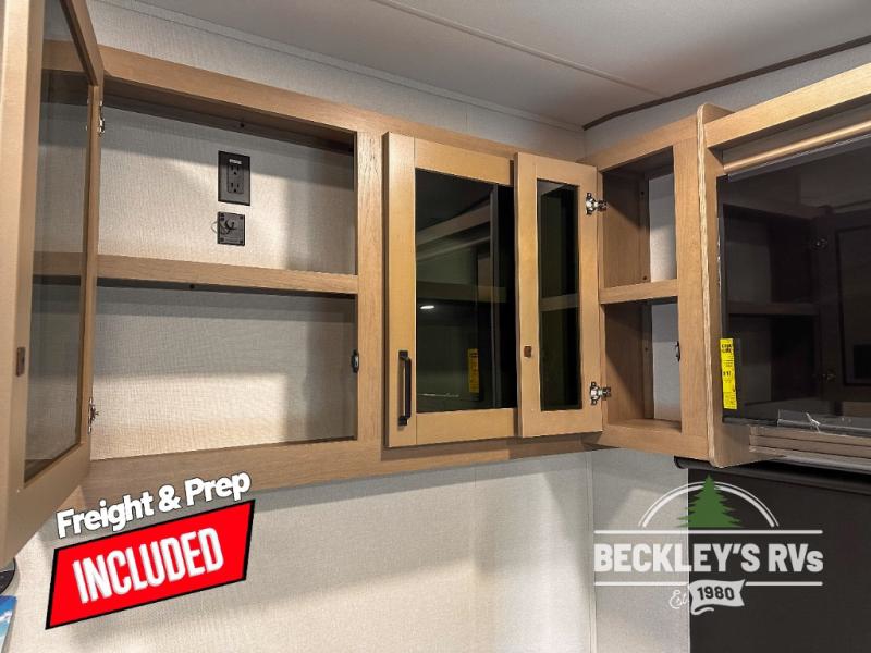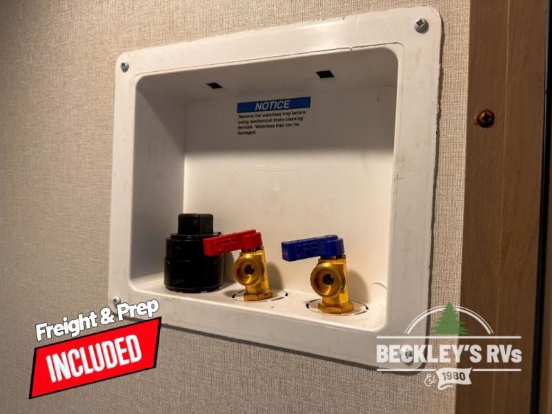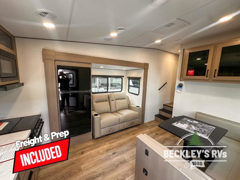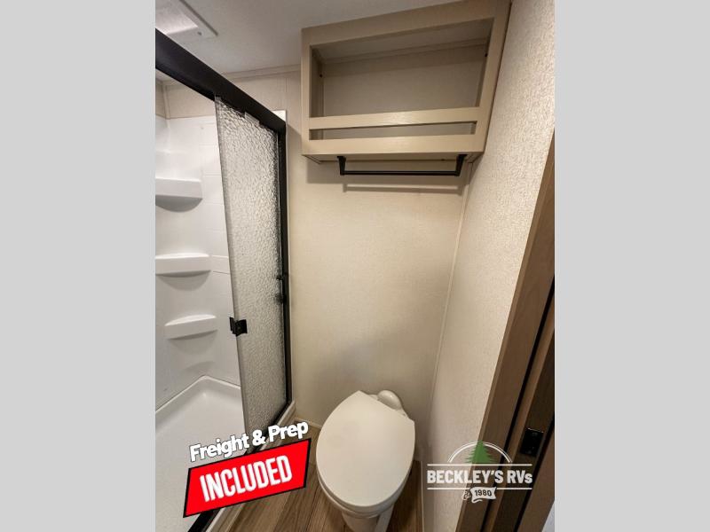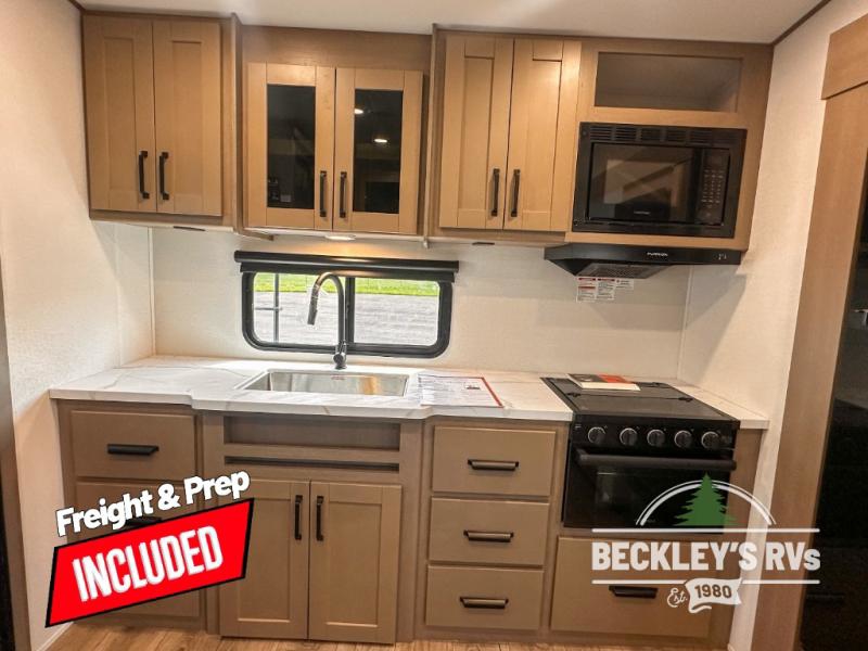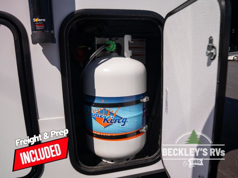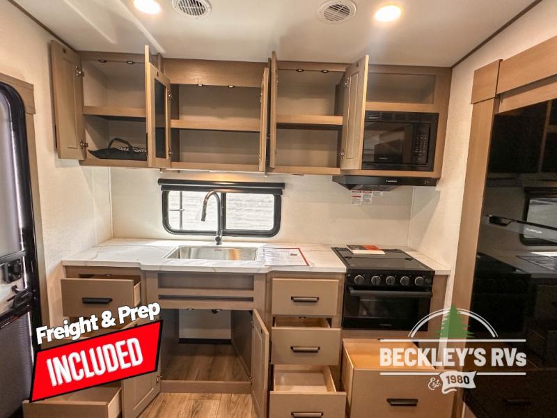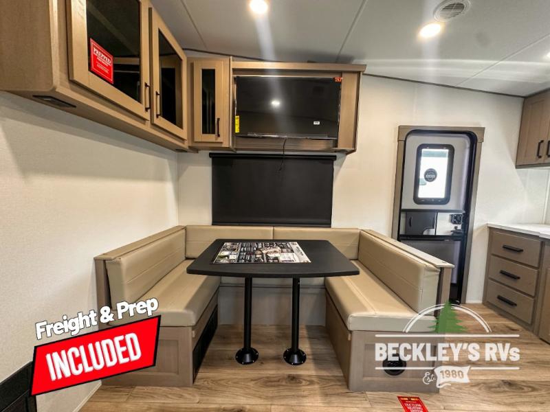 This rear kitchen fifth wheel is sure to meet all of your camping needs! Since the exterior length is only 26' 11", you can easily maneuver in and out of campgrounds. The rear kitchen includes ample counter space to prep meals, a three burner cooktop, and overhead storage for all your necessities. There is a 10 cu. ft. 12V refrigerator within the slide out that also includes the theater seating, and the U-shaped dinette provides a place to dine or play a card game. You will appreciate having convenient storage by the entry door, along with pull-out pet bowls, a functional wardrobe closet in the bedroom and an exterior pass-thru for belongings and camping gear. When you're ready to turn in for the night, the queen bed is sure to bring a great night's rest, while your guests sleep on the booth dinette or optional tri-fold sofa if you replace the theater seating!