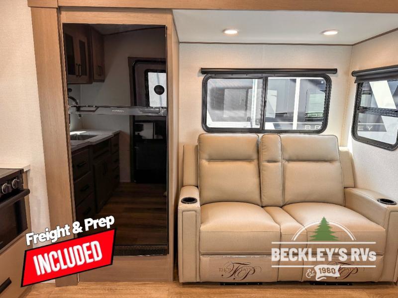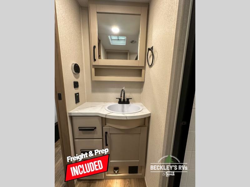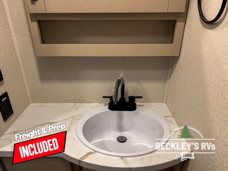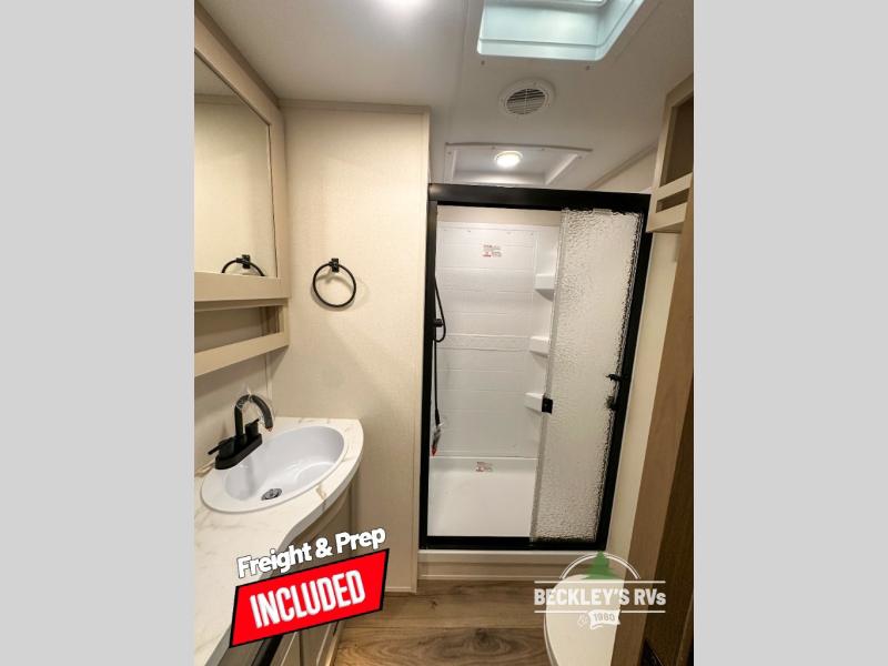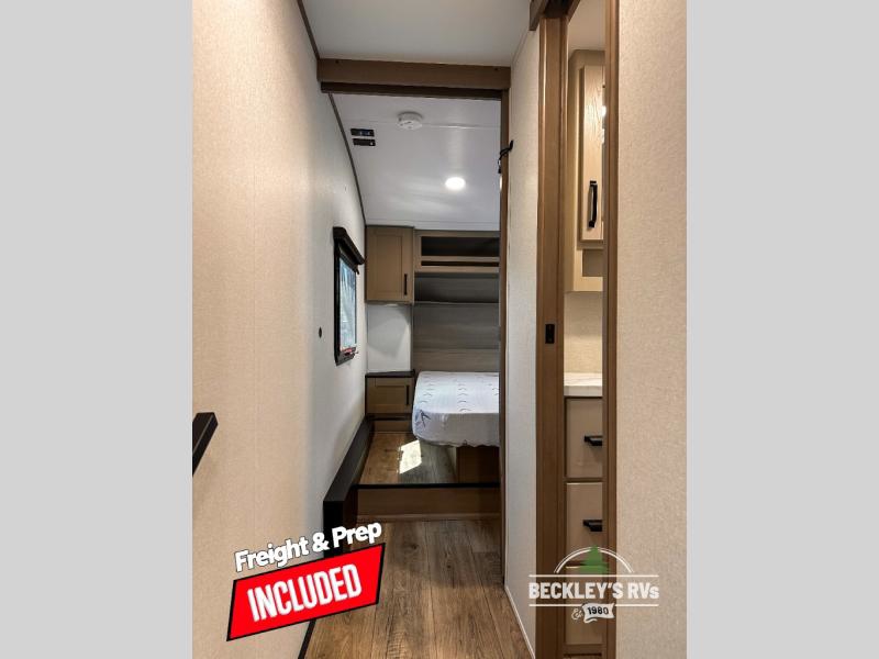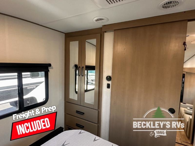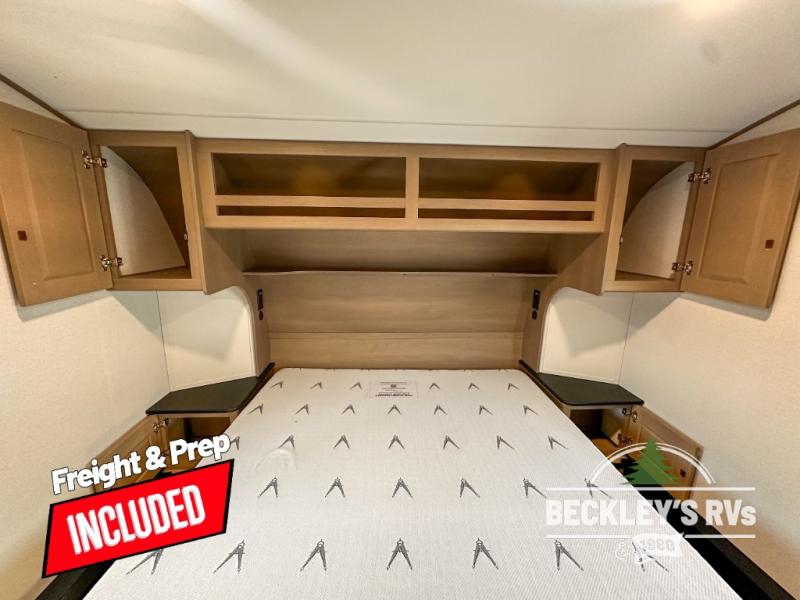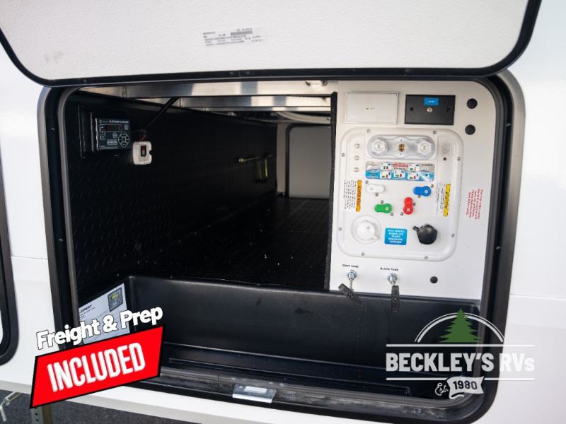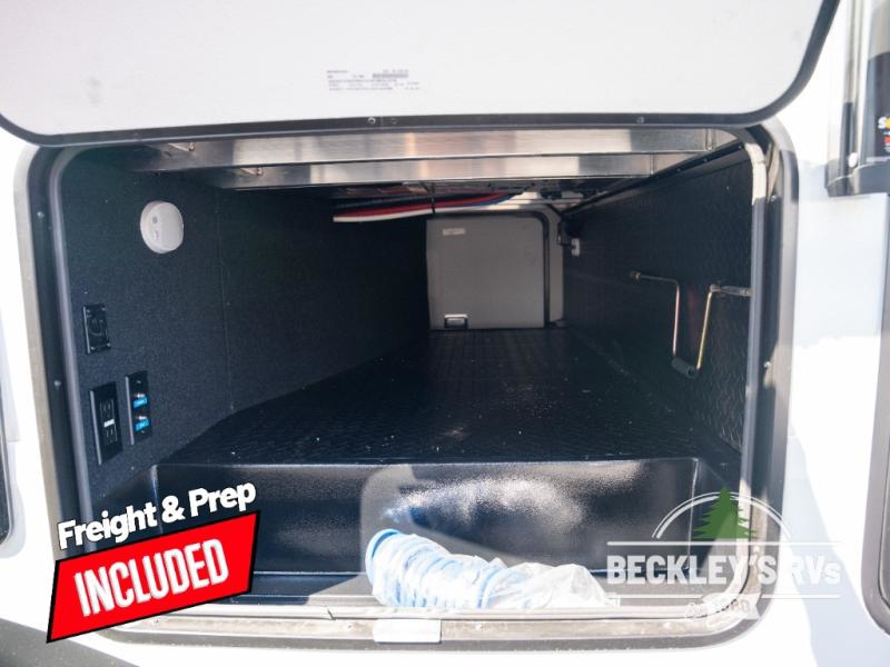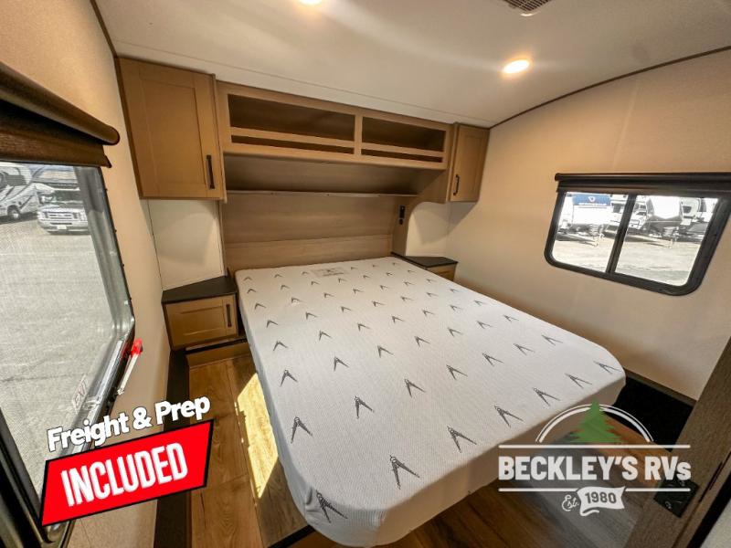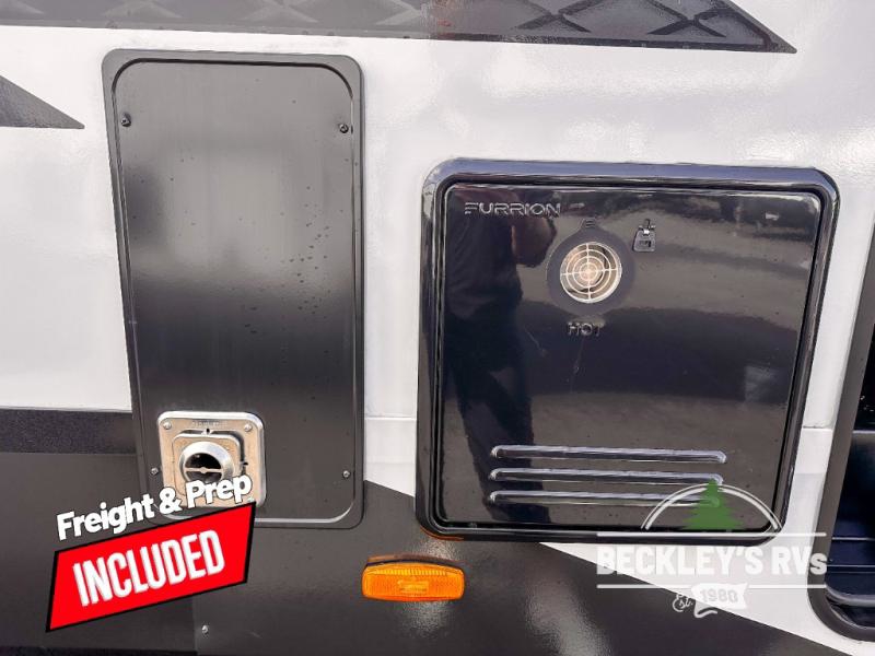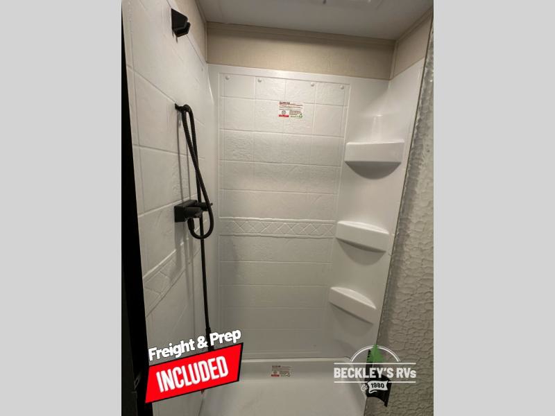This rear kitchen fifth wheel is sure to meet all of your camping needs! Since the exterior length is only 26' 11", you can easily maneuver in and out of campgrounds. The rear kitchen includes ample counter space to prep meals, a three burner cooktop, and overhead storage for all your necessities. There is a 10 cu. ft. 12V refrigerator within the slide out that also includes the theater seating, and the U-shaped dinette provides a place to dine or play a card game. You will appreciate having convenient storage by the entry door, along with pull-out pet bowls, a functional wardrobe closet in the bedroom and an exterior pass-thru for belongings and camping gear. When you're ready to turn in for the night, the queen bed is sure to bring a great night's rest, while your guests sleep on the booth dinette or optional tri-fold sofa if you replace the theater seating!