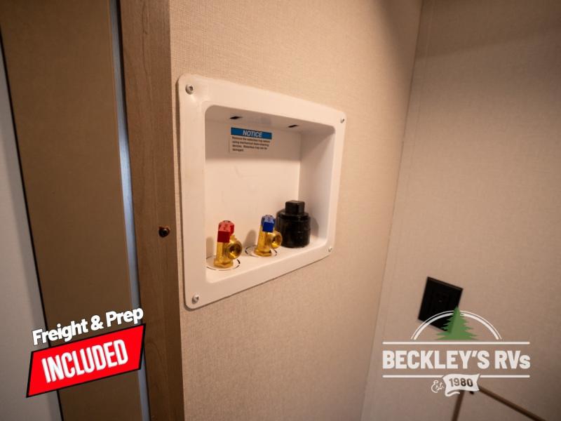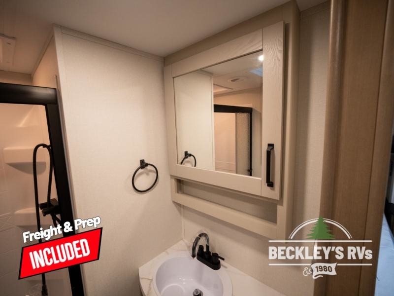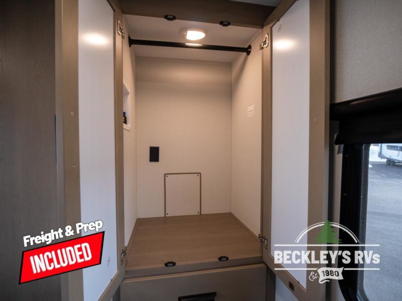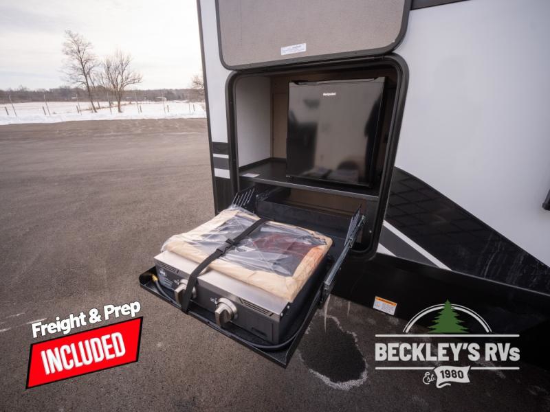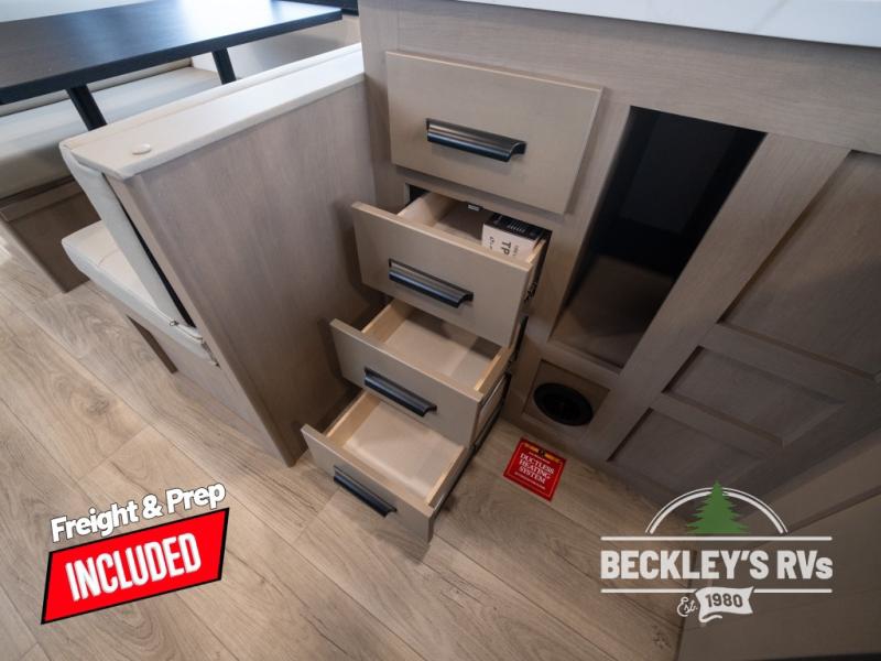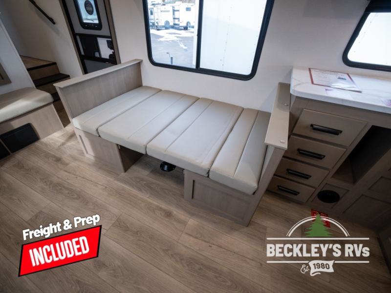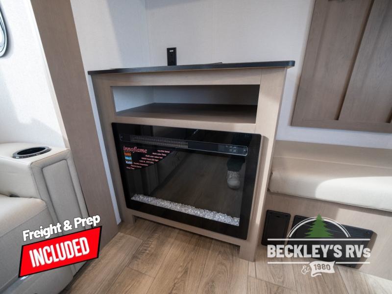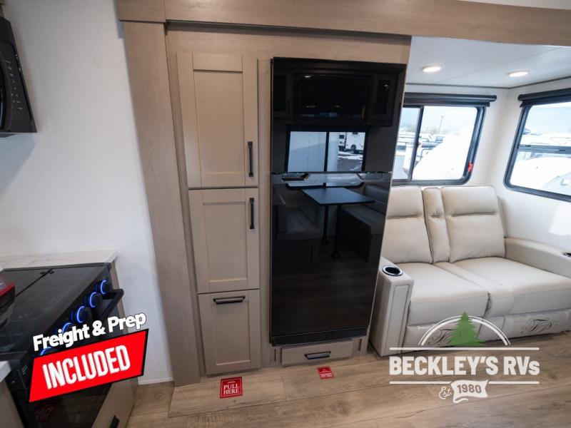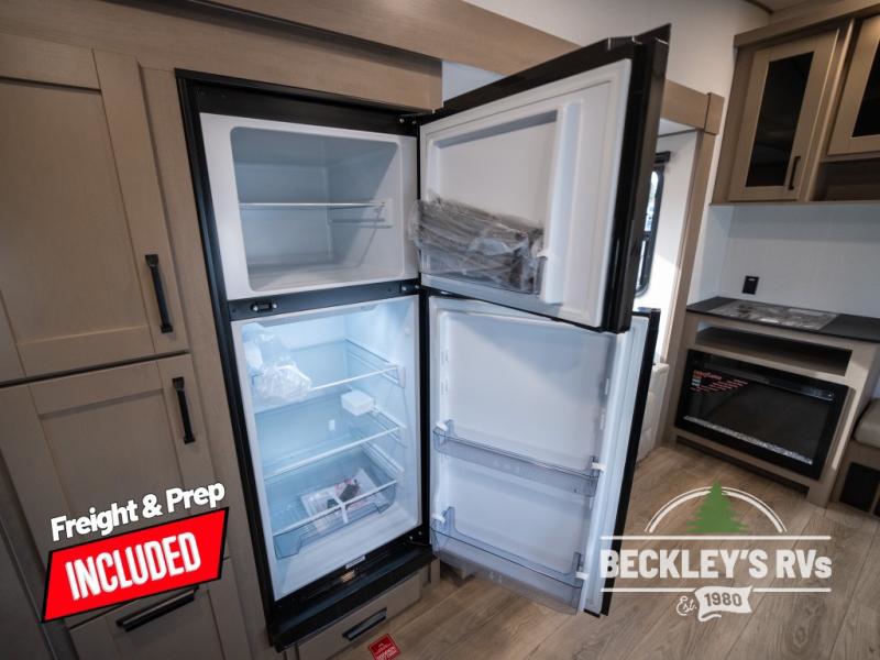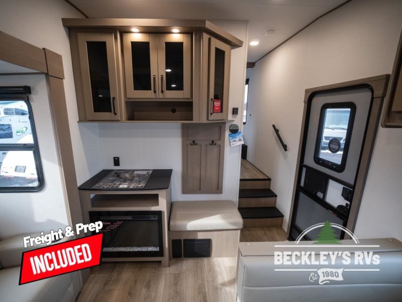 At the front of this fifth wheel, a private bedroom offers a walk-around 60" x 80" queen bed for restful comfort, complemented by dual wardrobes for convenient clothing storage. Down the hall, the full bathroom includes a 30" x 36" residential walk-in shower, a large, mirrored medicine cabinet, and linen storage for towels and toiletries. The middle living area features a cozy fireplace and booth dinette with a TV above perfect for dining while enjoying your favorite shows. Opposite, a slide-out holds the 62" theater seating for relaxing after a day of adventure, alongside a 10-cu. ft. refrigerator and pantry for all your groceries and dry goods. At the rear, an L-shaped kitchen provides generous counter space, a deep-seated stainless-steel sink, and a 30" microwave, allowing you to prepare meals comfortably without relying on campground facilities.