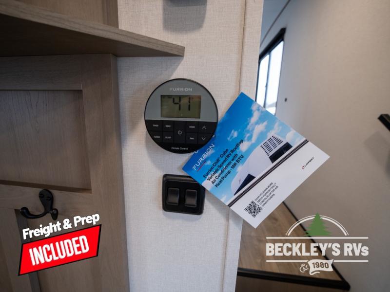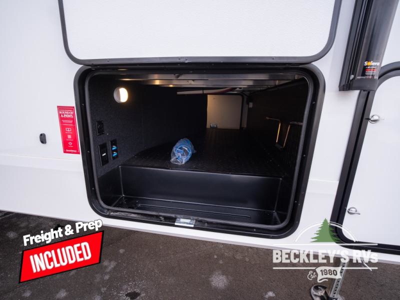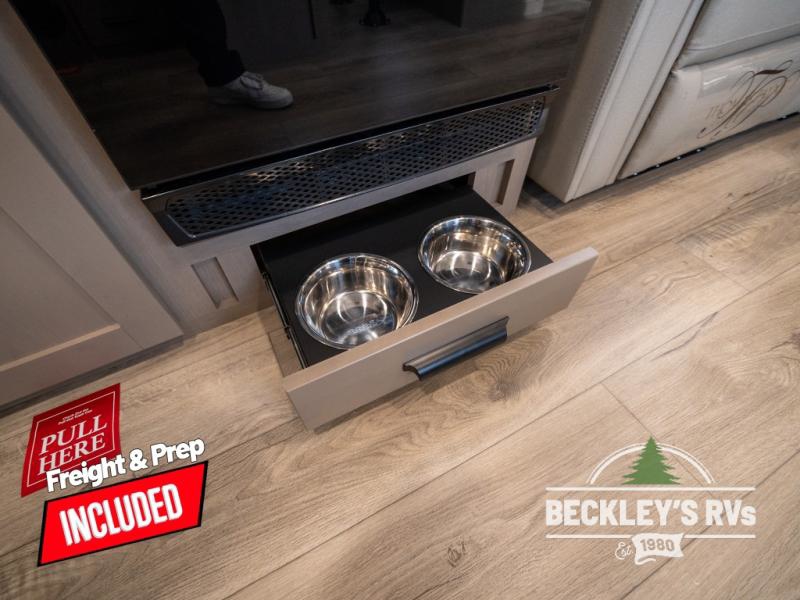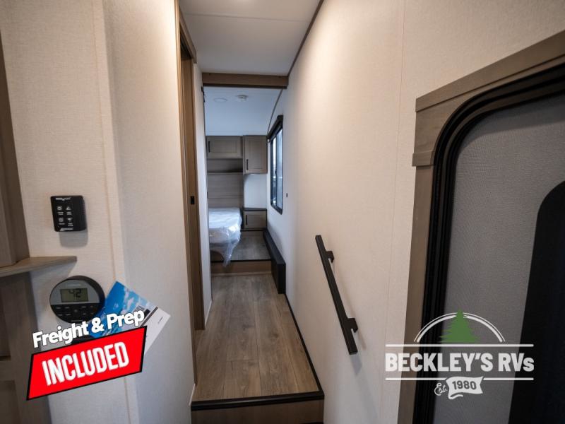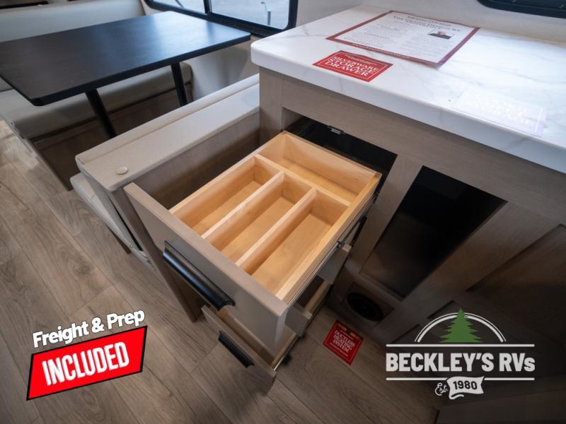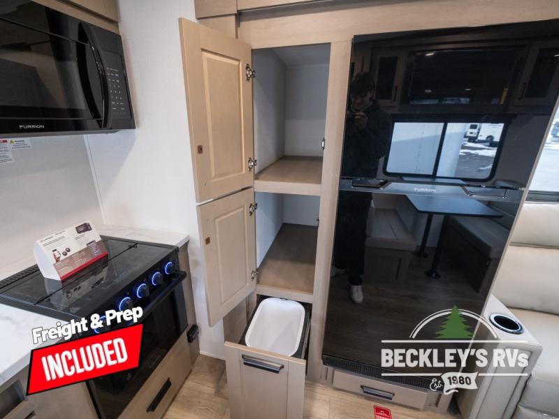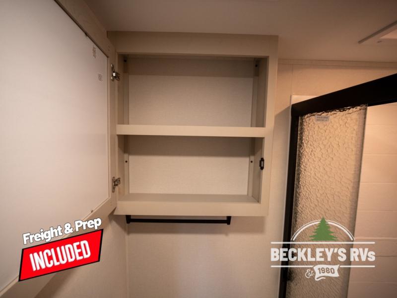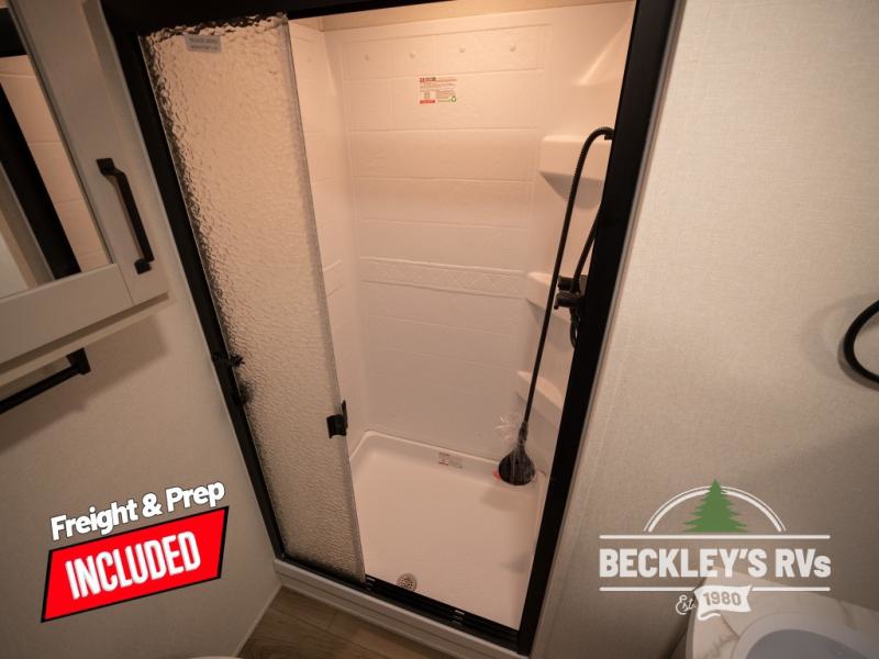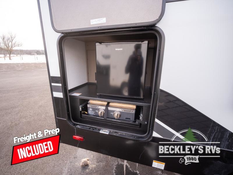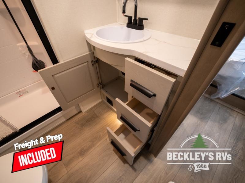 At the front of this fifth wheel, a private bedroom offers a walk-around 60" x 80" queen bed for restful comfort, complemented by dual wardrobes for convenient clothing storage. Down the hall, the full bathroom includes a 30" x 36" residential walk-in shower, a large, mirrored medicine cabinet, and linen storage for towels and toiletries. The middle living area features a cozy fireplace and booth dinette with a TV above perfect for dining while enjoying your favorite shows. Opposite, a slide-out holds the 62" theater seating for relaxing after a day of adventure, alongside a 10-cu. ft. refrigerator and pantry for all your groceries and dry goods. At the rear, an L-shaped kitchen provides generous counter space, a deep-seated stainless-steel sink, and a 30" microwave, allowing you to prepare meals comfortably without relying on campground facilities.
