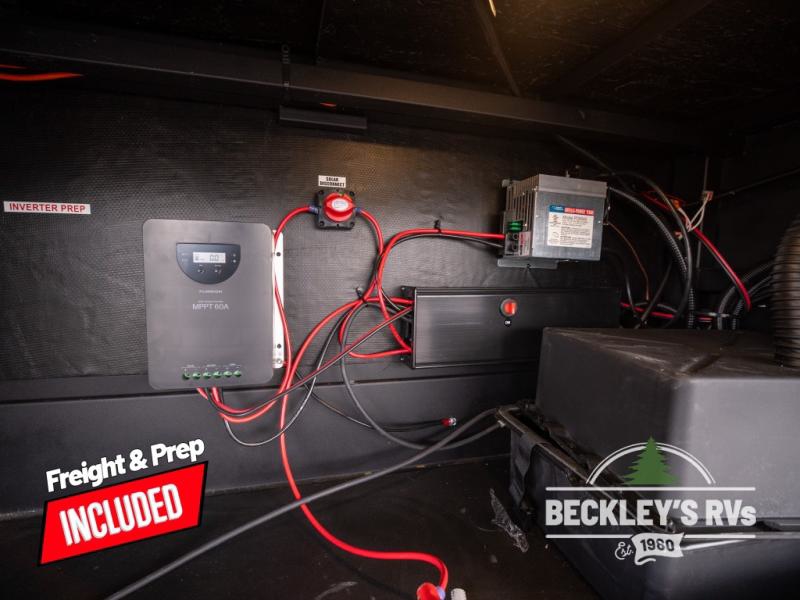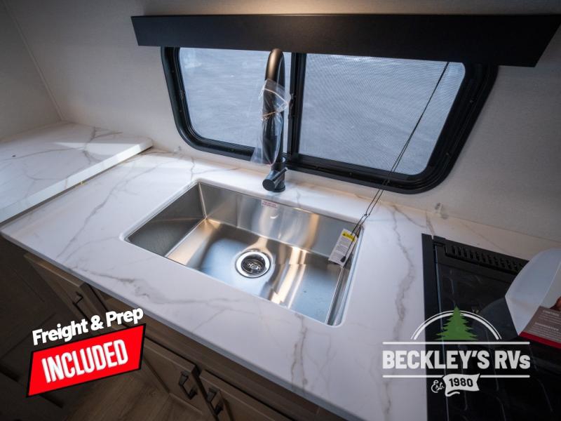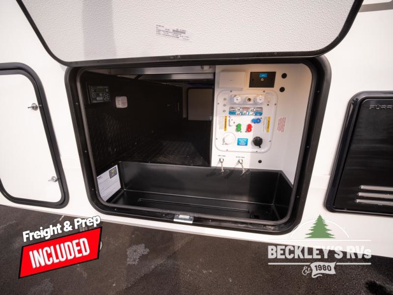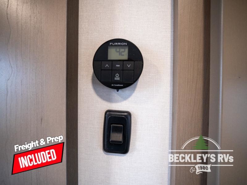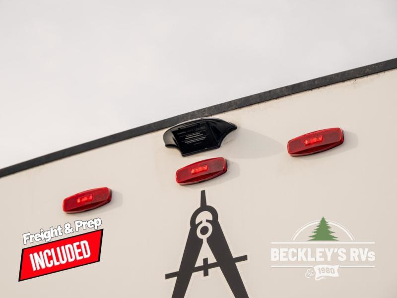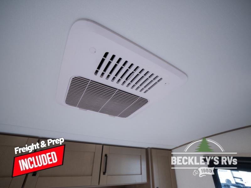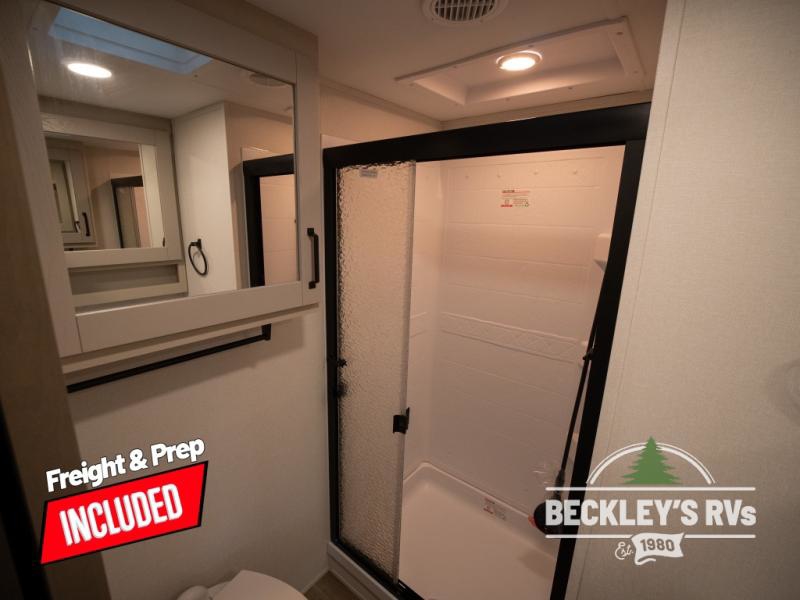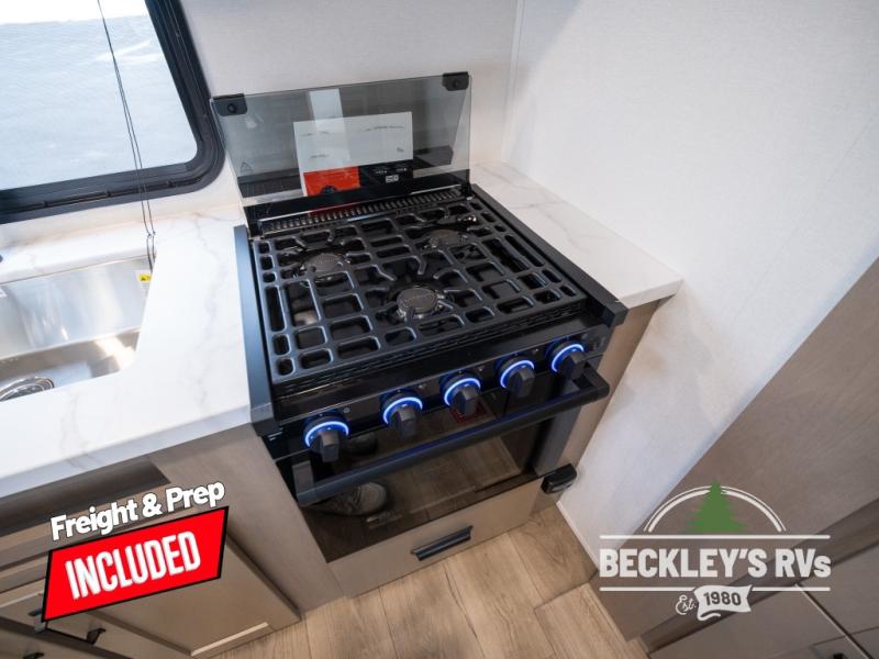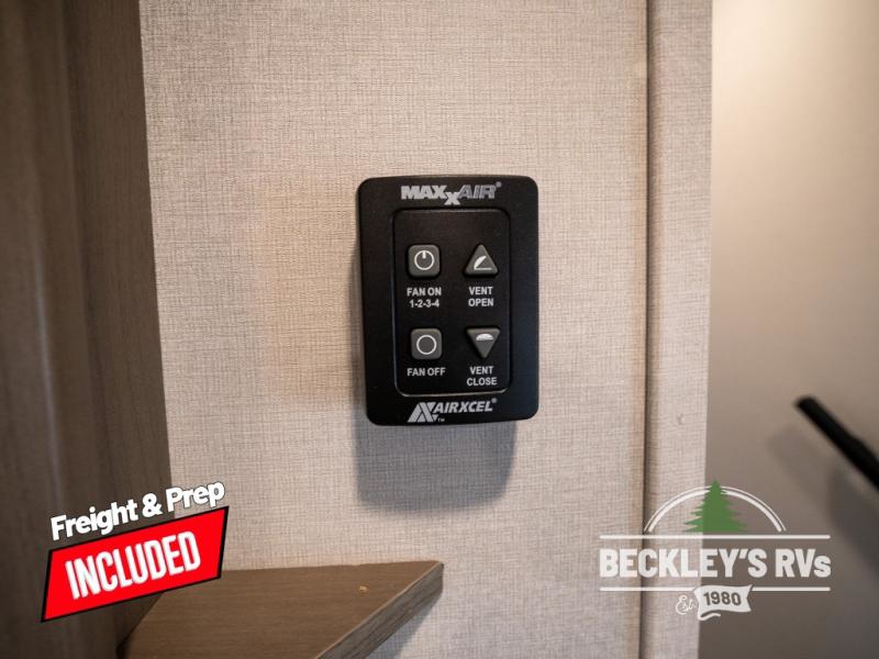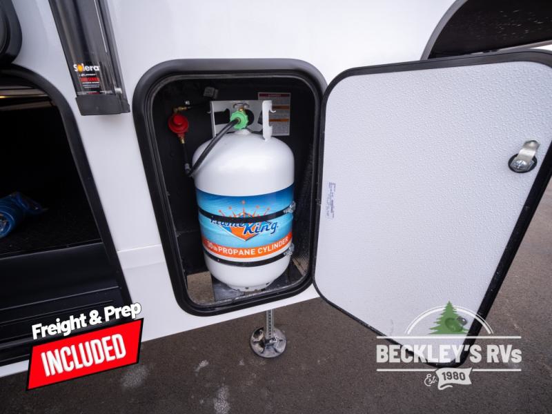 At the front of this fifth wheel, a private bedroom offers a walk-around 60" x 80" queen bed for restful comfort, complemented by dual wardrobes for convenient clothing storage. Down the hall, the full bathroom includes a 30" x 36" residential walk-in shower, a large, mirrored medicine cabinet, and linen storage for towels and toiletries. The middle living area features a cozy fireplace and booth dinette with a TV above perfect for dining while enjoying your favorite shows. Opposite, a slide-out holds the 62" theater seating for relaxing after a day of adventure, alongside a 10-cu. ft. refrigerator and pantry for all your groceries and dry goods. At the rear, an L-shaped kitchen provides generous counter space, a deep-seated stainless-steel sink, and a 30" microwave, allowing you to prepare meals comfortably without relying on campground facilities.