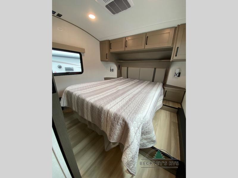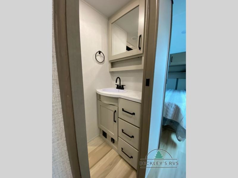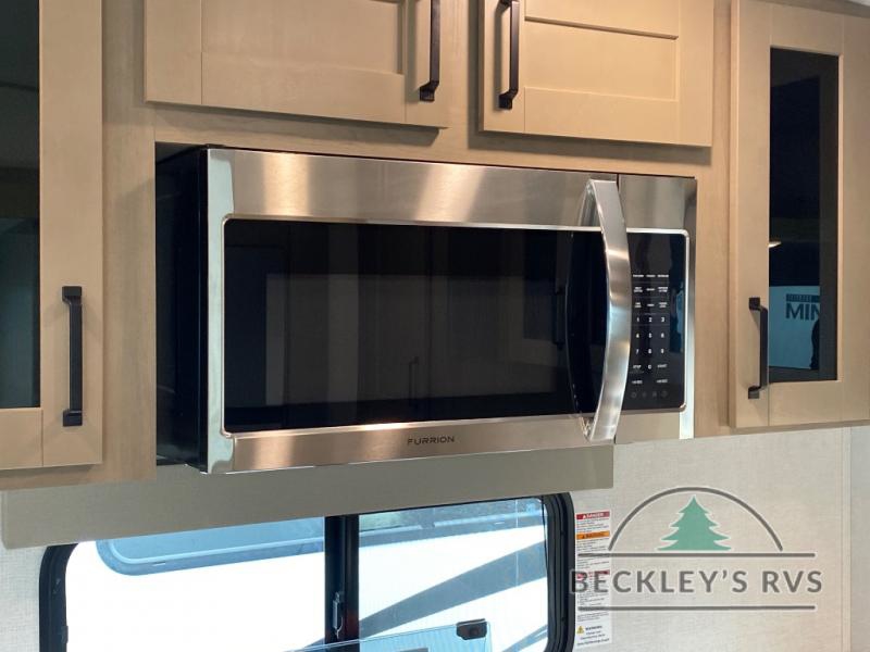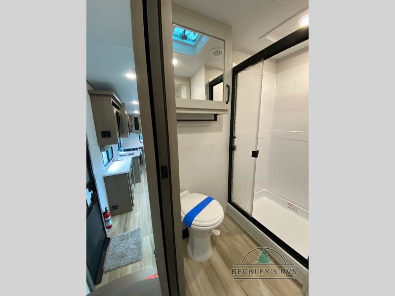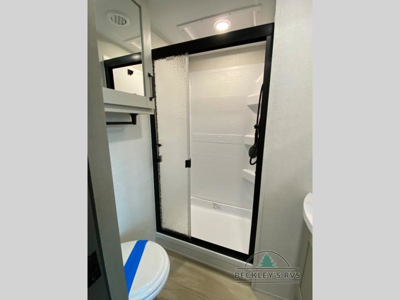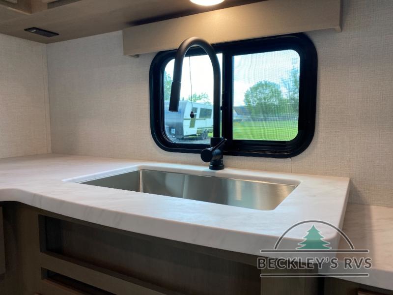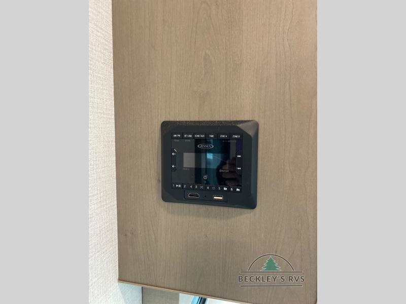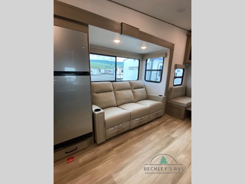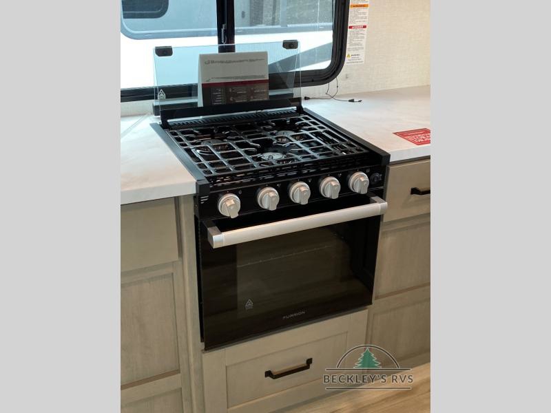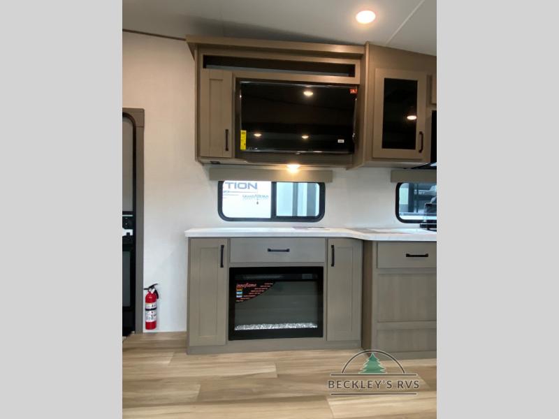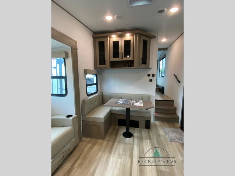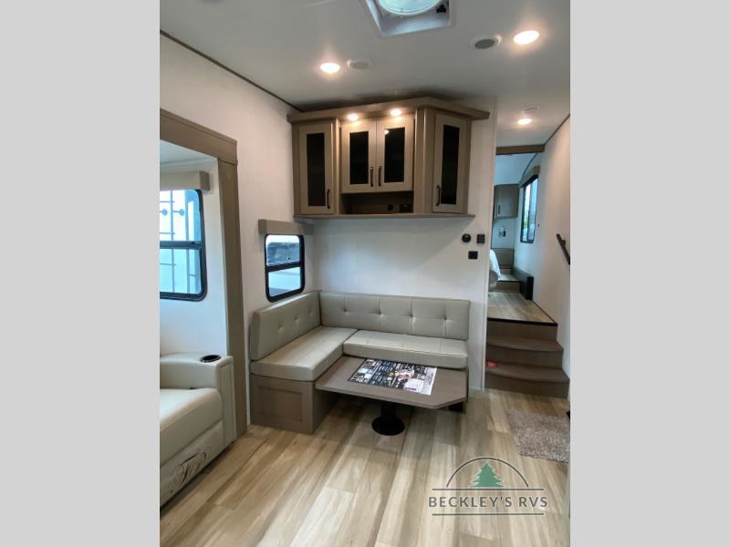 You will love this fifth wheel featuring a single slide for added interior living space and all the comforts and conveniences it provides you while you travel. The slide features a 78" theater seat plus there is a breakfast nook for more seating. Both can easily view the entertainment center with 40" TV. A rear kitchen indoors provides everything you need to create meals like home while on the road, and if you want to spend as much time outside as possible, then the outdoor griddle will certainly accommodate you for meals. Up front, a cozy private bedroom with queen bed, wardrobe, and overhead cabinets. Right next door, you will find a large walk-in shower, as well as a toilet, and a vanity with sink and linen cabinet for your towels and toiletries. You will also love the full unobstructed pass-through compartment for all of your gear, plus so much more!