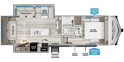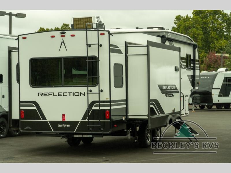 Each Reflection 100 Series fifth wheel by Grand Design is affordable and packed with luxury for unforgettable camping memories! The MorRyde CRE3000 suspension system and Goodyear Endurance tires will provide smooth towing from home to campground. And the solar package with a 180W solar panel, 60 Amp charge controller and 12V refrigerator will allow you to camp for longer periods of time and in more locations! A heated and enclosed underbelly with circulating heat is included in the Arctic 4-Seasons Protection Package, along with a double insulated roof and front cap, and thermofoil insulation under the holding tanks so you can camp all year long if you choose. You will appreciate having an on-demand water heater for hot showers after exploring, and the universal all-in-one docking station will let you monitor your RVs tanks levels and functions with ease. These models also include many luxurious interior features, such as premium Congoleum flooring, pleated shades, residential cabinetry, and matte black fixtures and hardware. Don't let the Reflection 100 Series fifth wheels pass you by!