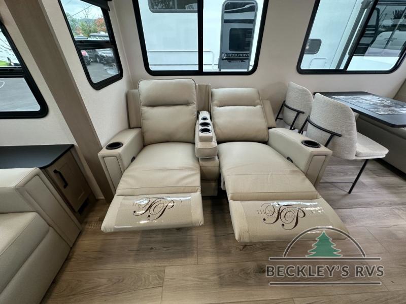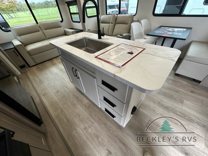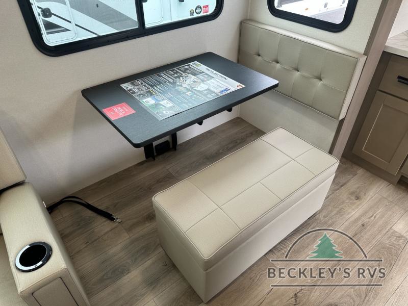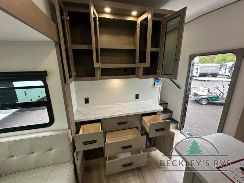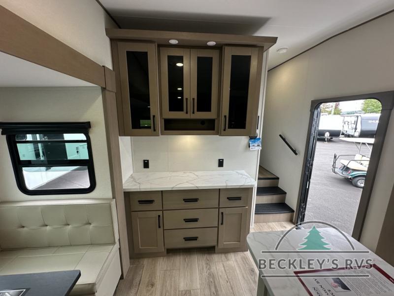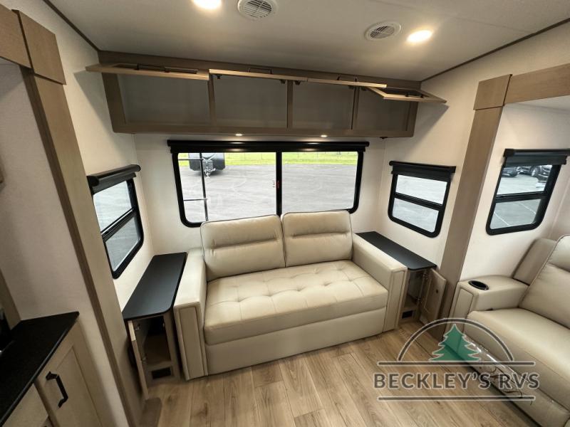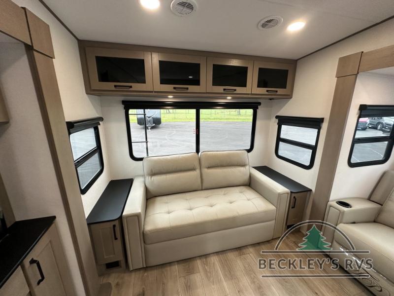 You'll love the amount of space you have in this fifth wheel thanks to the dual opposing slides in the rear living area/kitchen. Your friends and family can relax on the tri-fold sofa or theater seating across from the high-definition 40" LED TV. There is also a booth dinette or you can choose the optional swivel dinette if you prefer that seating. The chef of your group will appreciate having a kitchen island that will provide more counter space, plus there is a hutch with overhead cabinets for nice dishes. A full bath onboard lets you clean up each day and the front private bedroom includes a queen bed just like at home. You'll also love spending time outdoors under the electric awning, and there is an unobstructed pass-thru storage for fishing poles, hiking gear, and camp chairs!