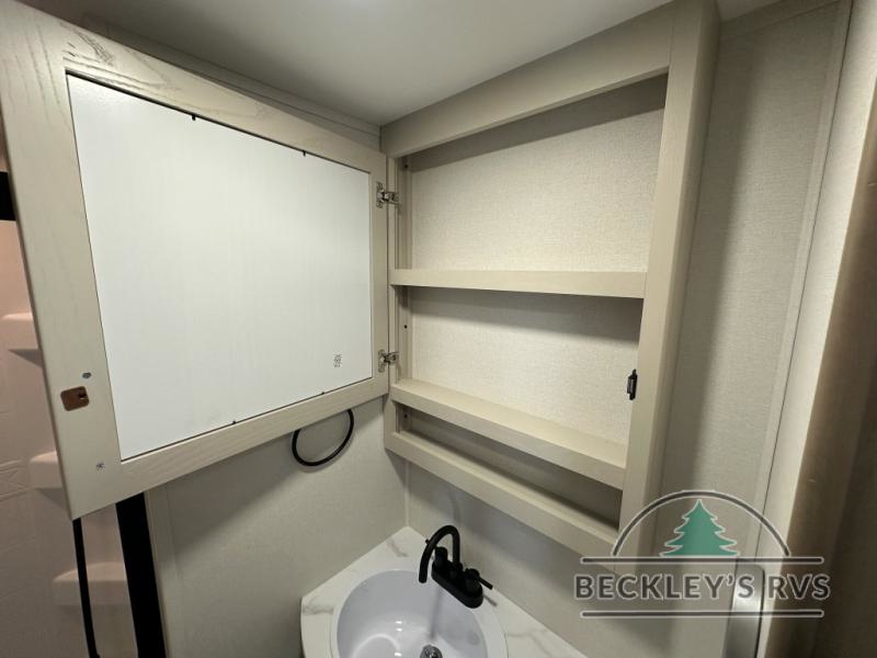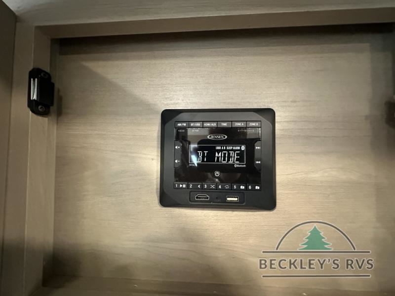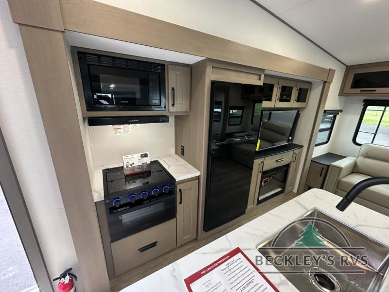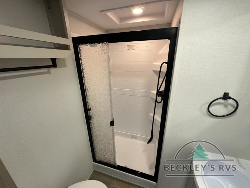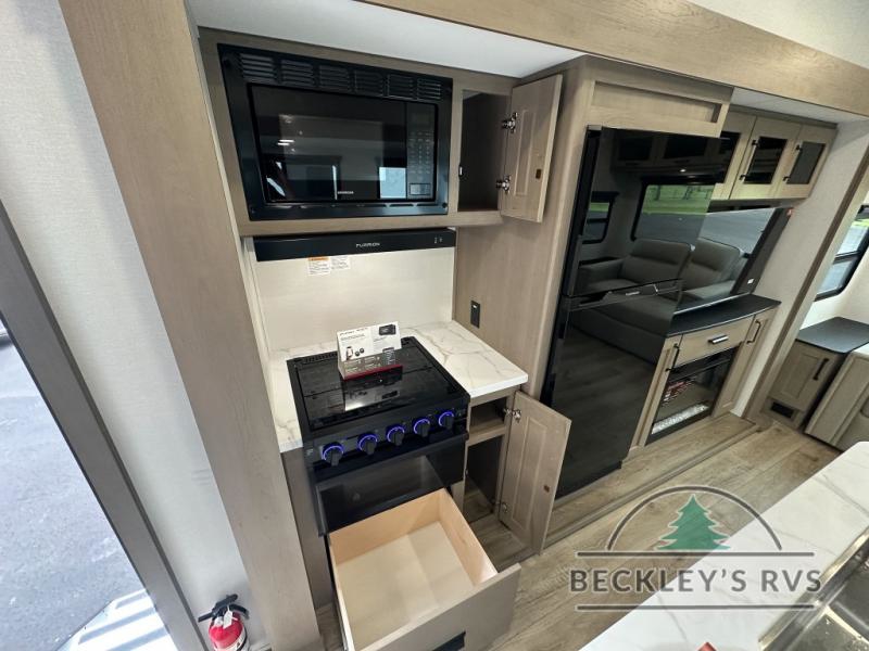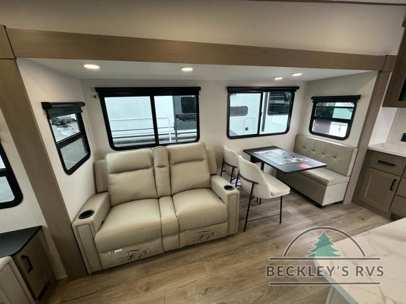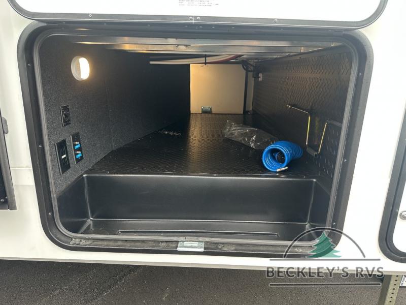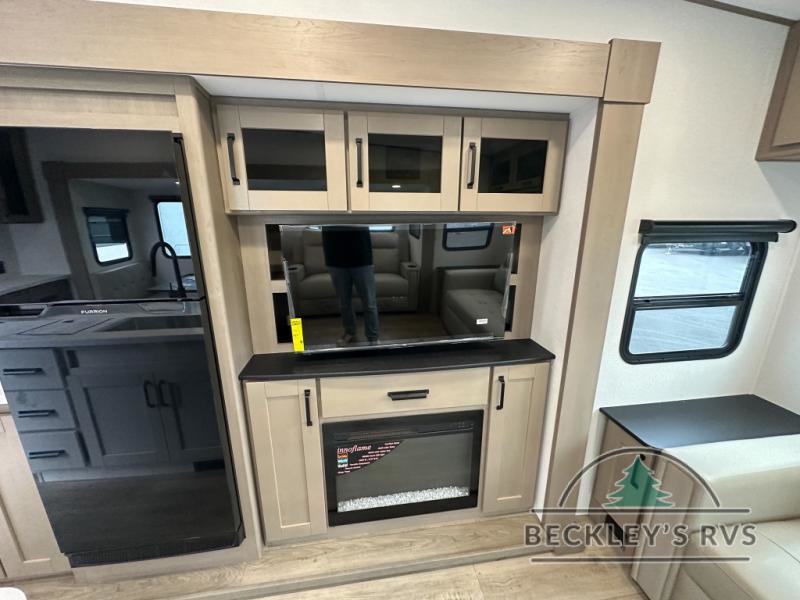 You'll love the amount of space you have in this fifth wheel thanks to the dual opposing slides in the rear living area/kitchen. Your friends and family can relax on the tri-fold sofa or theater seating across from the high-definition 40" LED TV. There is also a booth dinette or you can choose the optional swivel dinette if you prefer that seating. The chef of your group will appreciate having a kitchen island that will provide more counter space, plus there is a hutch with overhead cabinets for nice dishes. A full bath onboard lets you clean up each day and the front private bedroom includes a queen bed just like at home. You'll also love spending time outdoors under the electric awning, and there is an unobstructed pass-thru storage for fishing poles, hiking gear, and camp chairs!