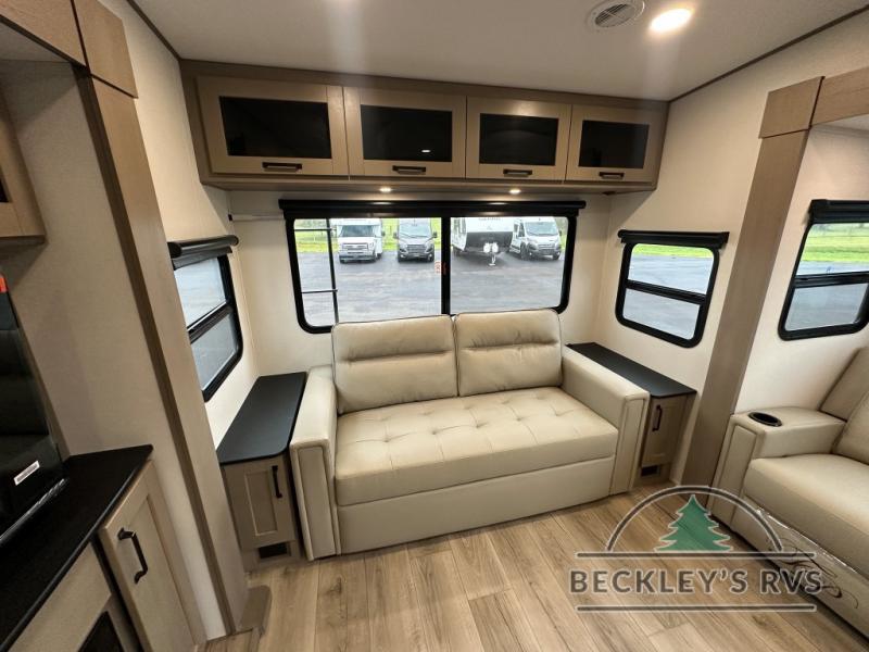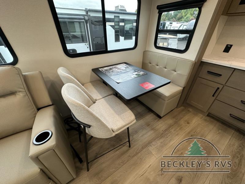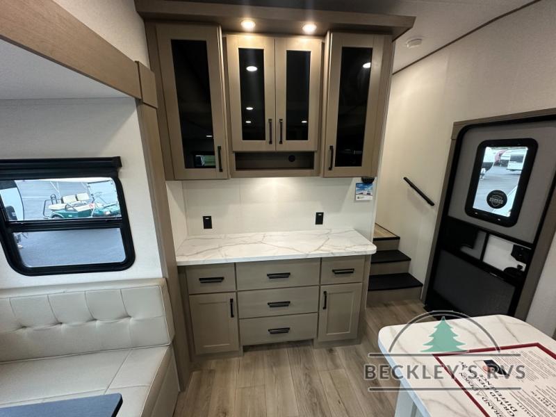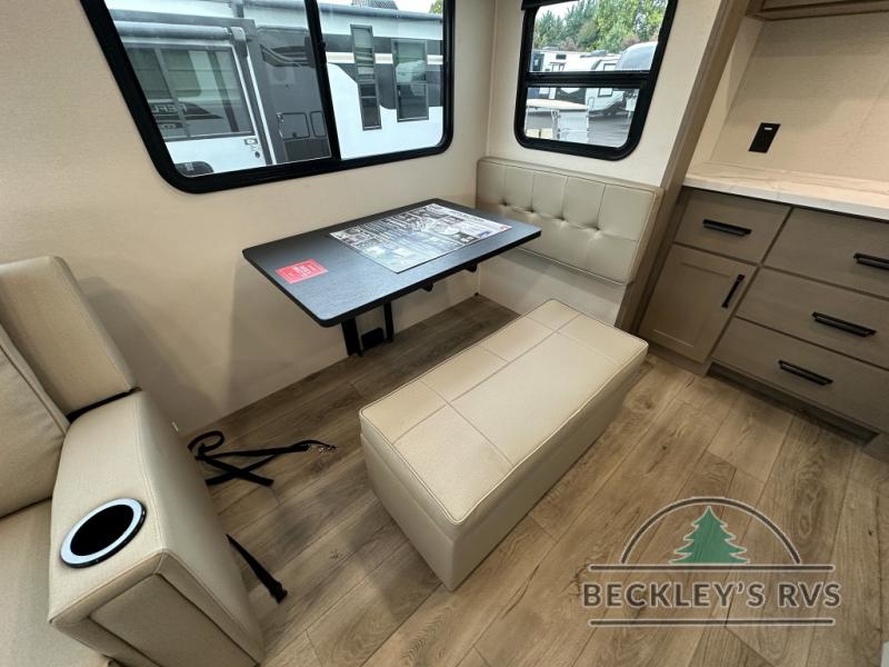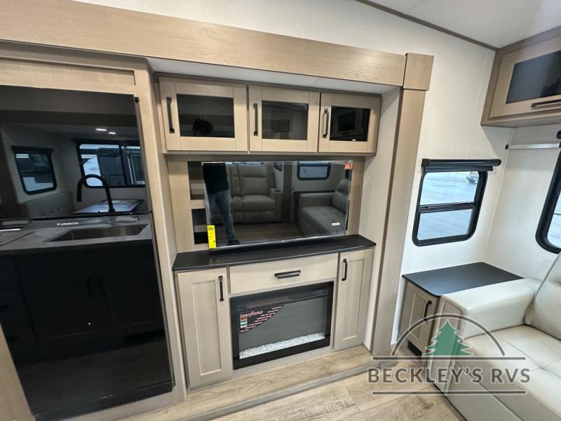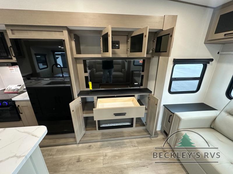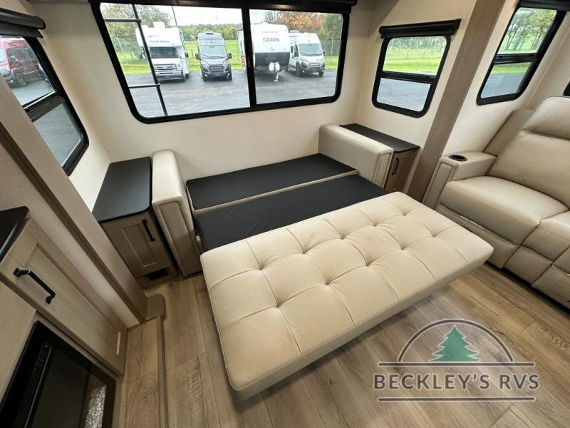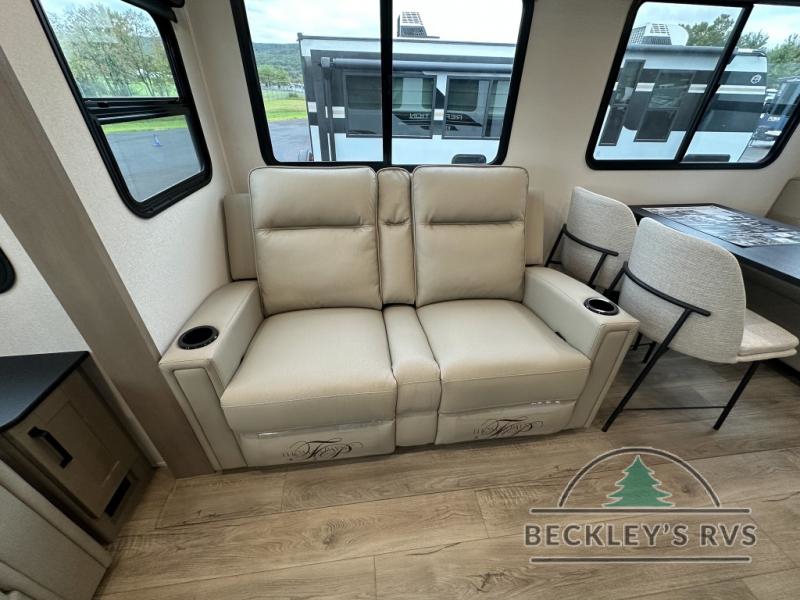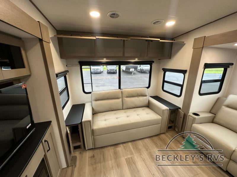 You'll love the amount of space you have in this fifth wheel thanks to the dual opposing slides in the rear living area/kitchen. Your friends and family can relax on the tri-fold sofa or theater seating across from the high-definition 40" LED TV. There is also a booth dinette or you can choose the optional swivel dinette if you prefer that seating. The chef of your group will appreciate having a kitchen island that will provide more counter space, plus there is a hutch with overhead cabinets for nice dishes. A full bath onboard lets you clean up each day and the front private bedroom includes a queen bed just like at home. You'll also love spending time outdoors under the electric awning, and there is an unobstructed pass-thru storage for fishing poles, hiking gear, and camp chairs!