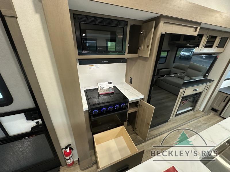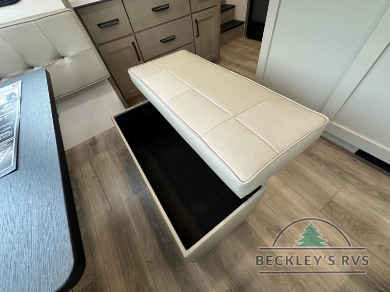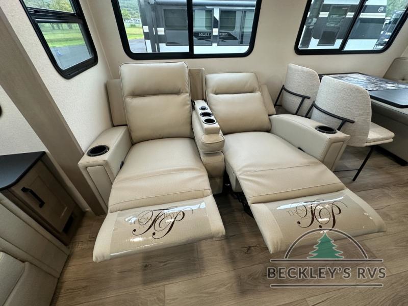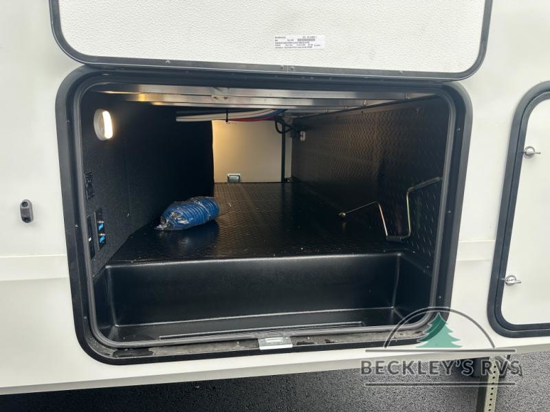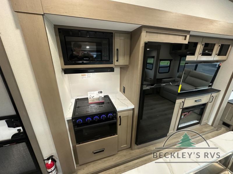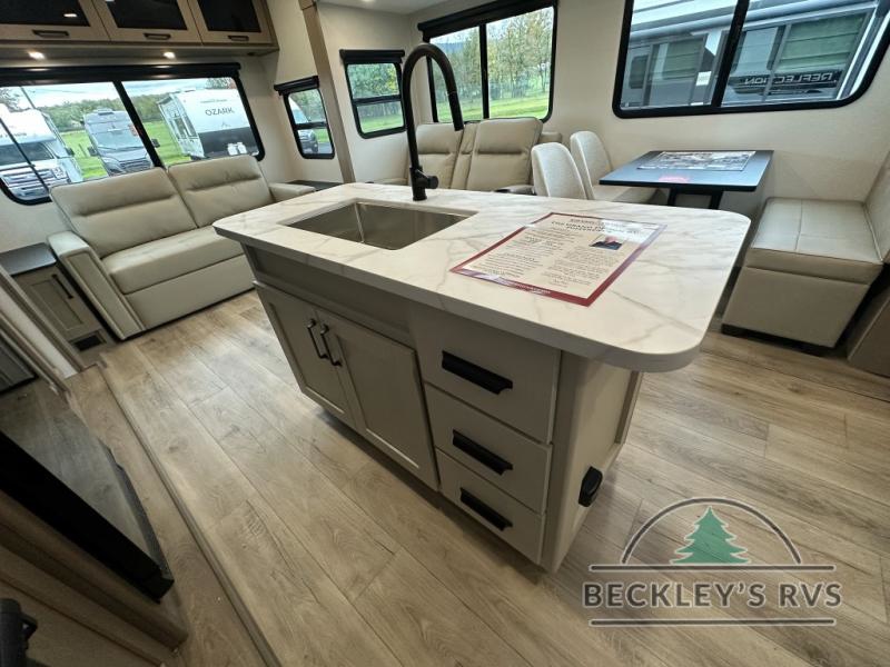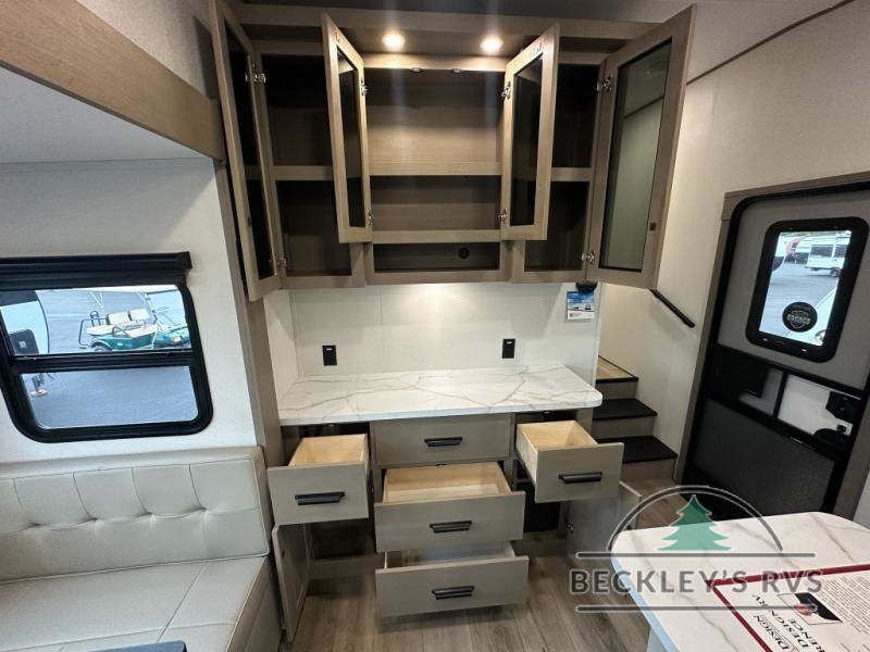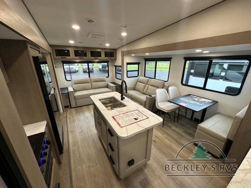 You'll love the amount of space you have in this fifth wheel thanks to the dual opposing slides in the rear living area/kitchen. Your friends and family can relax on the tri-fold sofa or theater seating across from the high-definition 40" LED TV. There is also a booth dinette or you can choose the optional swivel dinette if you prefer that seating. The chef of your group will appreciate having a kitchen island that will provide more counter space, plus there is a hutch with overhead cabinets for nice dishes. A full bath onboard lets you clean up each day and the front private bedroom includes a queen bed just like at home. You'll also love spending time outdoors under the electric awning, and there is an unobstructed pass-thru storage for fishing poles, hiking gear, and camp chairs!