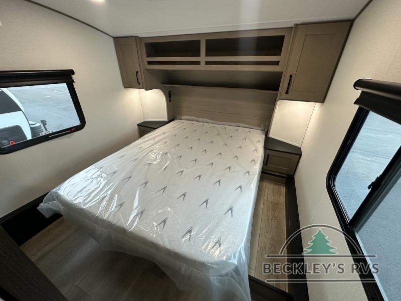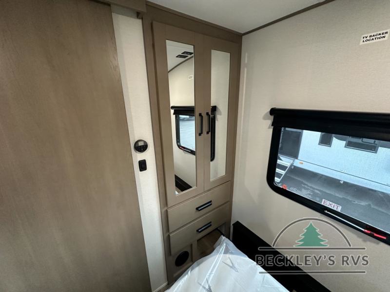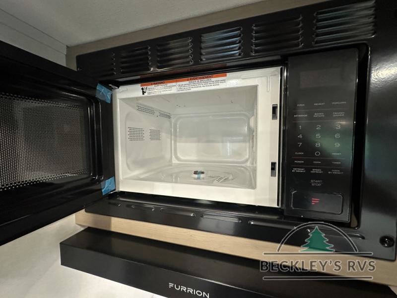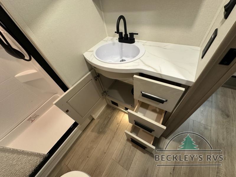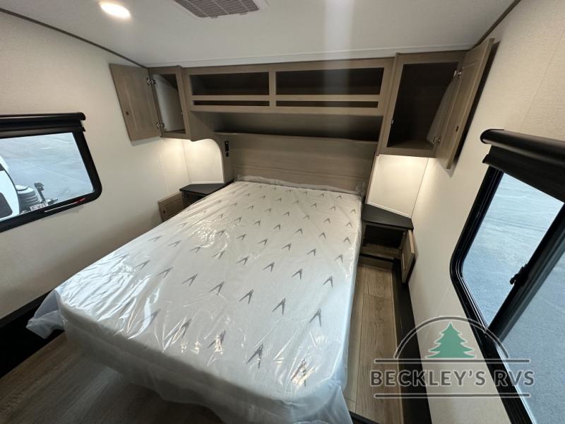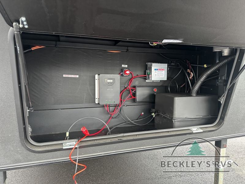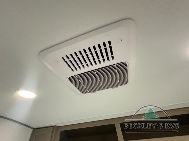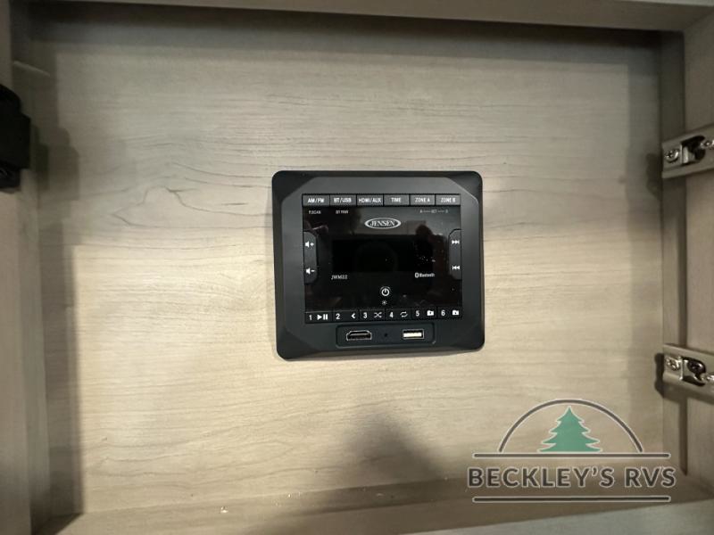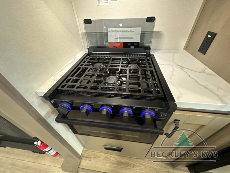 You'll love the amount of space you have in this fifth wheel thanks to the dual opposing slides in the rear living area/kitchen. Your friends and family can relax on the tri-fold sofa or theater seating across from the high-definition 40" LED TV. There is also a booth dinette or you can choose the optional swivel dinette if you prefer that seating. The chef of your group will appreciate having a kitchen island that will provide more counter space, plus there is a hutch with overhead cabinets for nice dishes. A full bath onboard lets you clean up each day and the front private bedroom includes a queen bed just like at home. You'll also love spending time outdoors under the electric awning, and there is an unobstructed pass-thru storage for fishing poles, hiking gear, and camp chairs!