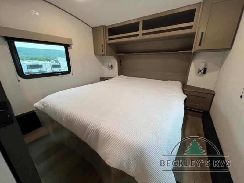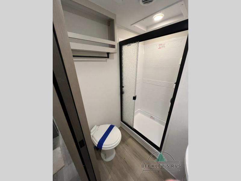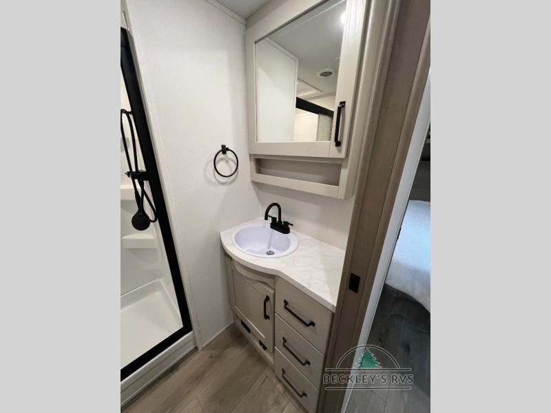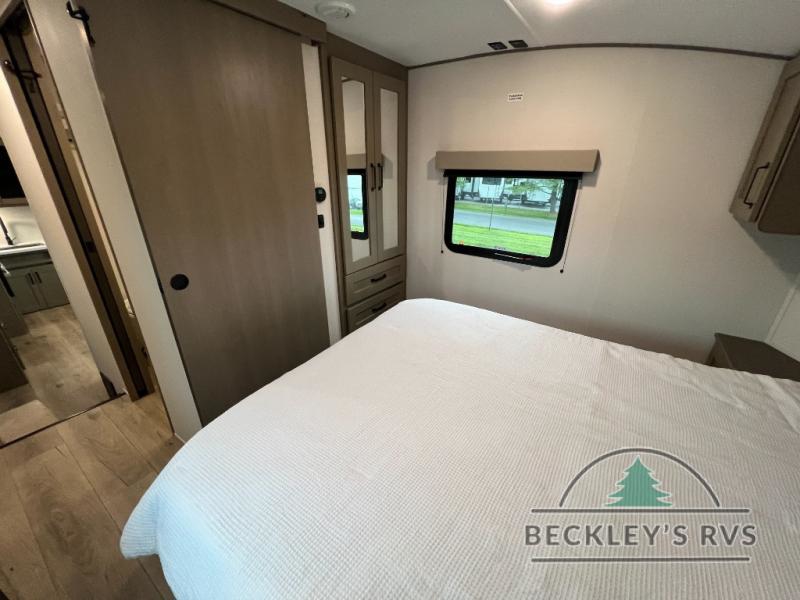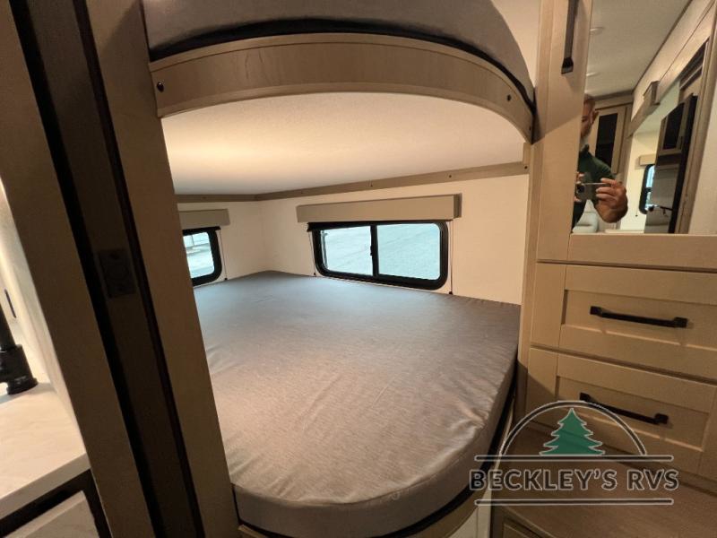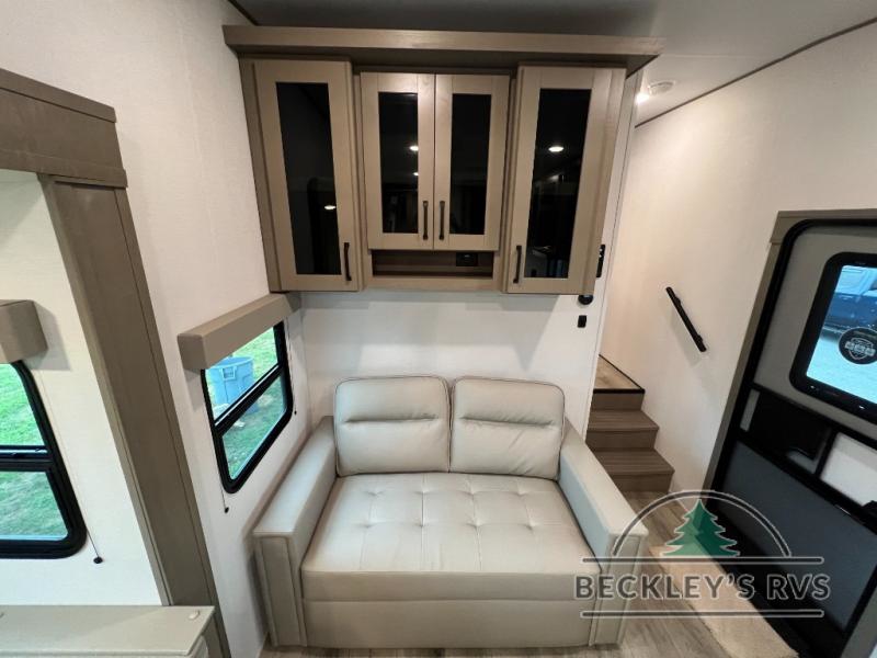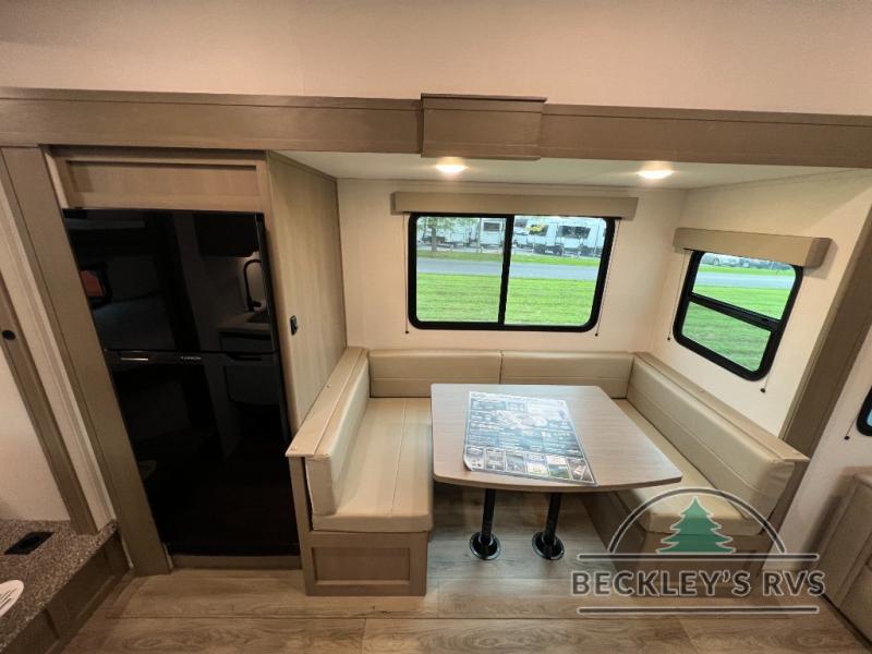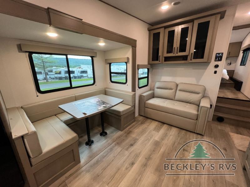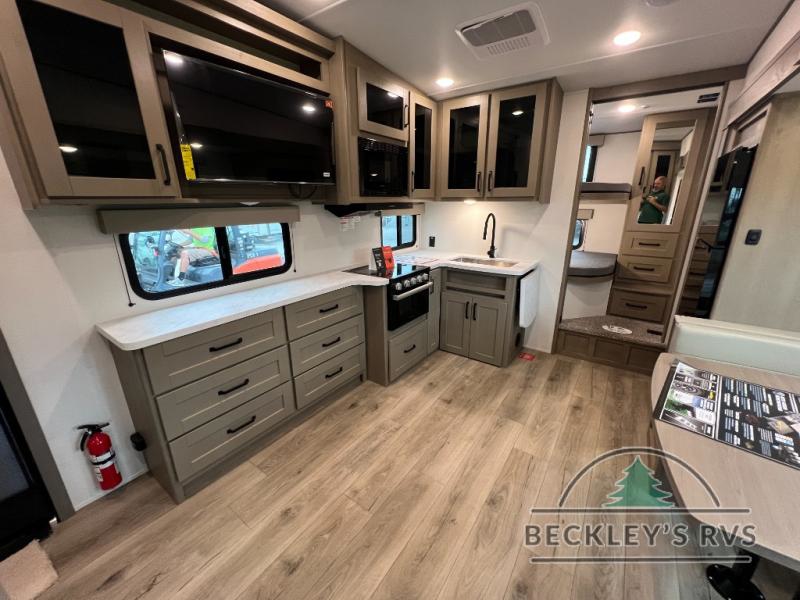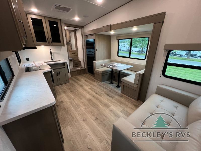 Camping with friends and family just got a whole lot easier in this fifth wheel with double-size bunks and a front private bedroom. Your guests will also have a wardrobe to keep their things tidy, and the bedroom closet will be perfect for your things. If you have other guests stay over, they can sleep on the U-shaped dinette within the slide out or the tri-fold sofa, and there is a 40" high-definition LED TV here to keep everyone entertained on rainy days. Everyone can take turns cleaning up in the full bath that includes a residential walk-in shower, a power vent fan, plus a large vanity top with a deep sink. And you will feel right at home in the front private bedroom with its queen bed, overhead cabinets, and TV prep if you'd like to add a television!