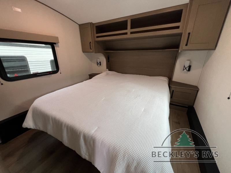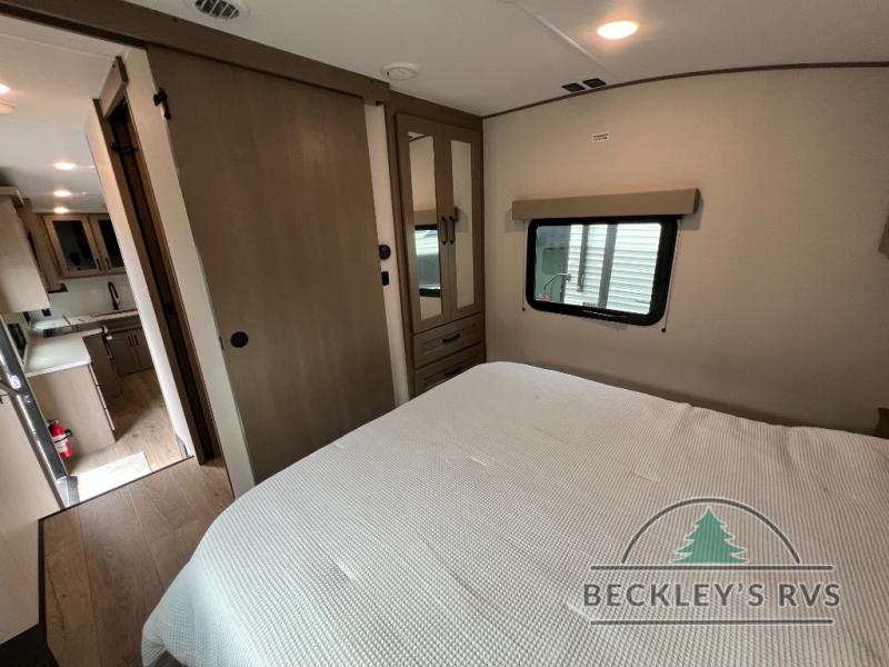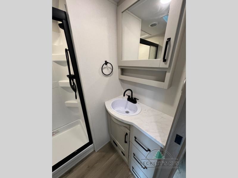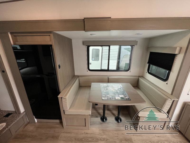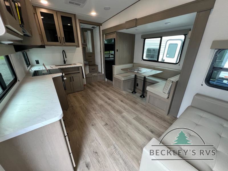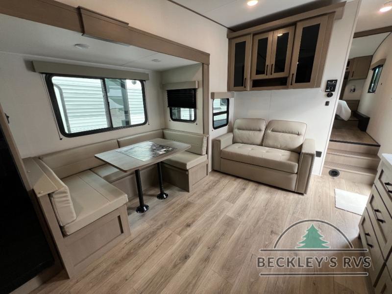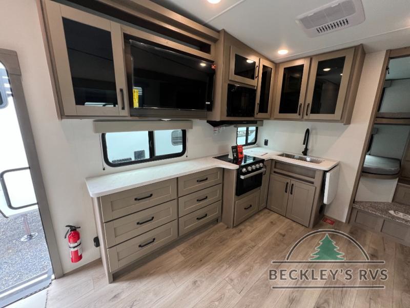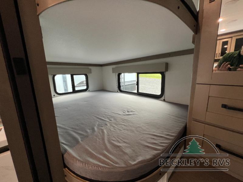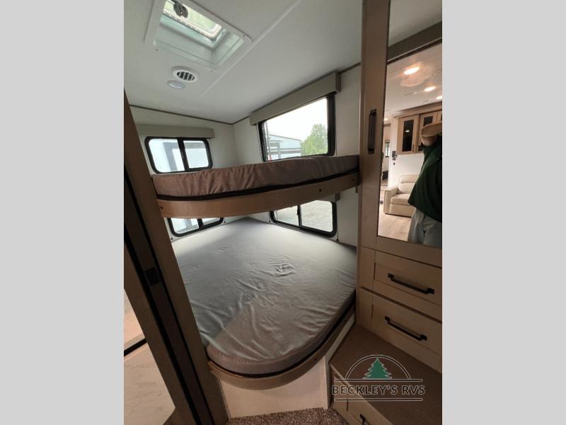 Camping with friends and family just got a whole lot easier in this fifth wheel with double-size bunks and a front private bedroom. Your guests will also have a  wardrobe to keep their things tidy, and the bedroom closet will be perfect for your things. If you have other guests stay over, they can sleep on the U-shaped dinette within the slide out or the tri-fold sofa, and there is a 40" high-definition LED TV here to keep everyone entertained on rainy days. Everyone can take turns cleaning up in the full bath that includes a residential walk-in shower, a power vent fan, plus a large vanity top with a deep sink. And you will feel right at home in the front private bedroom with its queen bed, overhead cabinets, and TV prep if you'd like to add a television!